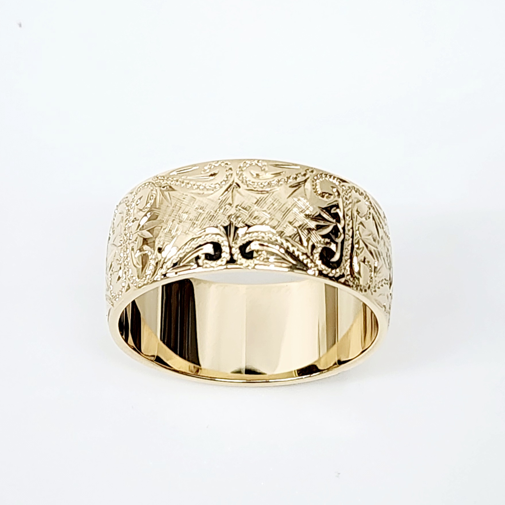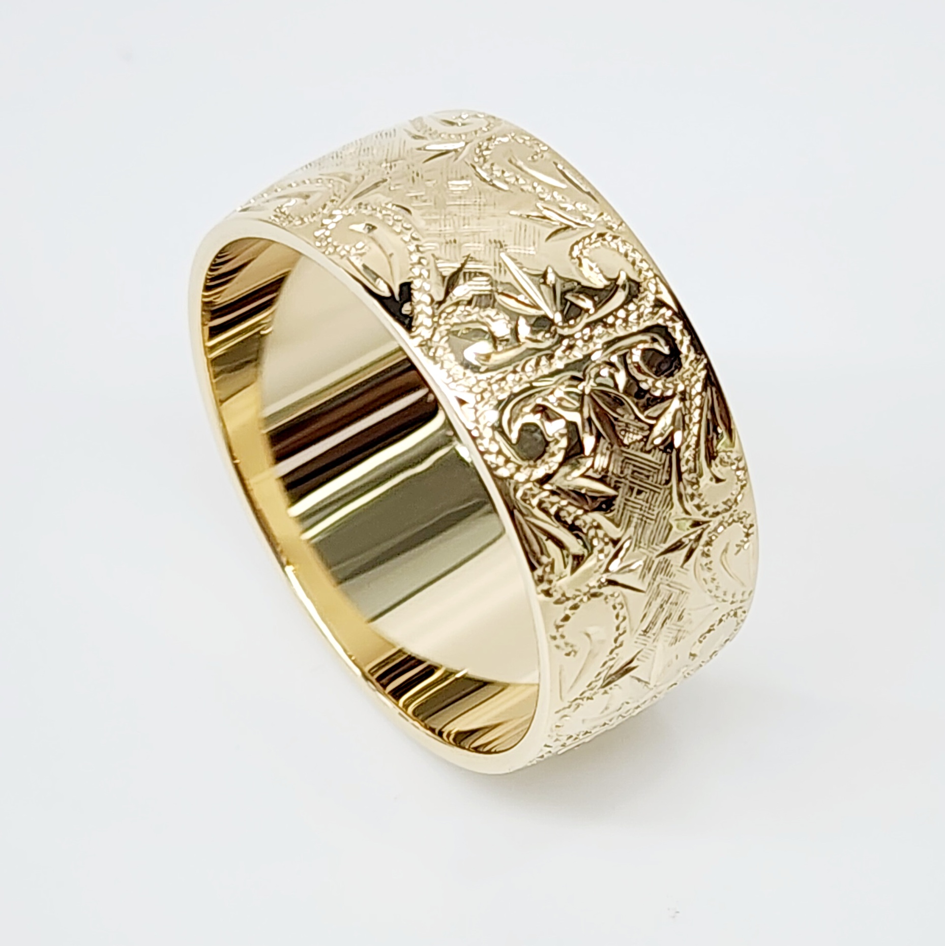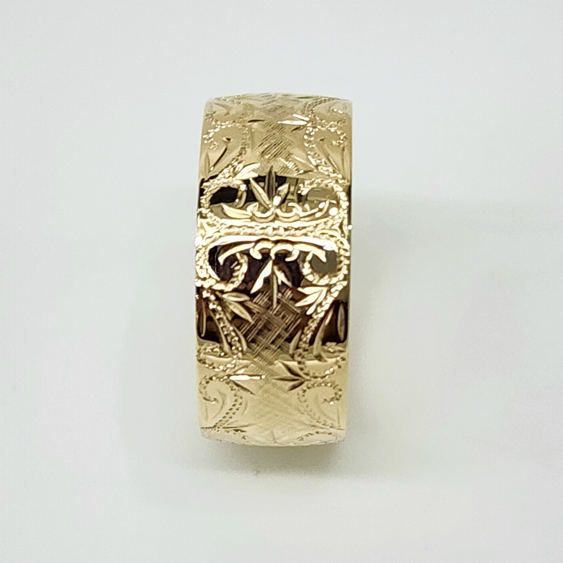 10mm Wide Hand Engraved Around Ring 9ct Yellow Gold Ring