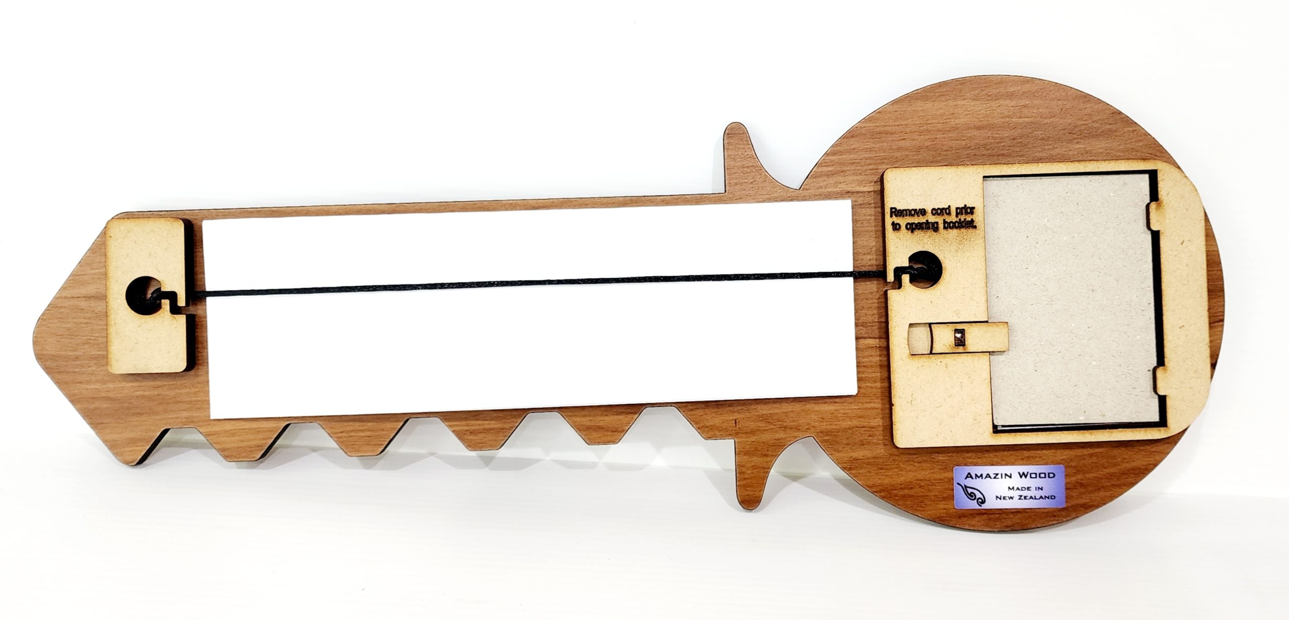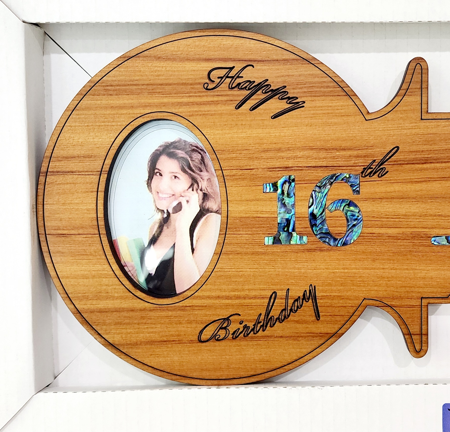 This 16th Key is made out of Rimu Veneer and Paua inlays. This 16th Key comes with a presentation box with a clear top and a Pen for signatures and messages at back. There is ?Happy Birthday? which is laser engraved and ?16? Paua Inlay near the photo.