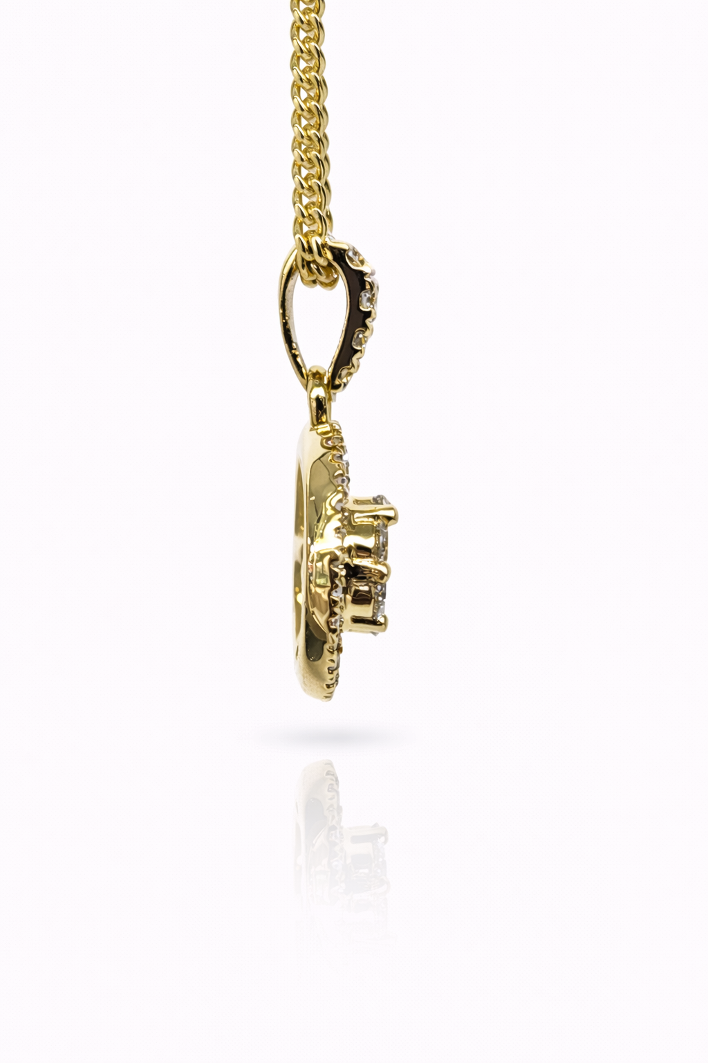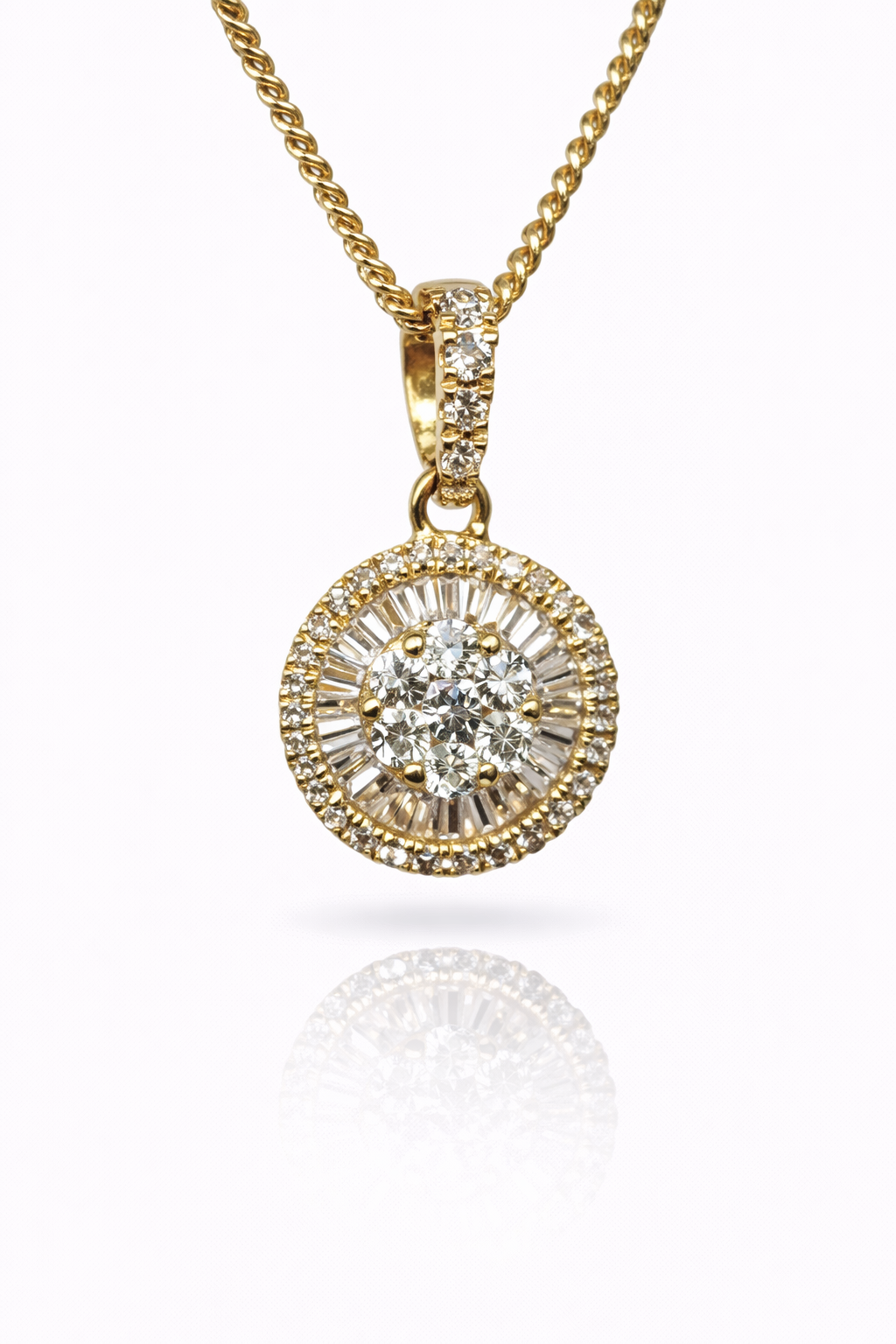Add timeless sparkle to your everyday look with this elegant 18ct yellow gold natural diamond pendant. Designed in a classic round silhouette, the centre features a shimmering cluster of round brilliant-cut diamonds, beautifully framed by a striking baguette-cut diamond halo that creates a radiant “sunburst” effect.