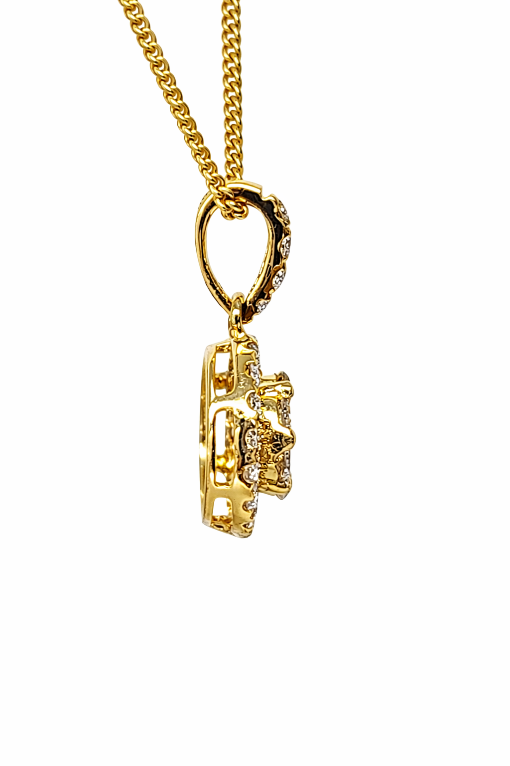 At the centre, a clustered diamond design is surrounded by a delicate halo of round diamonds, creating depth, sparkle, and a striking visual presence. Enhancing the overall elegance, the bale is also diamond-set, allowing the sparkle to continue seamlessly from pendant to chain.