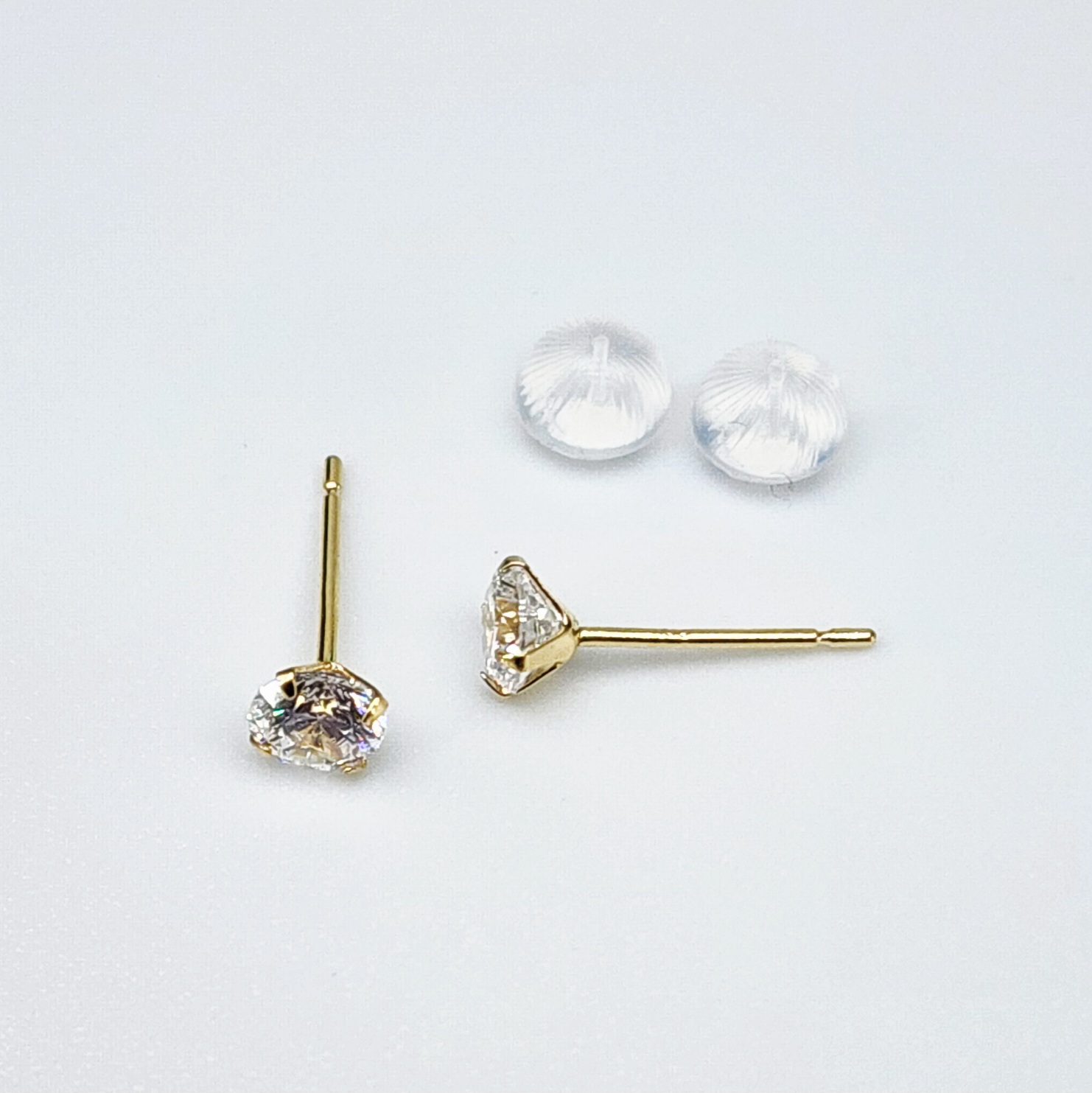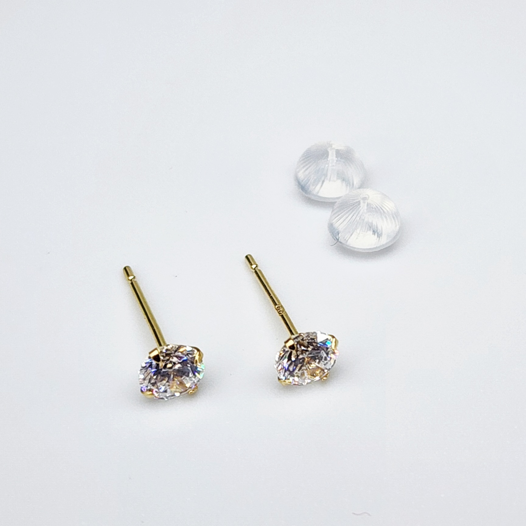 Crafted in luxurious 18ct yellow gold, these classic stud earrings feature a sparkling 5mm round cubic zirconia securely held in a four-claw setting for maximum brilliance. Each earring is fitted with premium 18ct gold butterfly backings, enhanced with silicone covers for added comfort and extra security—perfect for worry-free, all-day wear.