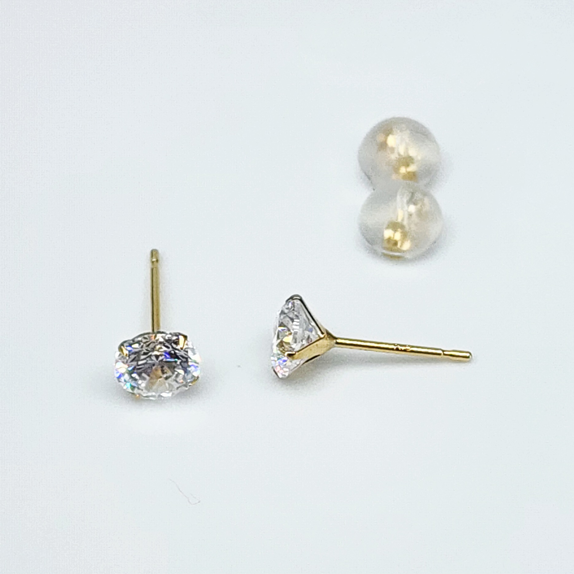 Crafted in luxurious 18ct yellow gold, these classic stud earrings feature a sparkling 5mm round cubic zirconia securely held in a four-claw setting for maximum brilliance. Each earring is fitted with premium 18ct gold butterfly backings, enhanced with silicone covers for added comfort and extra security—perfect for worry-free, all-day wear.
