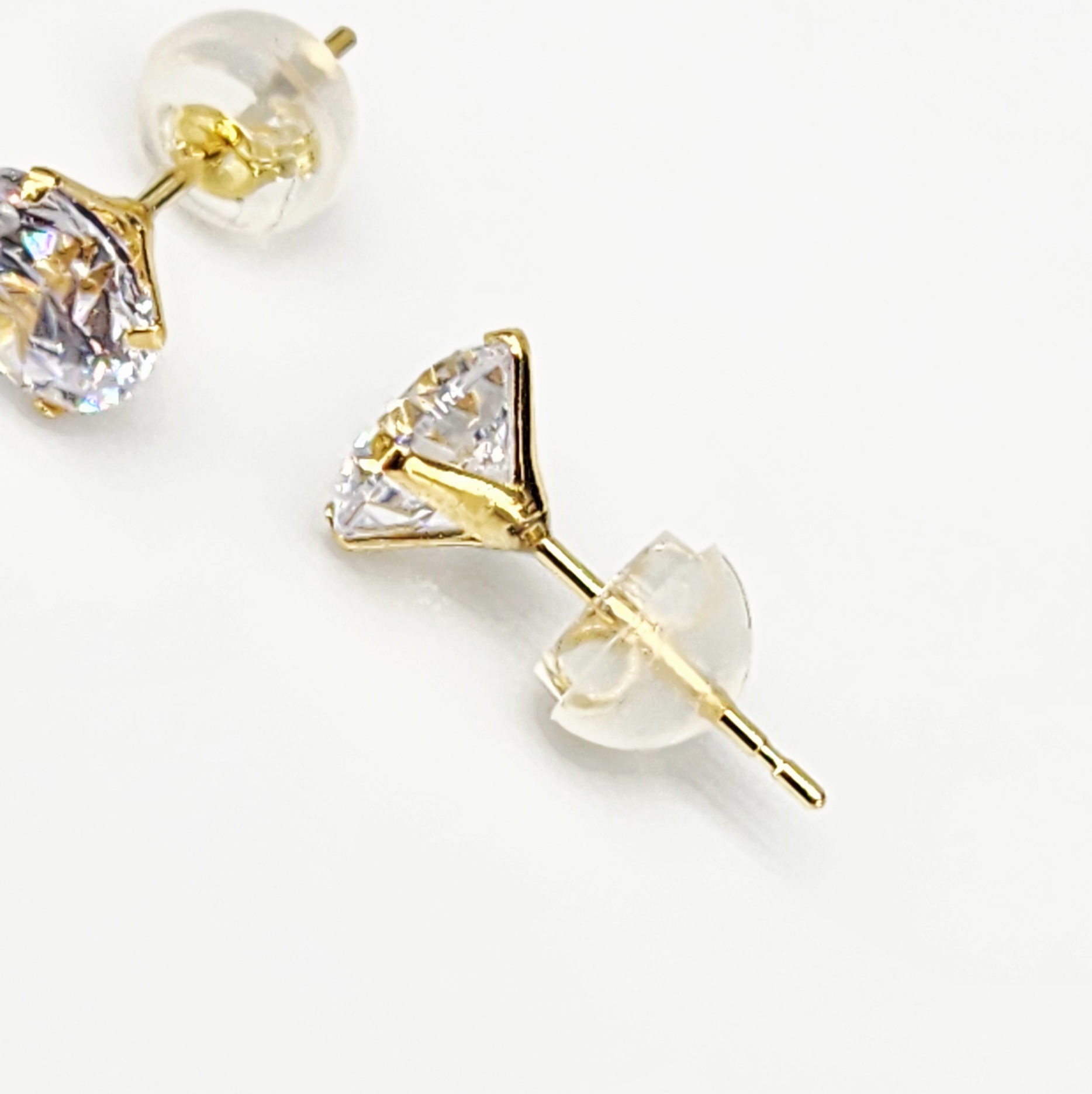 Crafted in luxurious 18ct yellow gold, these classic stud earrings feature a sparkling 5mm round cubic zirconia securely held in a four-claw setting for maximum brilliance. Each earring is fitted with premium 18ct gold butterfly backings, enhanced with silicone covers for added comfort and extra security—perfect for worry-free, all-day wear.