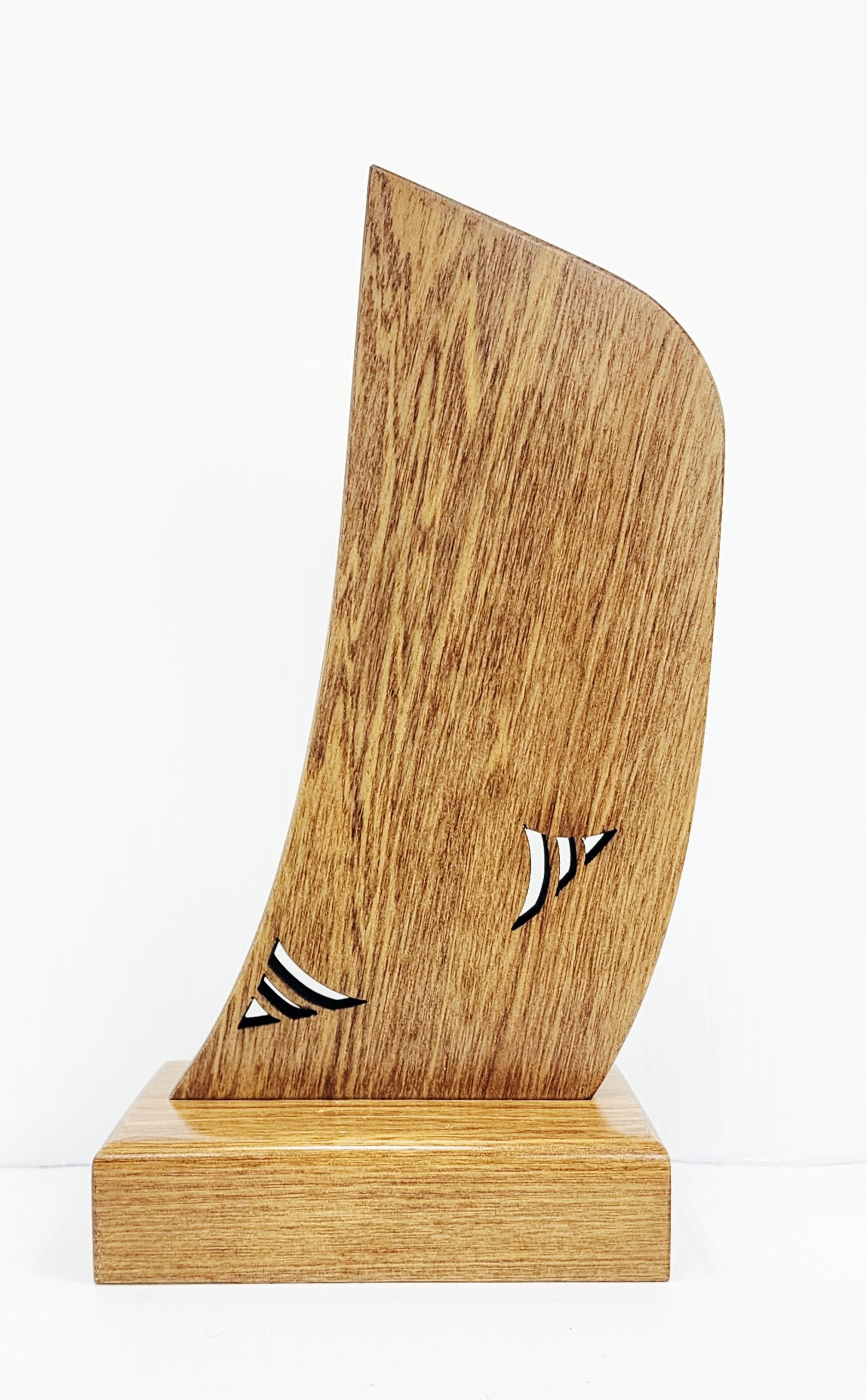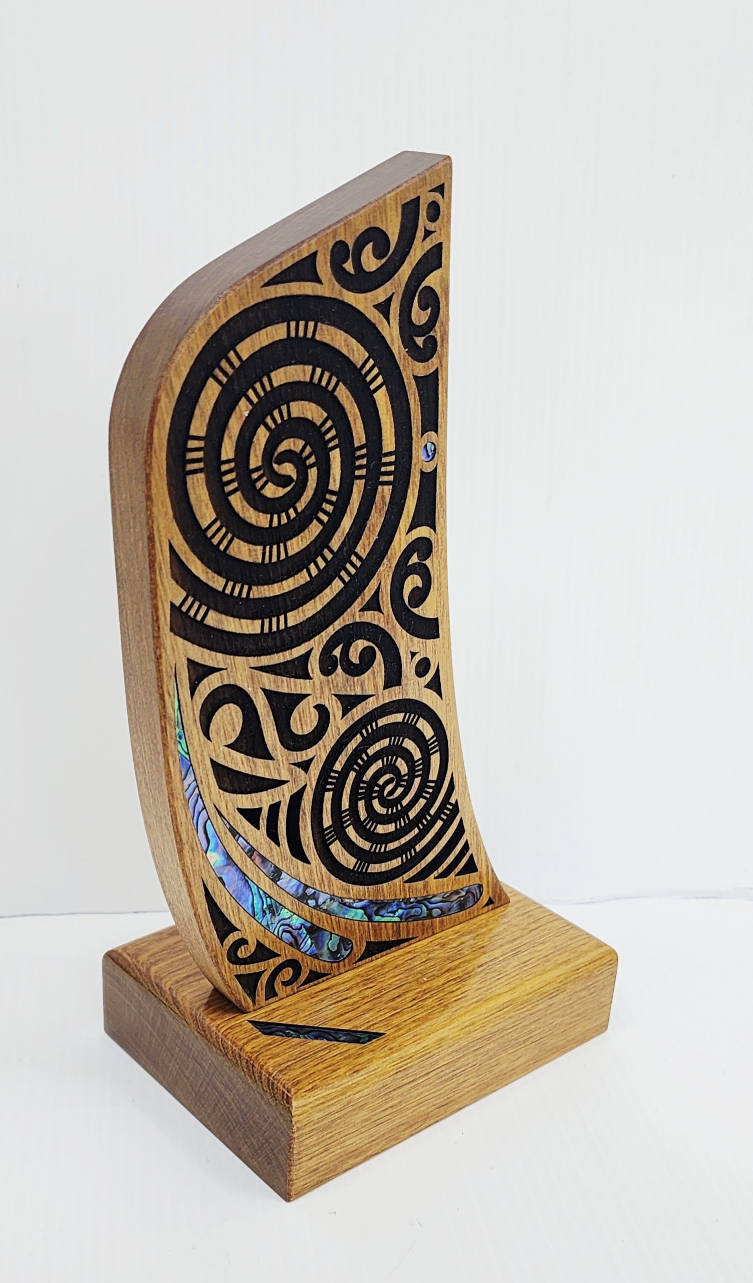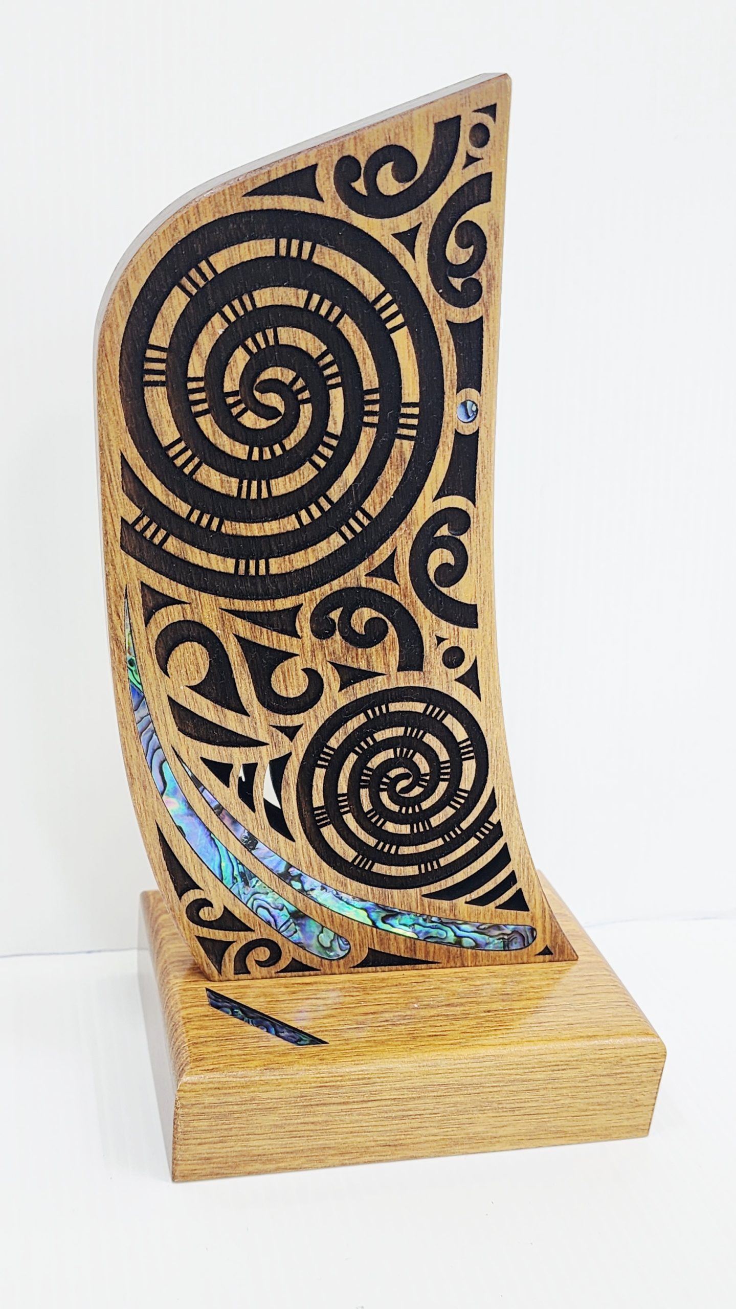 Made out of solid wood and mounted on a wooden base with paua shell inlay.