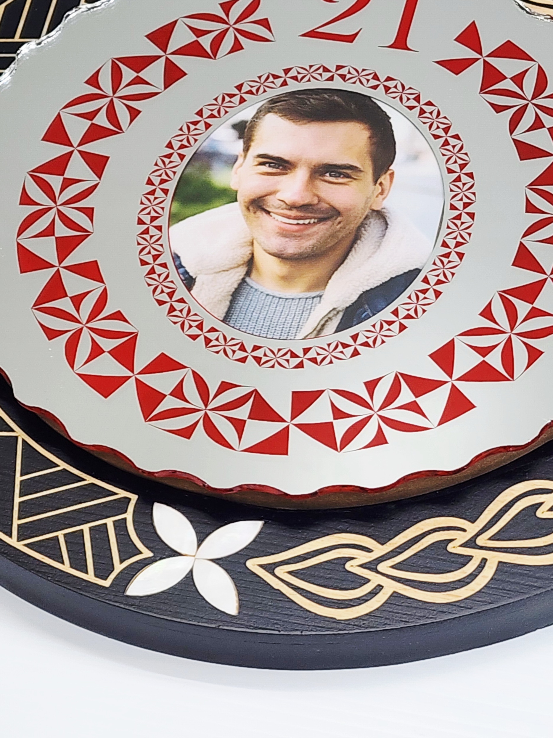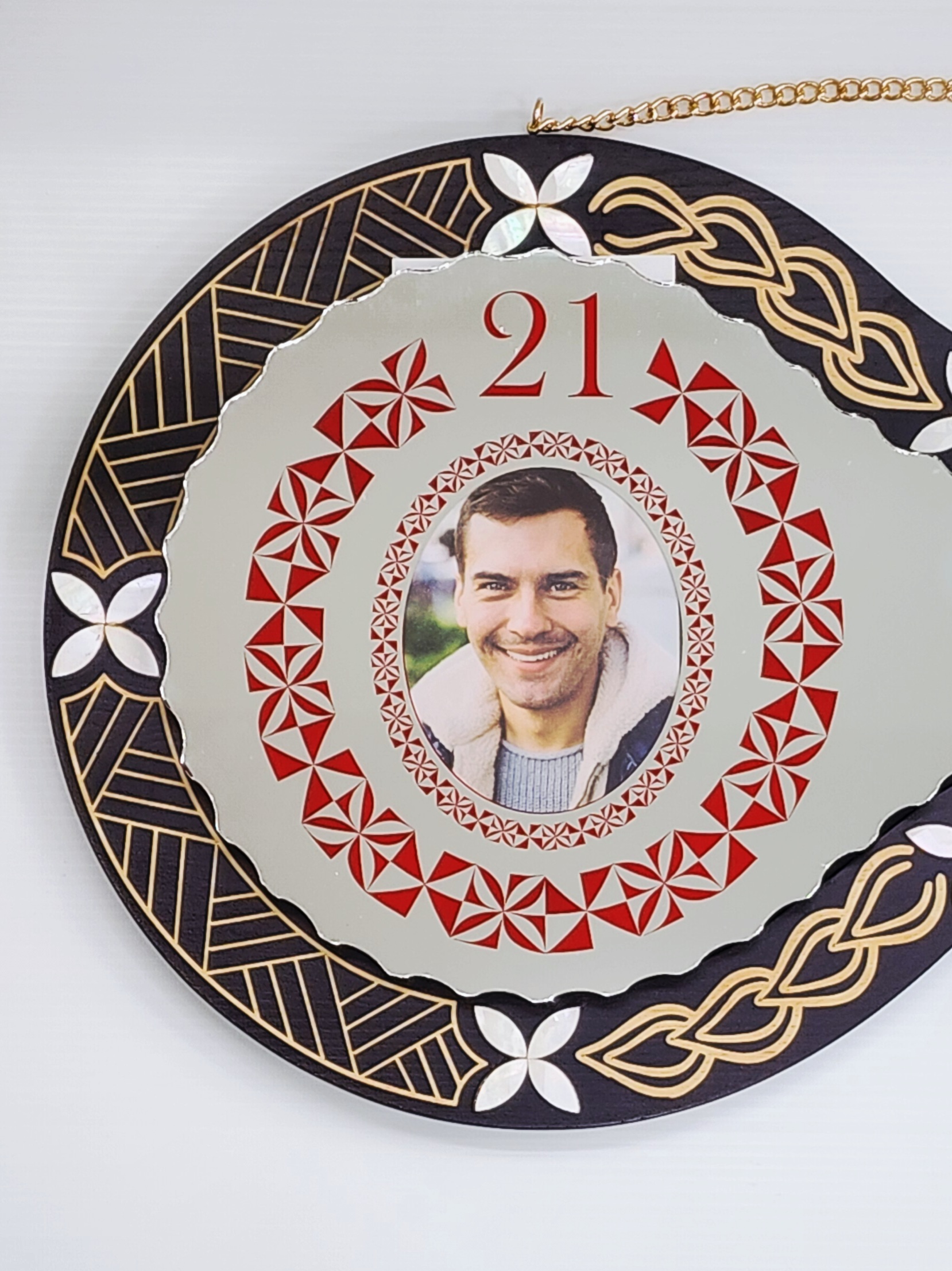 To the left of the mirror insert, there is an oval photo slot, beautifully framed with red Tongan patterns and the number “21” printed above it — making it ideal for commemorating a 21st birthday.