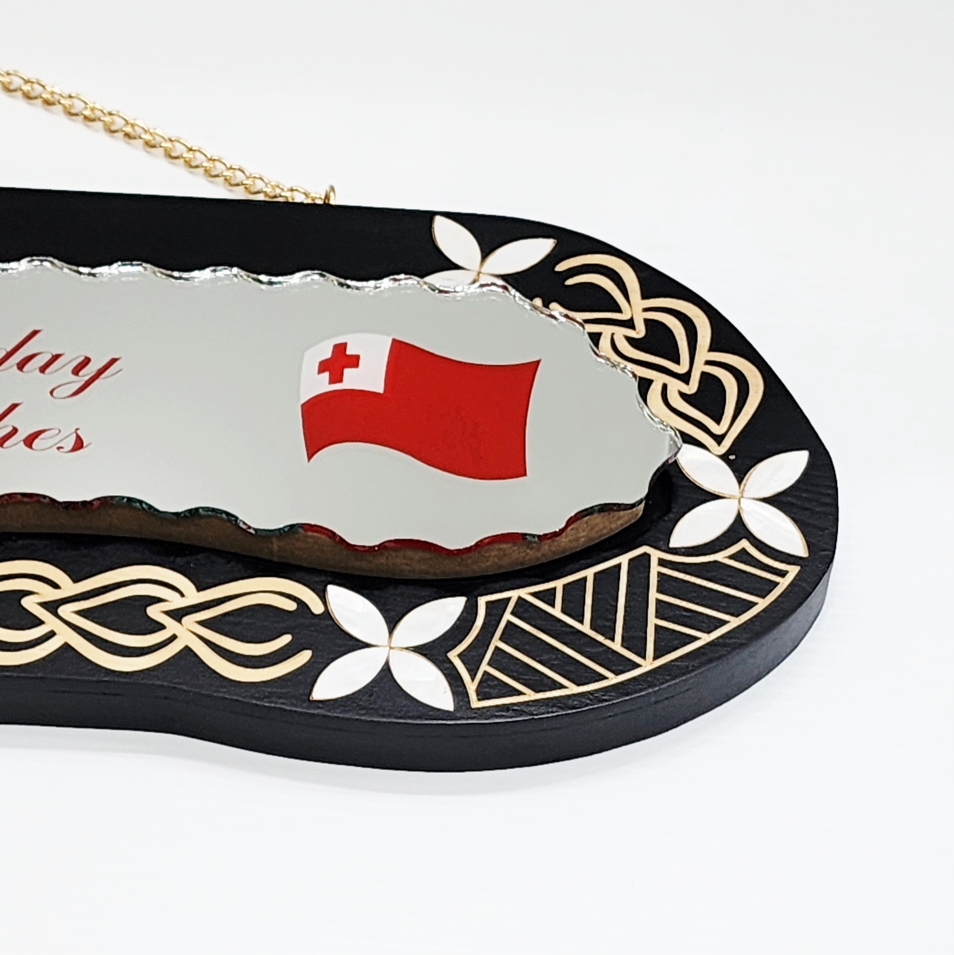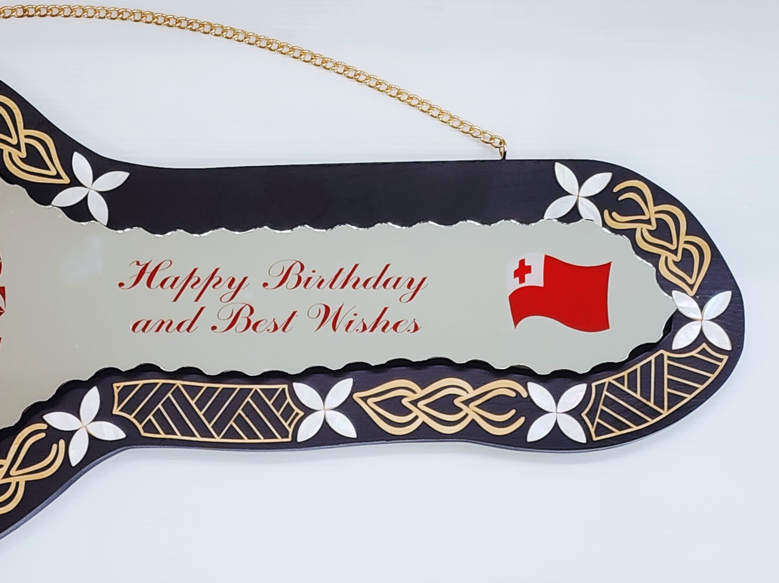 Celebrate a special milestone with this uniquely crafted wooden birthday key, featuring rich black shading and elegant cultural details. The centrepiece is a mirror insert decorated with traditional Tongan designs. On the right-hand side of the mirror, the message “Happy Birthday and Best Wishes!” is printed in bold red, alongside the Tongan flag, symbolising cultural pride and celebration.