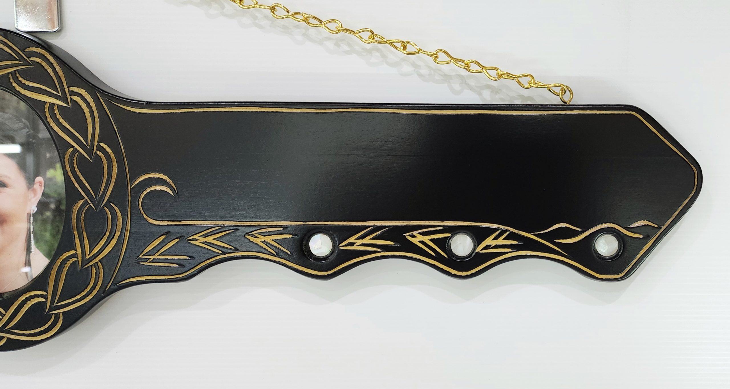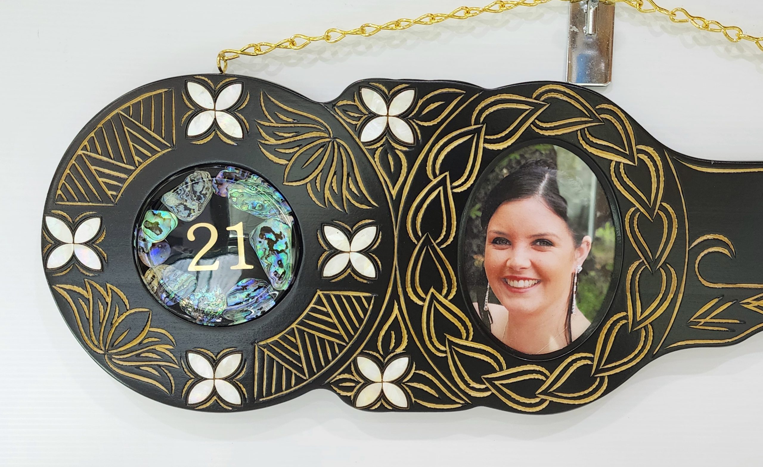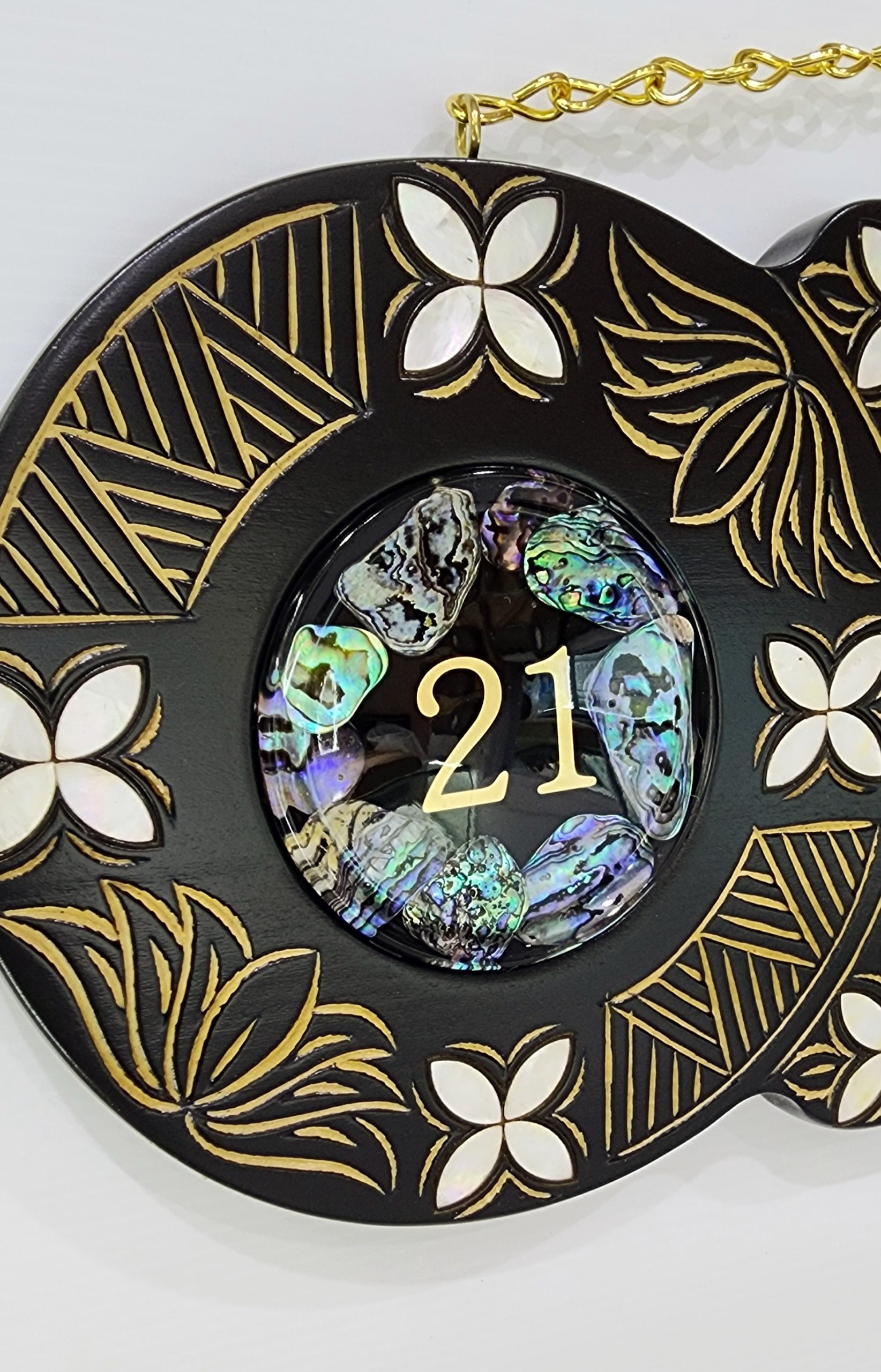 21st Hand Carved Island Design Key with 21 Paua Shell Disc Insert