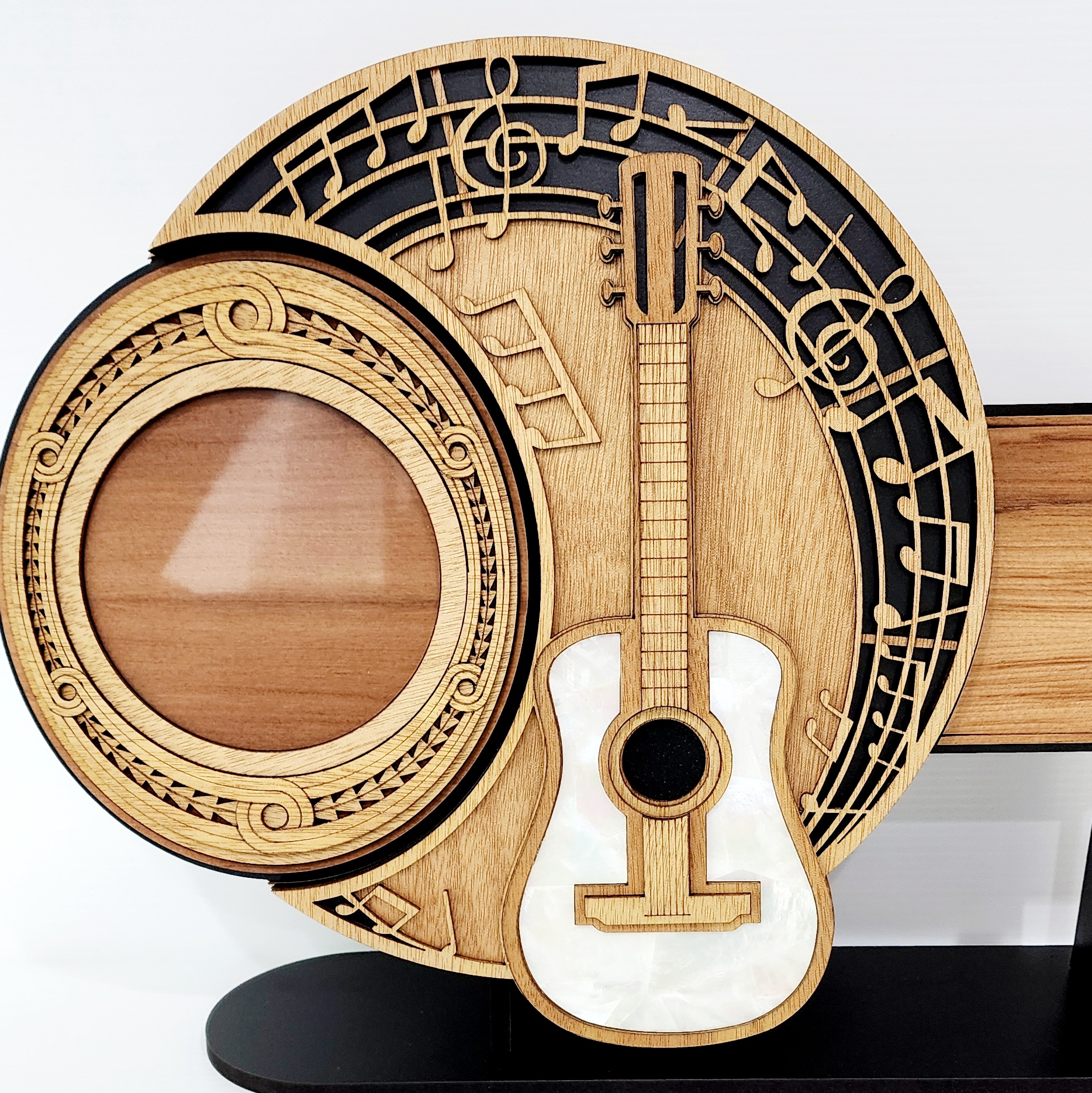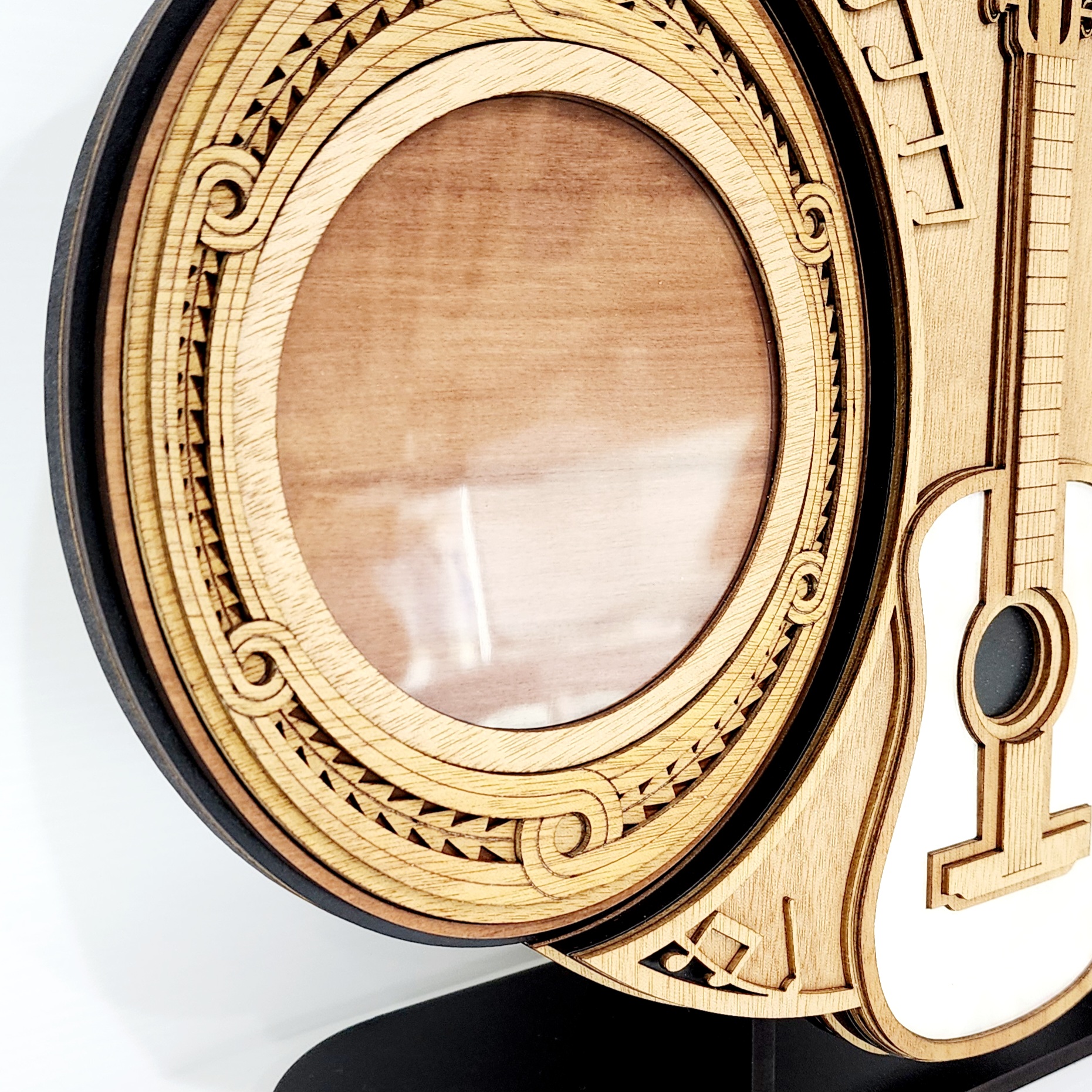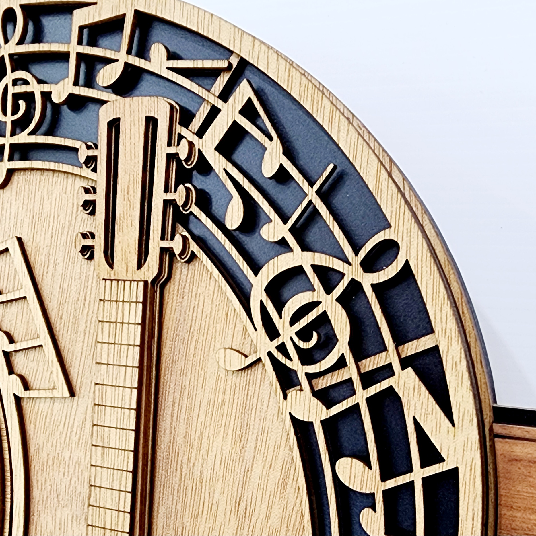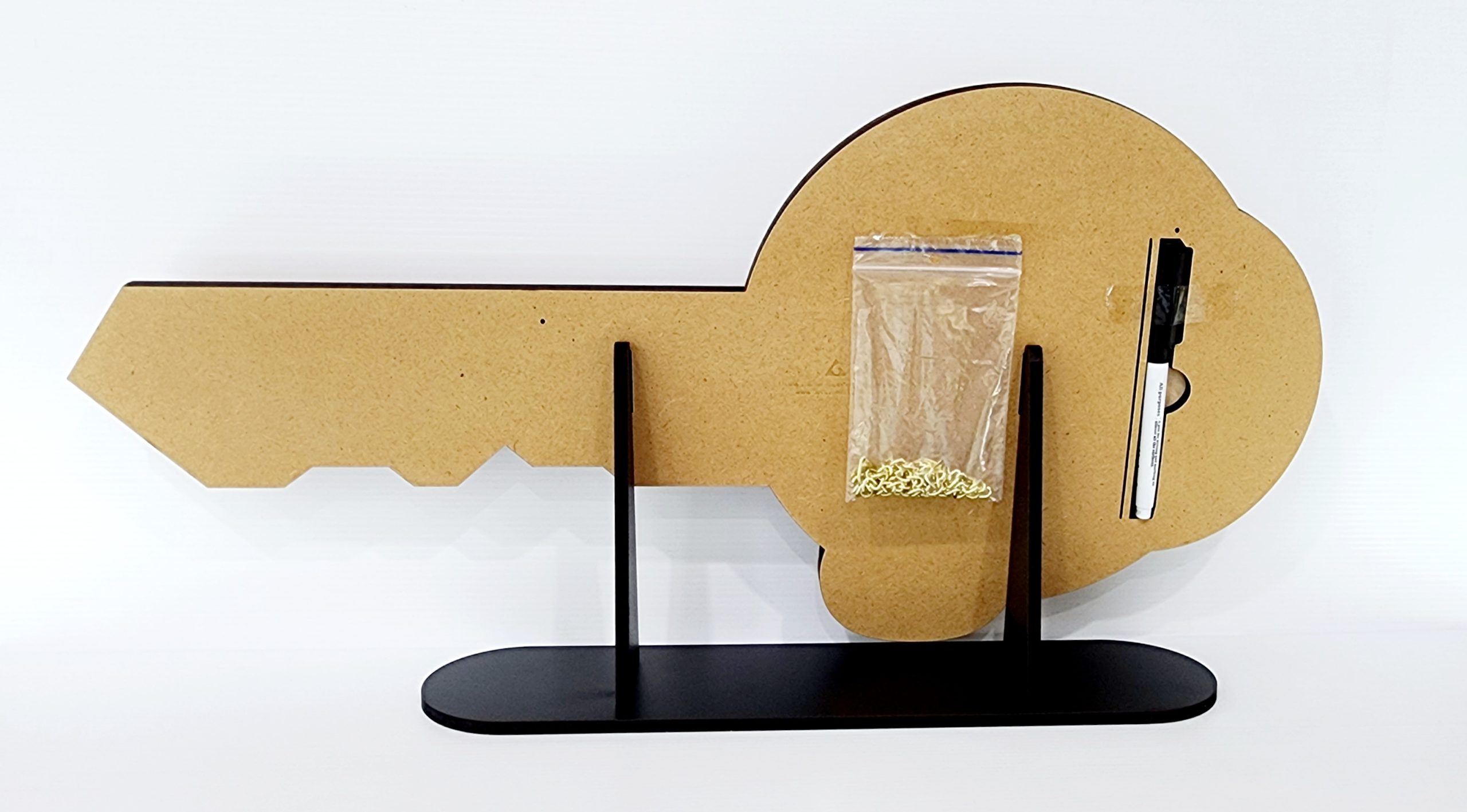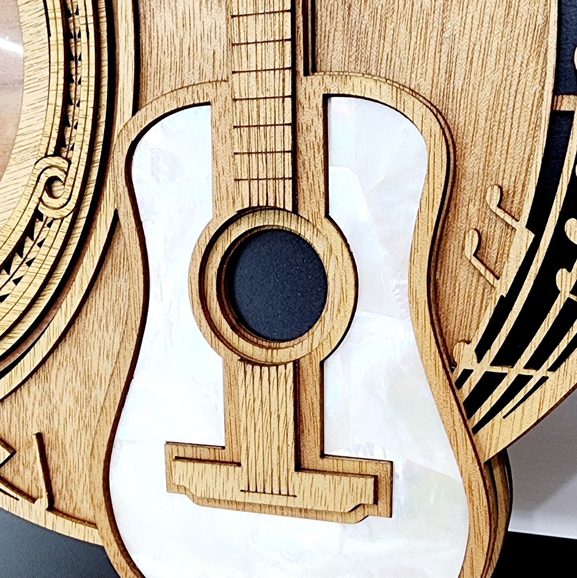 This artwork has a contemporary musical theme. The key is crafted from recycled Native New Zealand Rimu veneerboard, medium density fibreboard (mdf), Gaboon veneer plywood and embellished with NZ Paua shell.