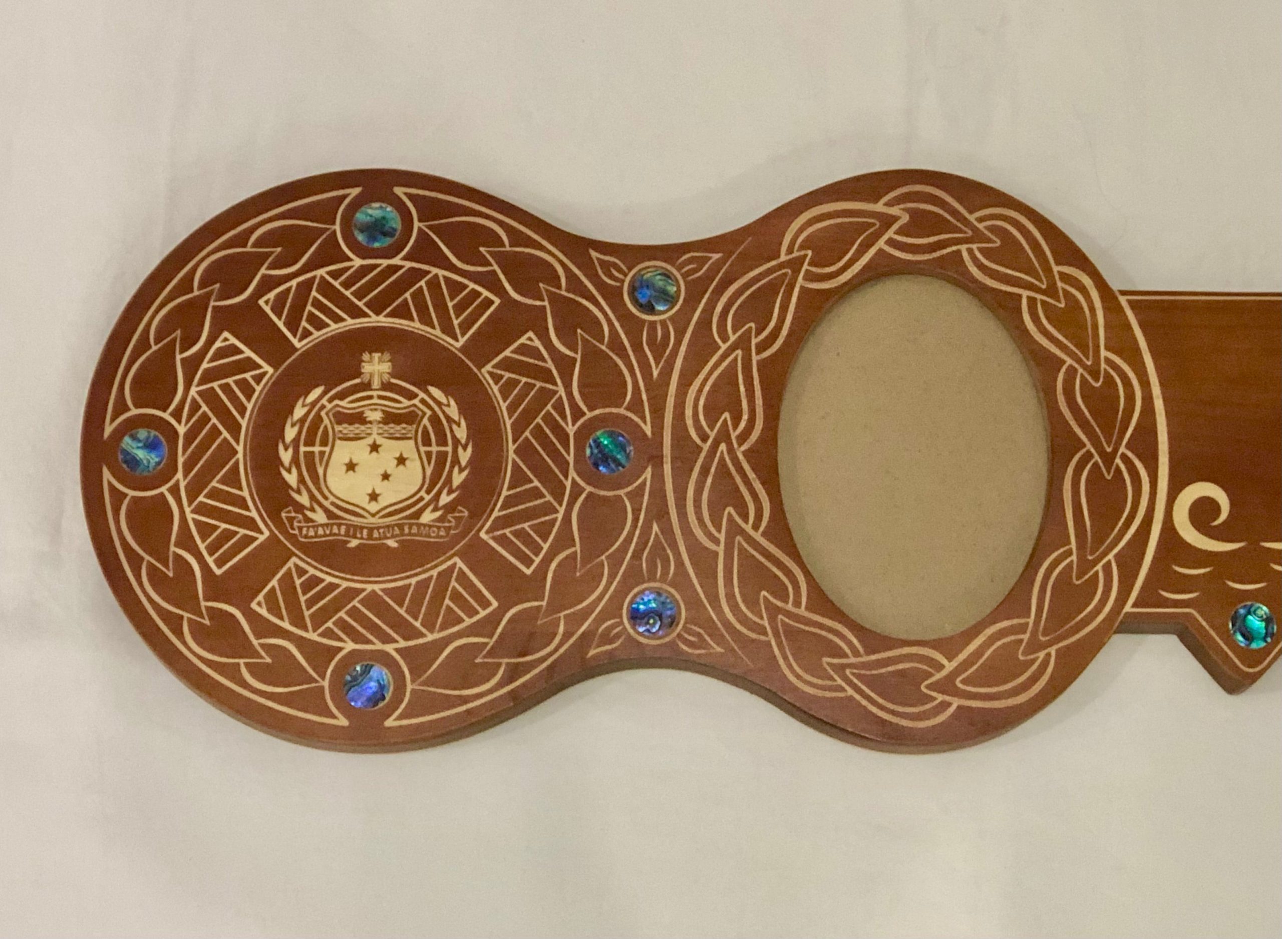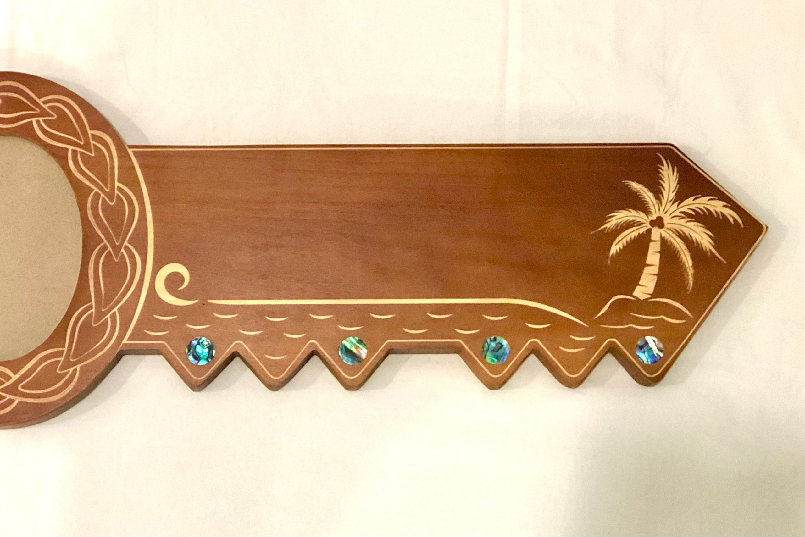 The key has got?Samoan Sila?in the middle of the circle on the far left with 10x 15mm round?Paua shell disk inlay around the key. There is also a palm tree laser? engraved on the right handside of the key
