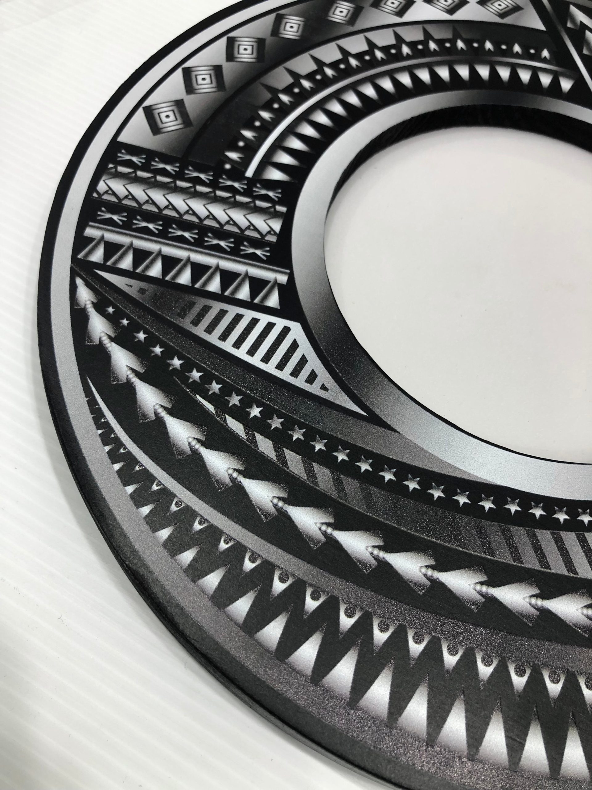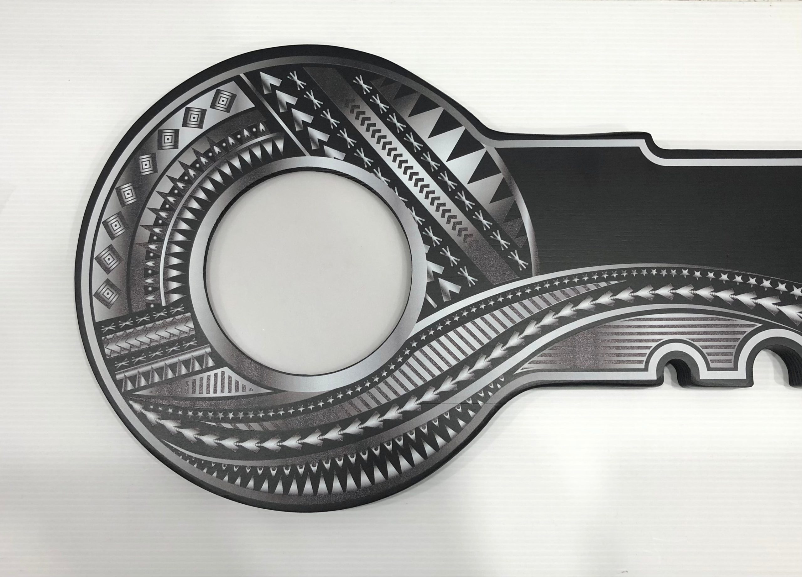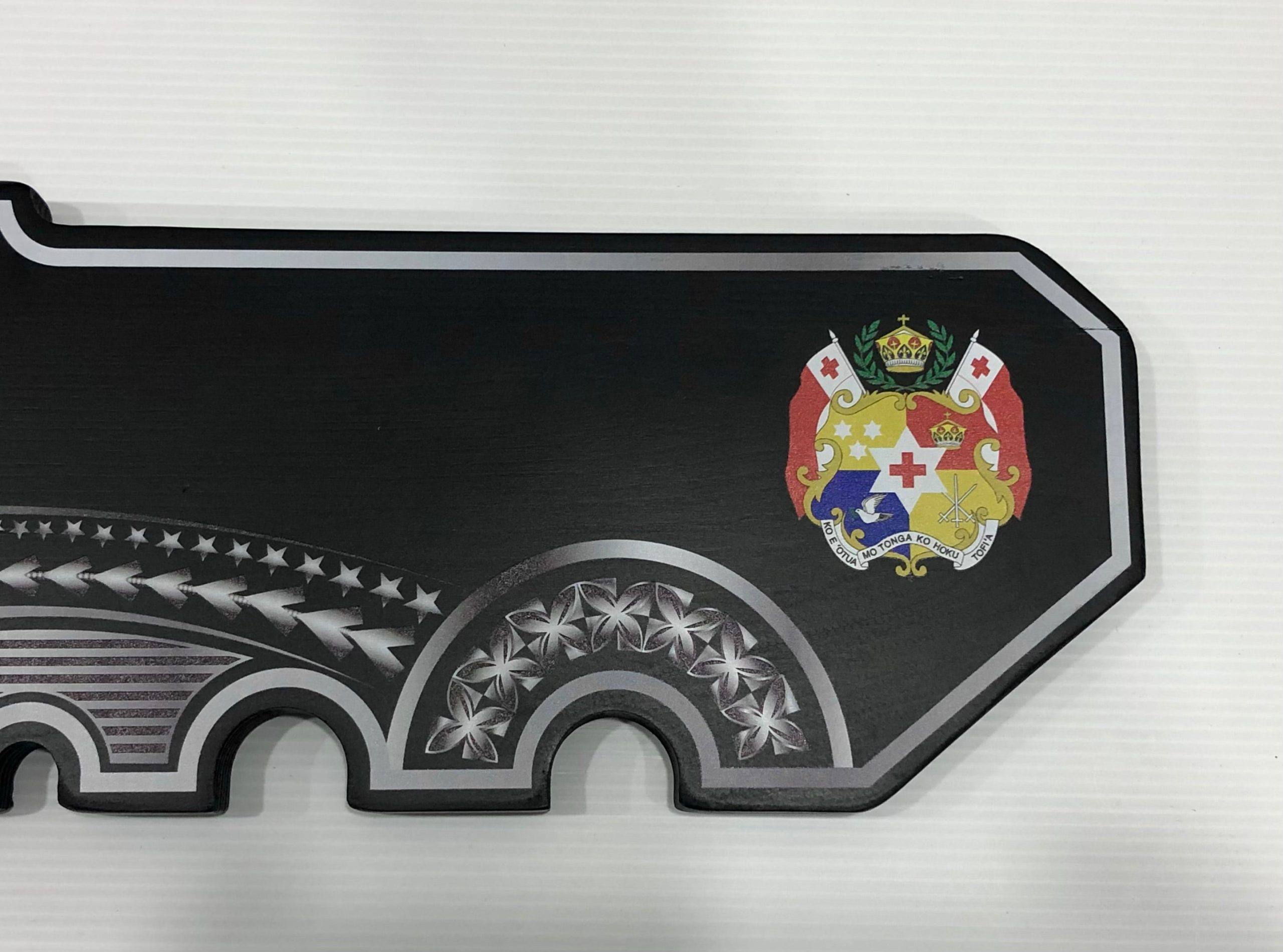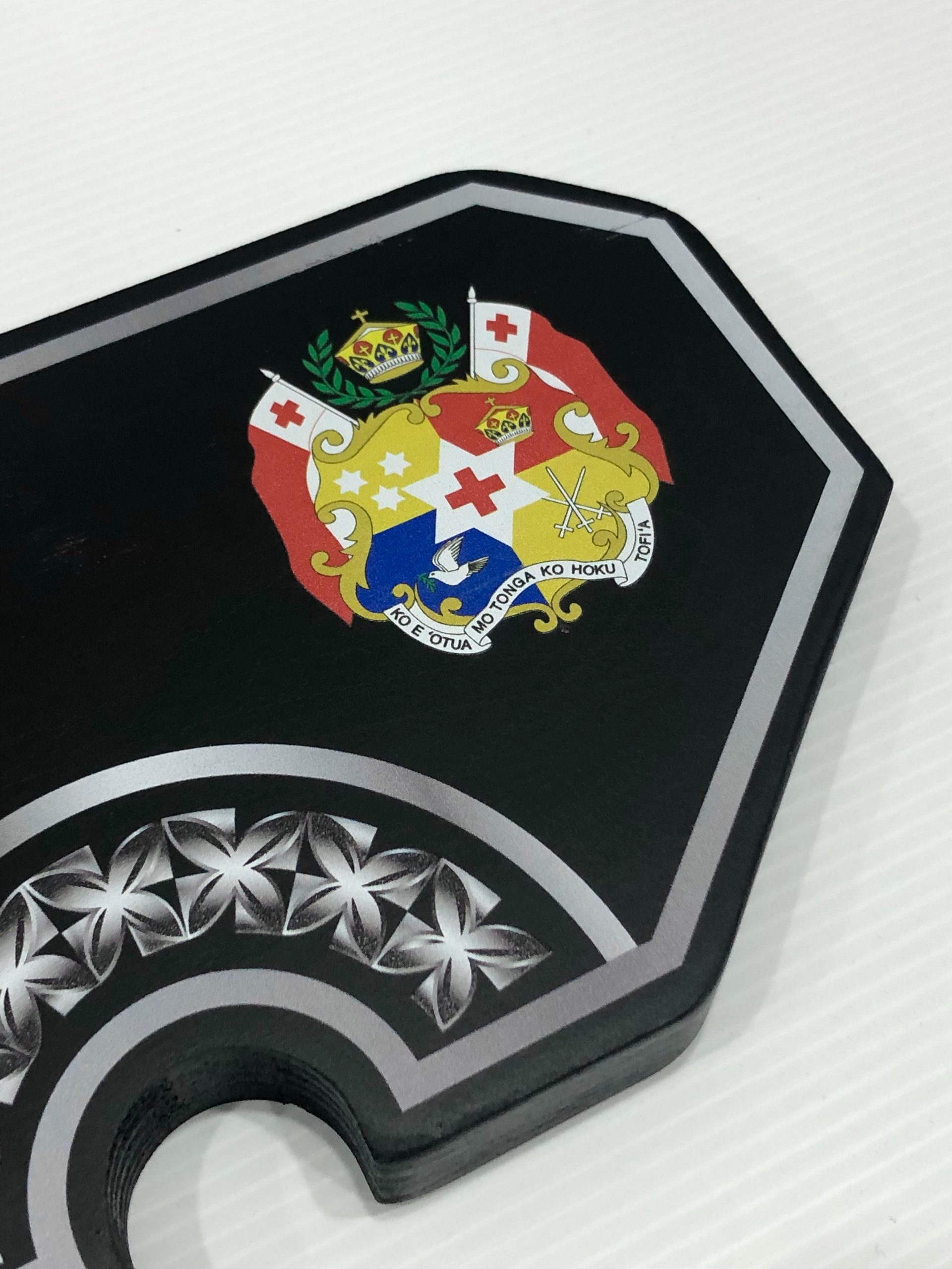 This birthday?key is made out of solid timber with black base colour. On top of the black colour there is White & Grey UV printed island patterns and full colour Tongan Sila on the right handside of the key.