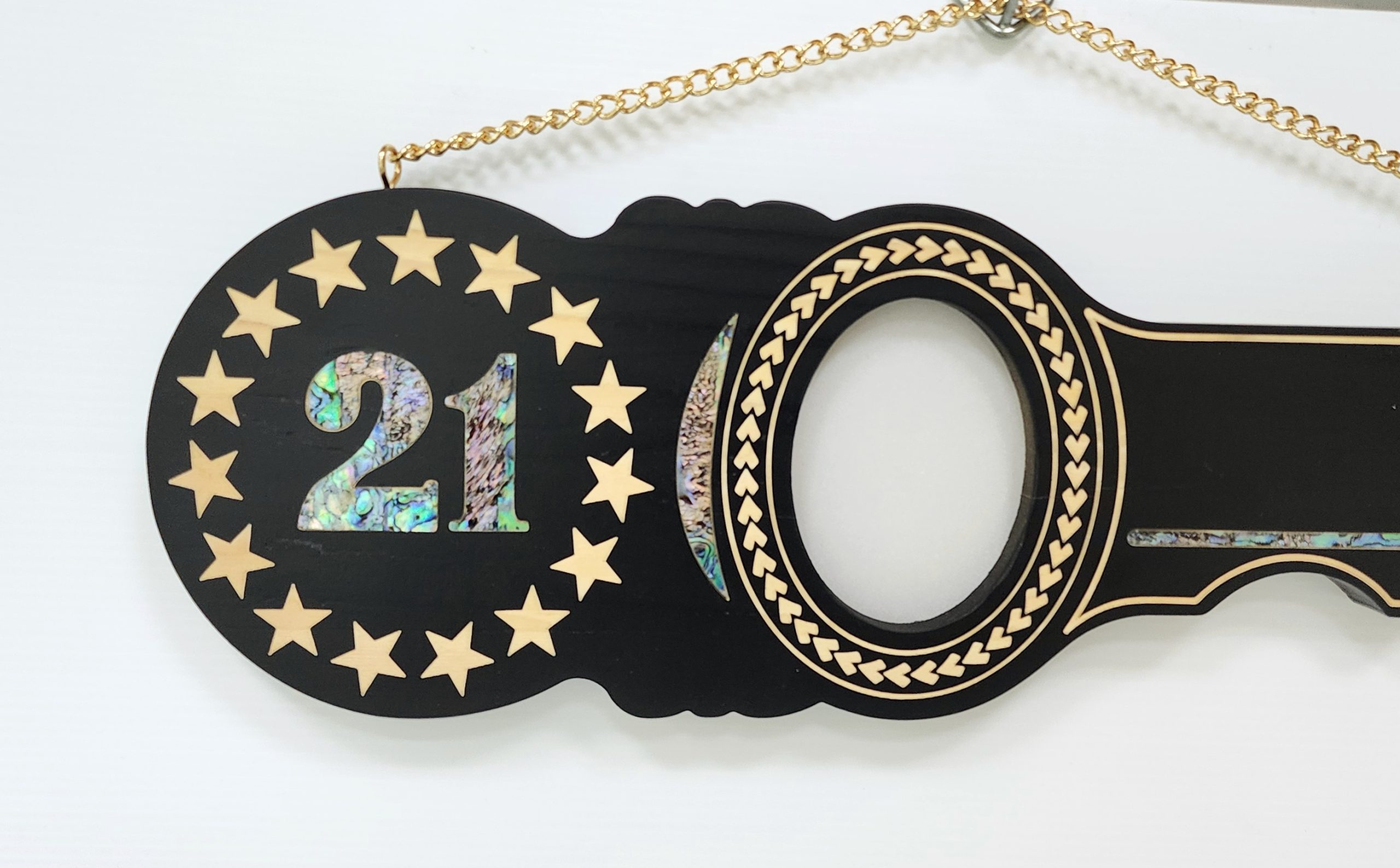 This 21st birthday wooden key is finished in a sleek black coating and adorned with detailed laser-engraved island patterns, making it a standout and meaningful keepsake. On the far left, 15 stars are finely laser engraved, with a striking paua shell inlay forming the number “21” at the center of the star cluster. A paua shell inlay strip runs gracefully along the lower section of the right-hand shaft of the key. Another elegant paua strip accents the area beneath the custom engraving space and continues seamlessly between the photo frame section, adding a beautiful touch of island artistry throughout the design.
