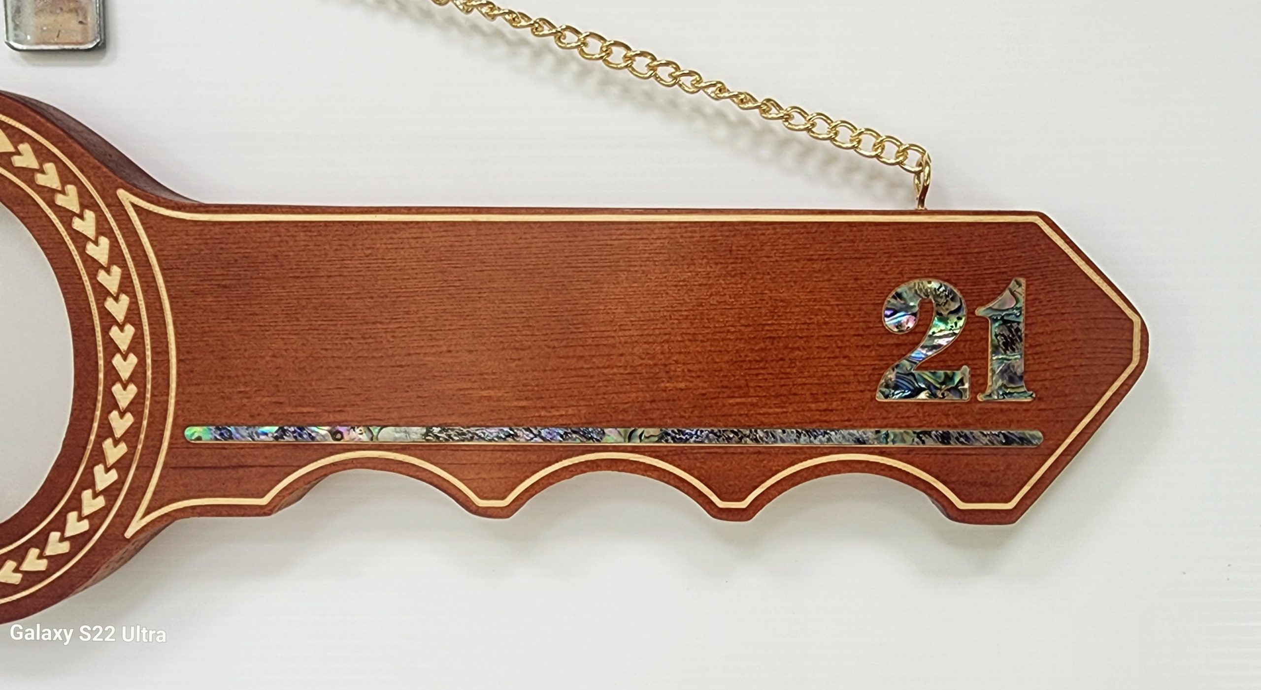 The far right side is adorned with 21 shimmering paua shell inlays, each meticulously set to enhance its aesthetic appeal. Measuring an impressive 50cm in length, 14cm in width, and 2cm in thickness, the key is a substantial and eye-catching piece. It includes an oval-shaped space measuring 65mm x 90mm, perfect for inserting a cherished photograph to personalize the gift.