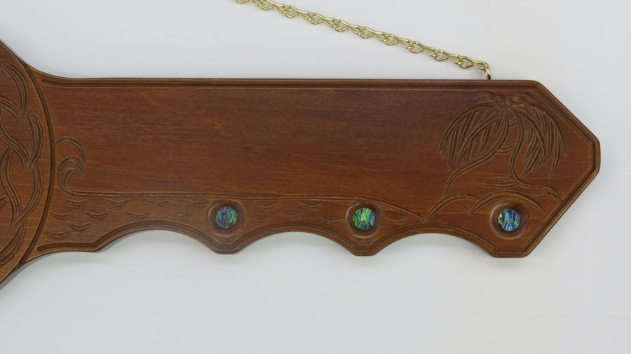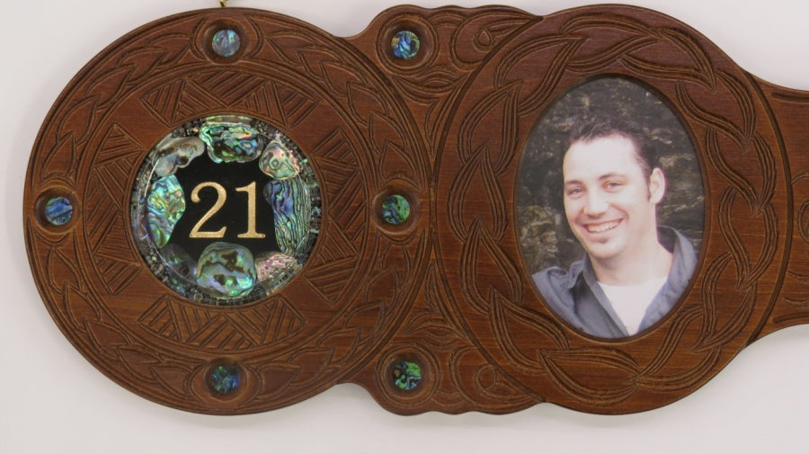 Wooden Carved 21st key Island design with 21st Paua disc insert and 9 paua eyes insert around the key.