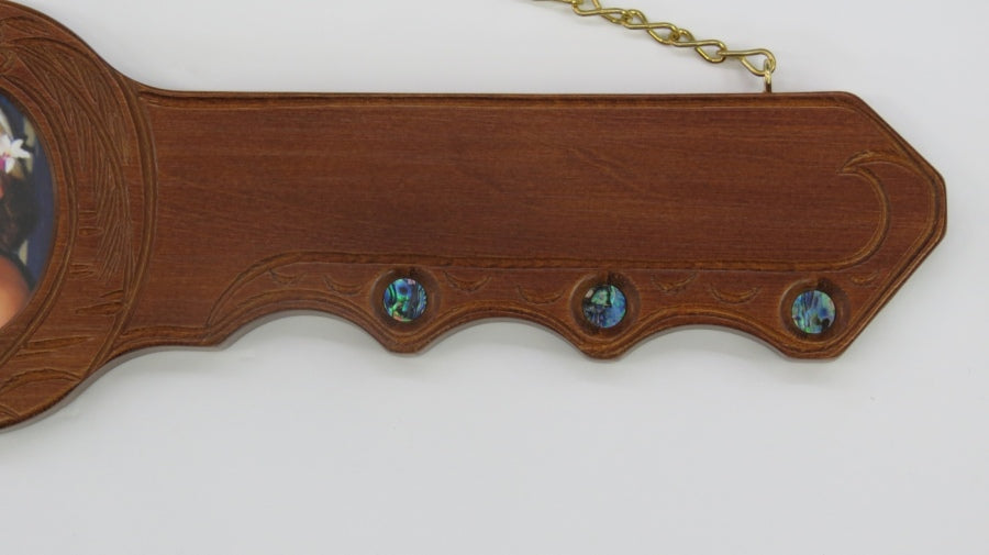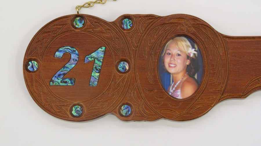 Wooden Carved 21st key Island design with 21 Paua inlaid and 9 paua eyes insert around the key.