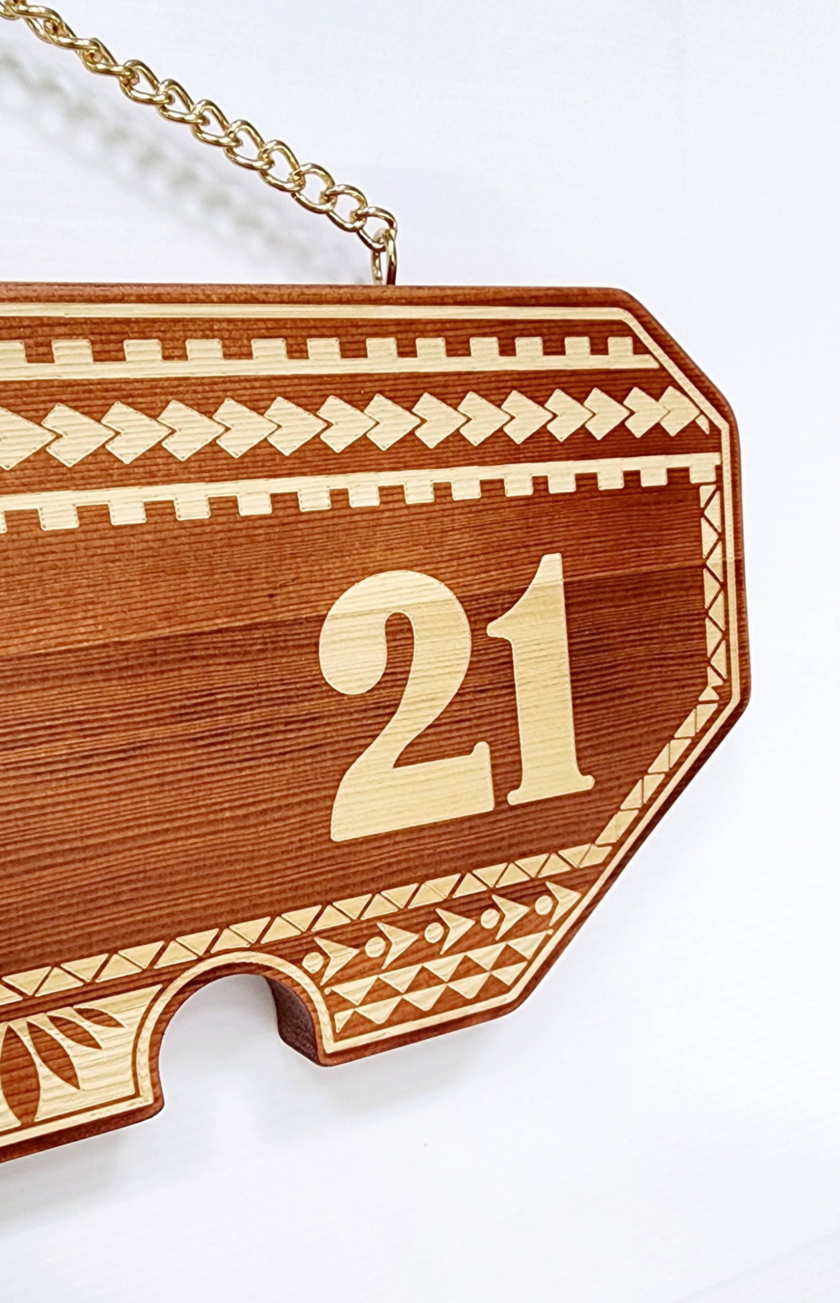 A beautifully crafted 21st birthday key made from solid pine timber, designed with intricate laser-engraved island-inspired patterns and adorned with two hibiscus flowers. The number “21” is elegantly engraved on the far right-hand side. A dedicated engraving area provides ample space for personalization, allowing up to three lines of text to include the birthday person’s name or special messages.