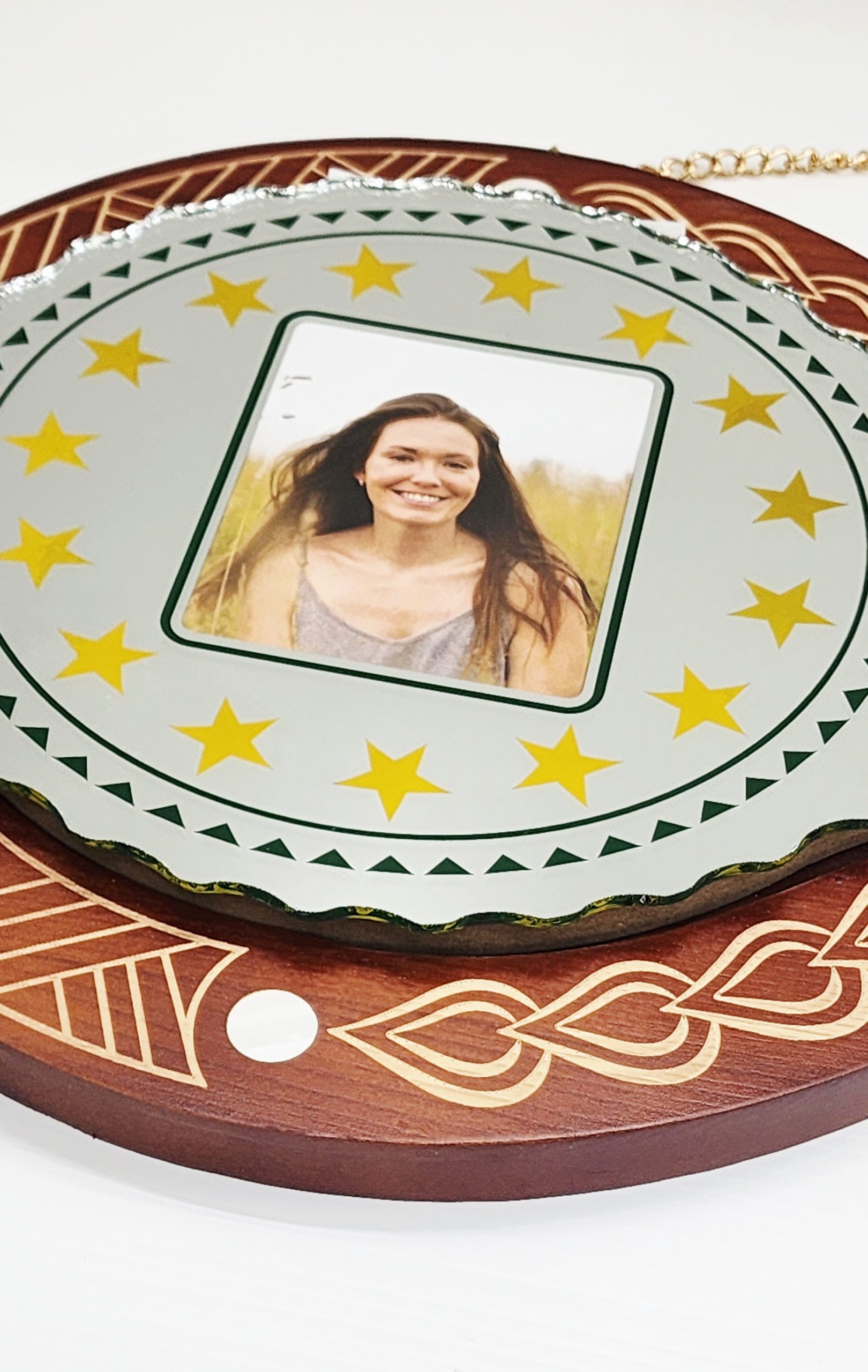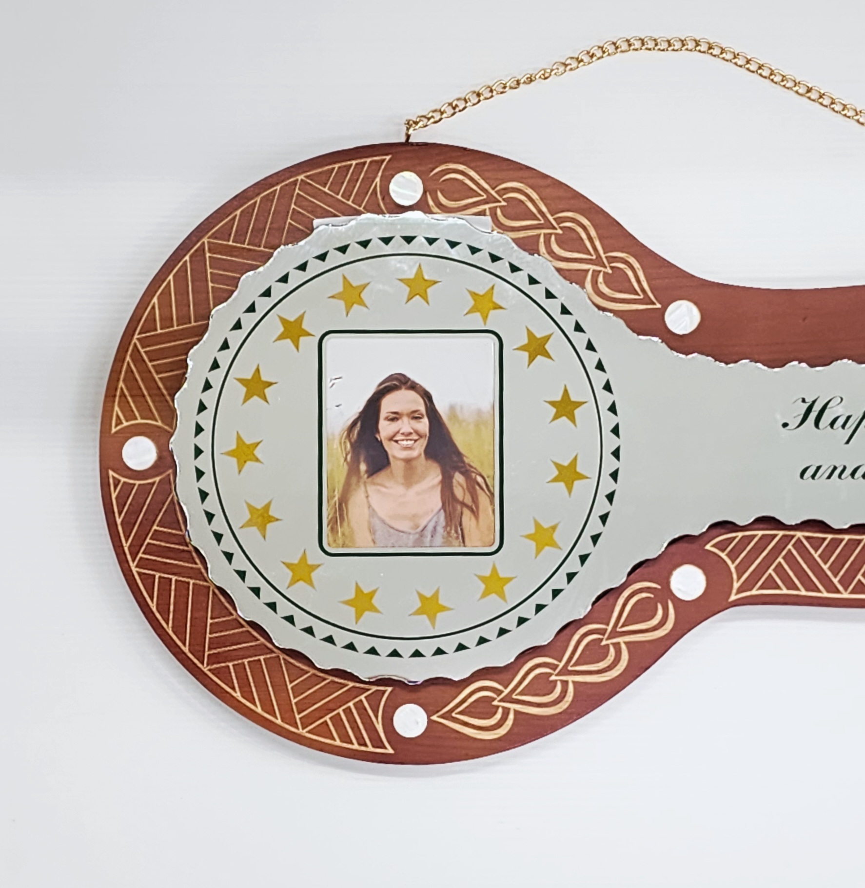 Celebrate a milestone birthday with this beautifully crafted wooden key featuring traditional Cook Islands artistry. At the heart of this piece is a stunning mirror key insert, designed with 15 etched stars surrounding a central photo frame. A classic Cook Islands pattern borders the stars, while the right-hand side of the mirror displays the words “Happy Birthday and Best Wishes” in elegant green script.