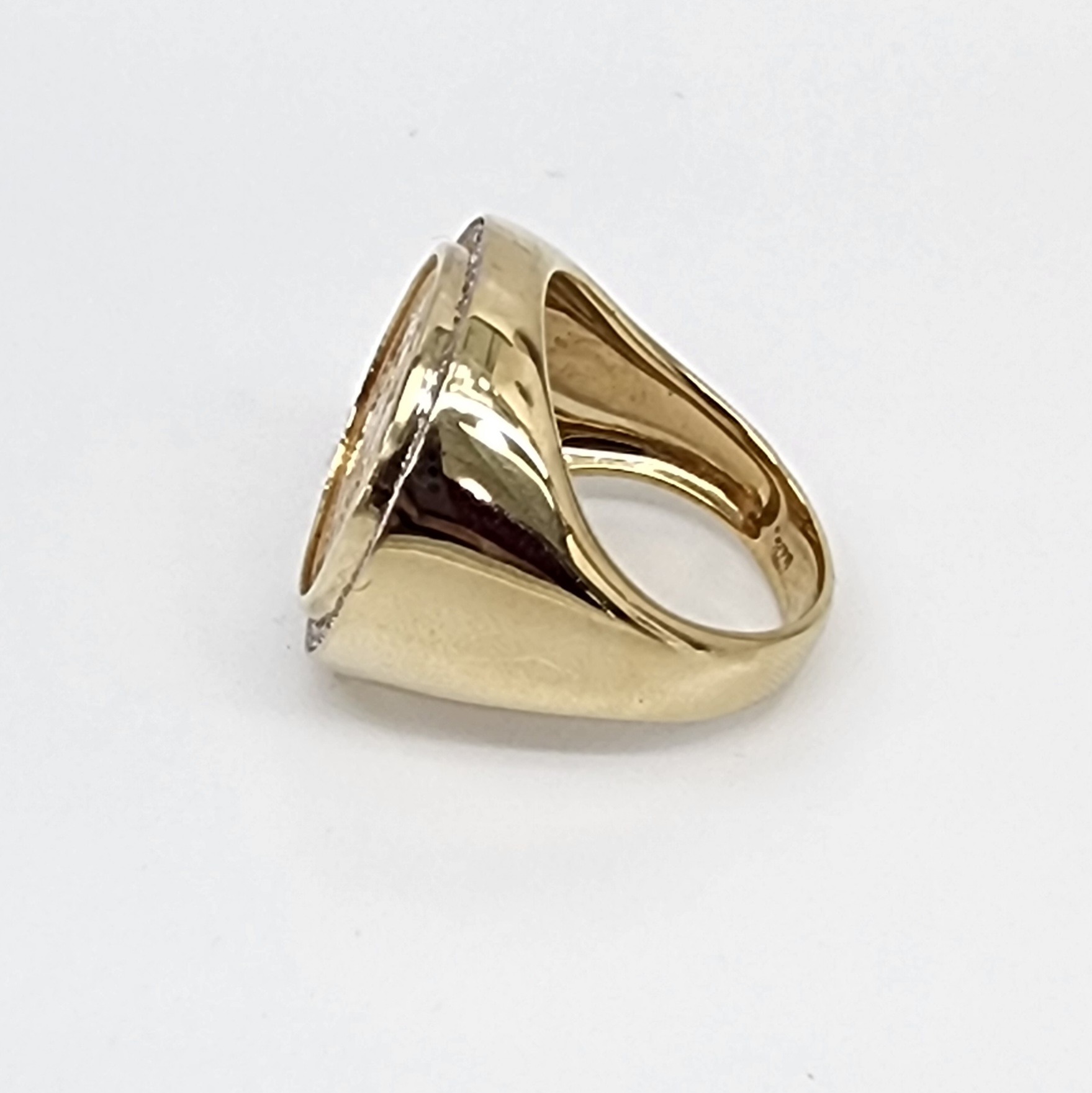 Encircling the coin is a dazzling halo of 58 round brilliant-cut diamonds, with a total diamond weight of 0.27ct. Each diamond is meticulously claw-set into the mount, creating a radiant sparkle that beautifully frames the historic coin. The combination of warm yellow gold, rich sovereign details, and shimmering diamonds makes this piece both a collector’s treasure and a bold statement ring.