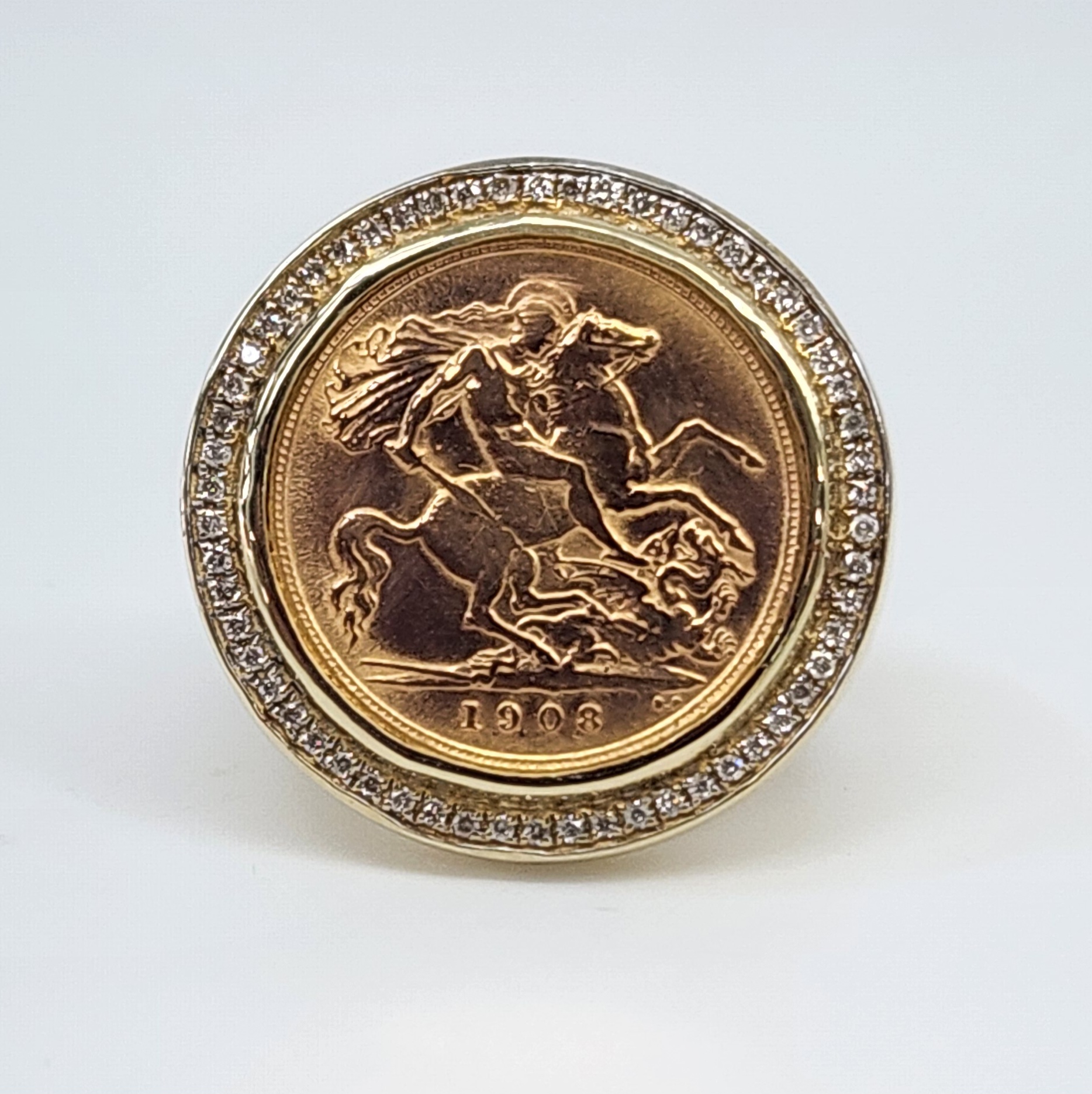 22ct Gold 1908 Full Sovereign Coin Ring with 9ct Gold 0.27ct Diamond Set Ring Mount