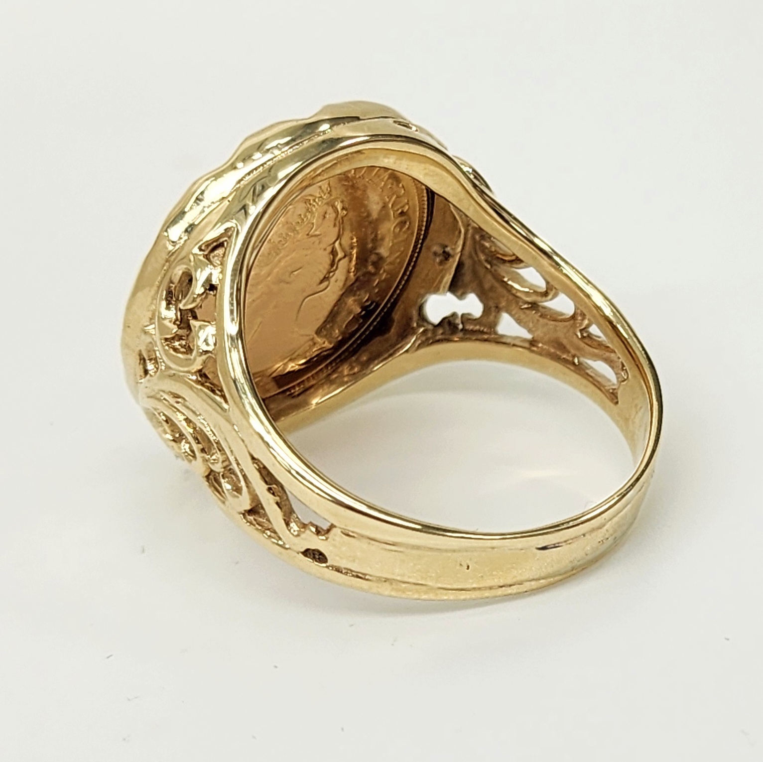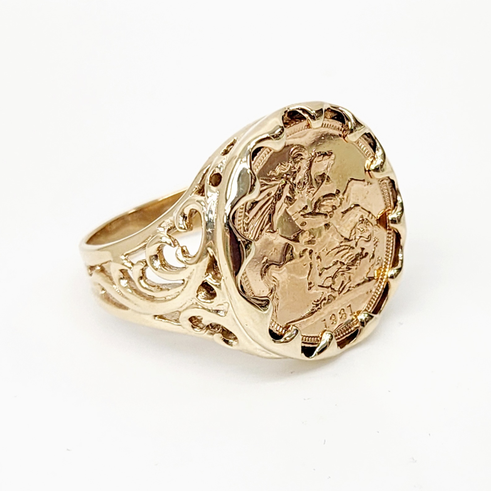 The meticulously designed ring mount is fashioned from solid 9ct yellow gold, featuring an intricate filigree setting along the side shanks, adding a touch of vintage charm and refined craftsmanship. The robust claw setting ensures that the sovereign coin remains firmly secured while enhancing its regal appearance.