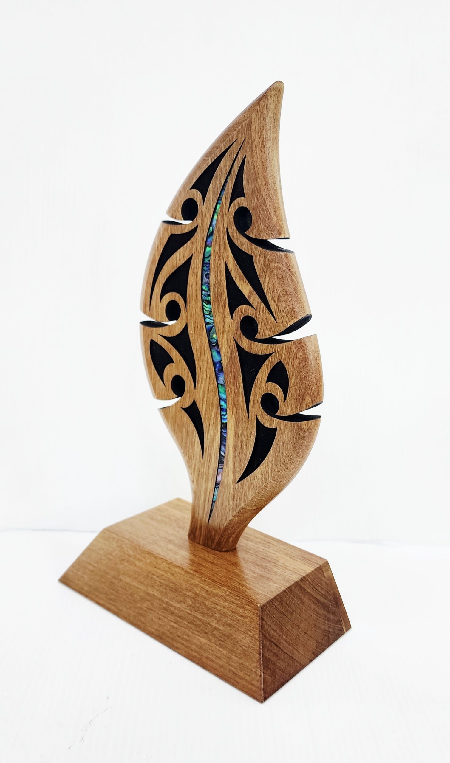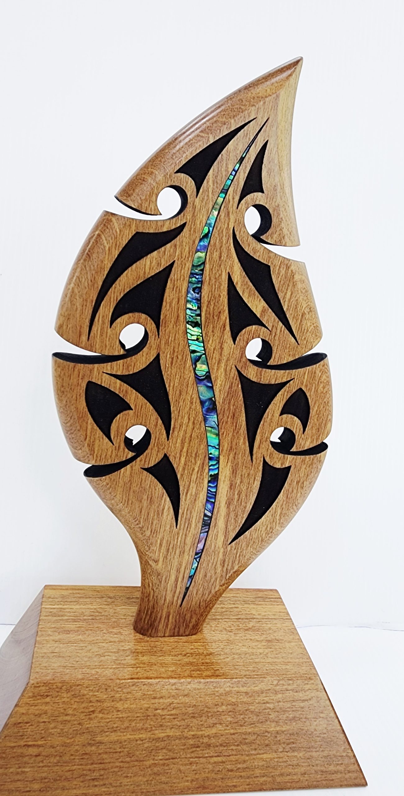 Crafted from solid Pacific Rimu (podocarp), this stunning piece features a traditional waka hoe (paddle) design, beautifully adorned with genuine New Zealand pāua shell inlays and intricate surface laser carvings that enhance its cultural depth and visual appeal. The paddle is securely mounted on a large, matching wooden base, giving it presence and stability—ideal for display or presentation.