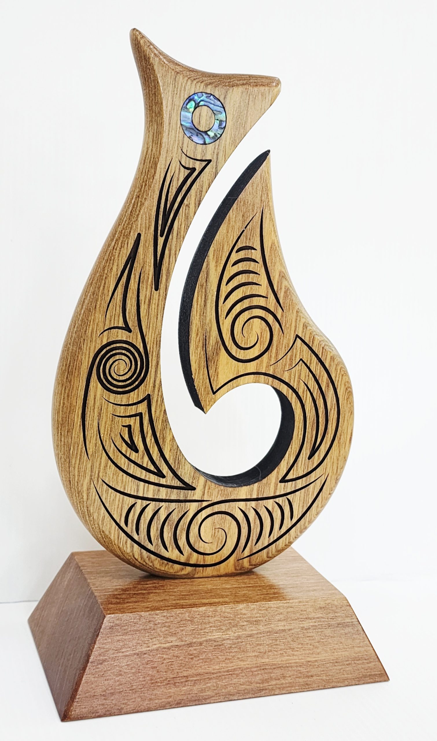 Intricately detailed with surface carvings, this fish hook sculpture is further enhanced by the shimmering inlay of genuine New Zealand pāua shell, adding colour, depth, and a distinctive Kiwi touch.