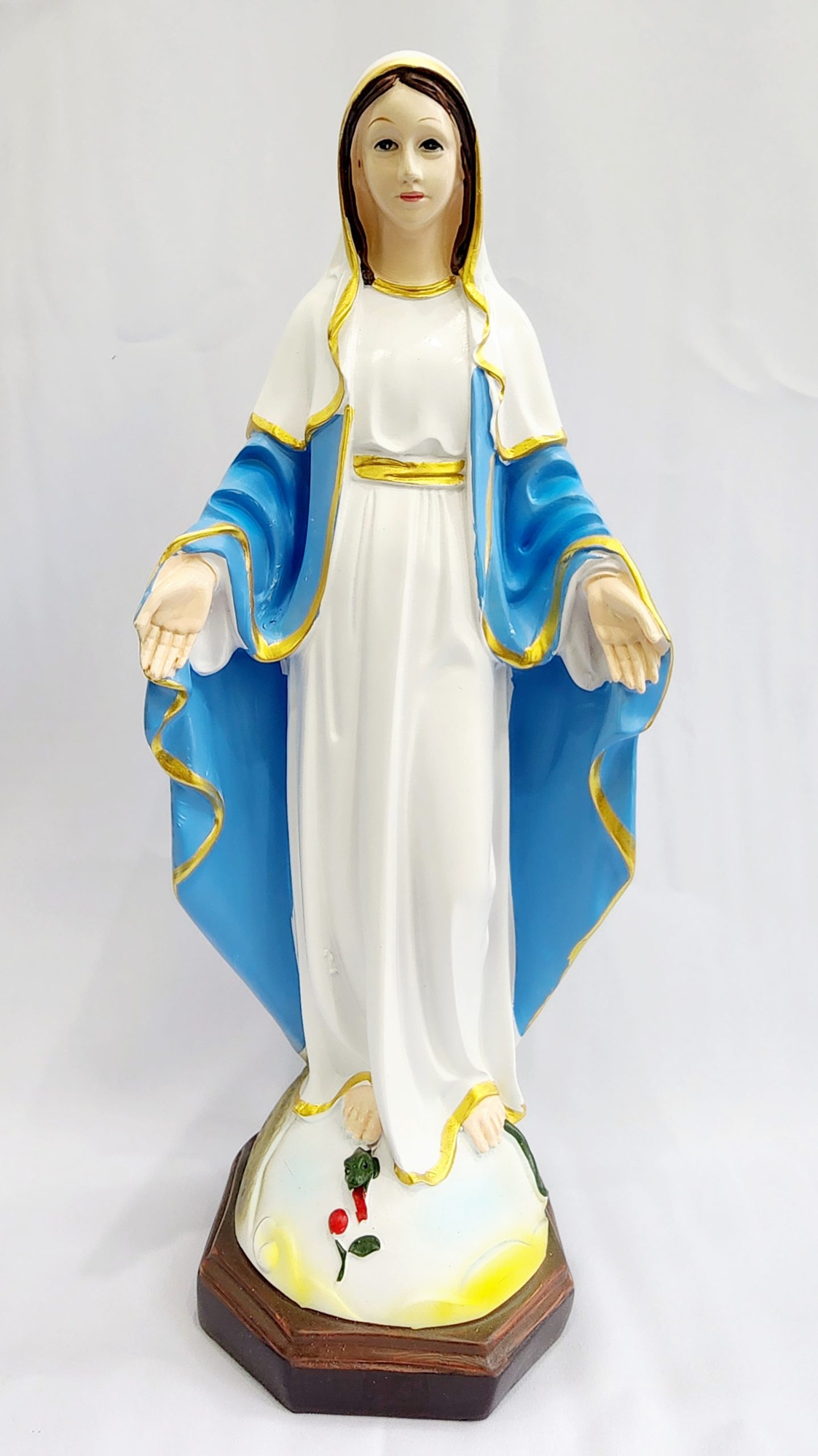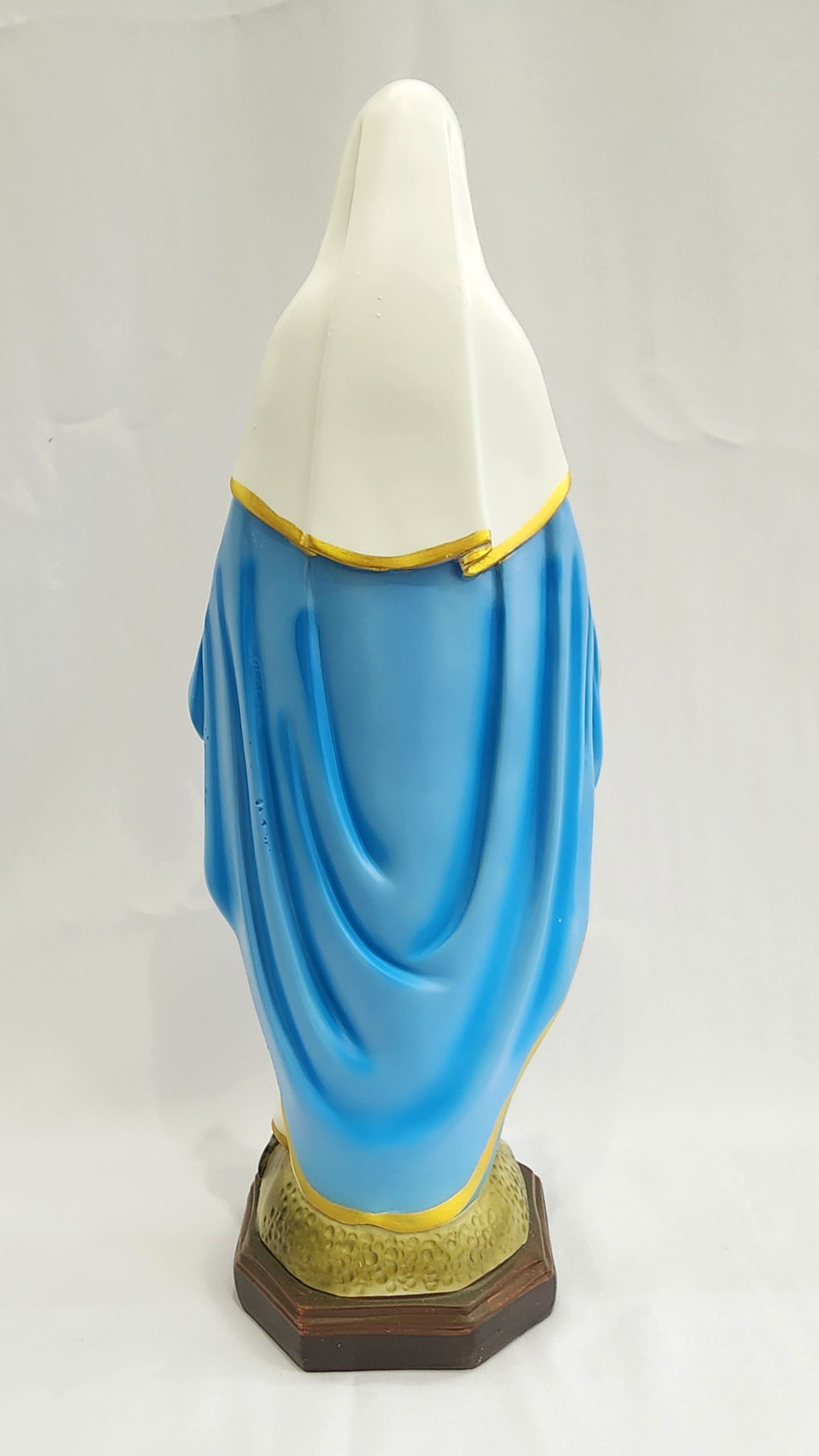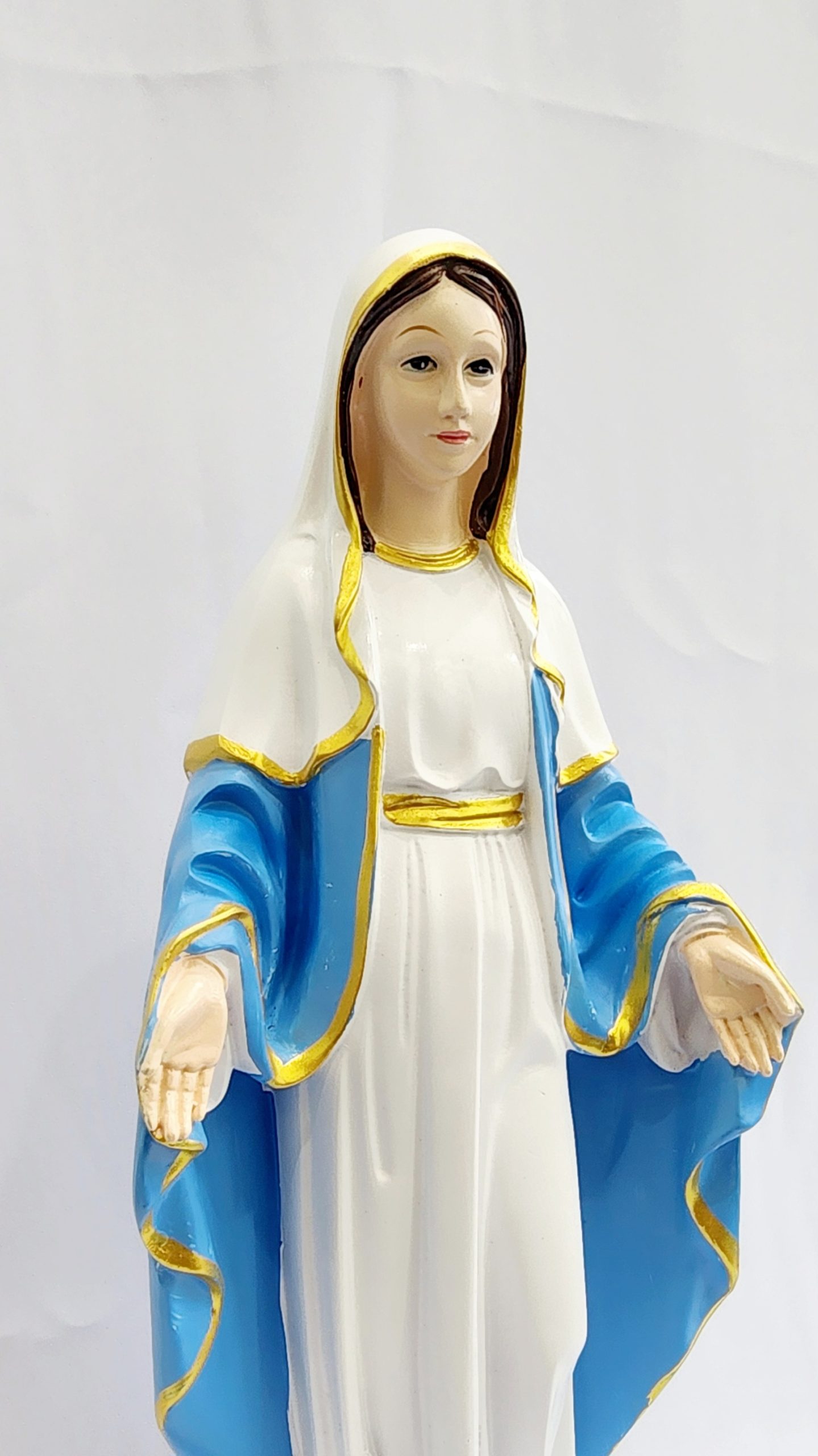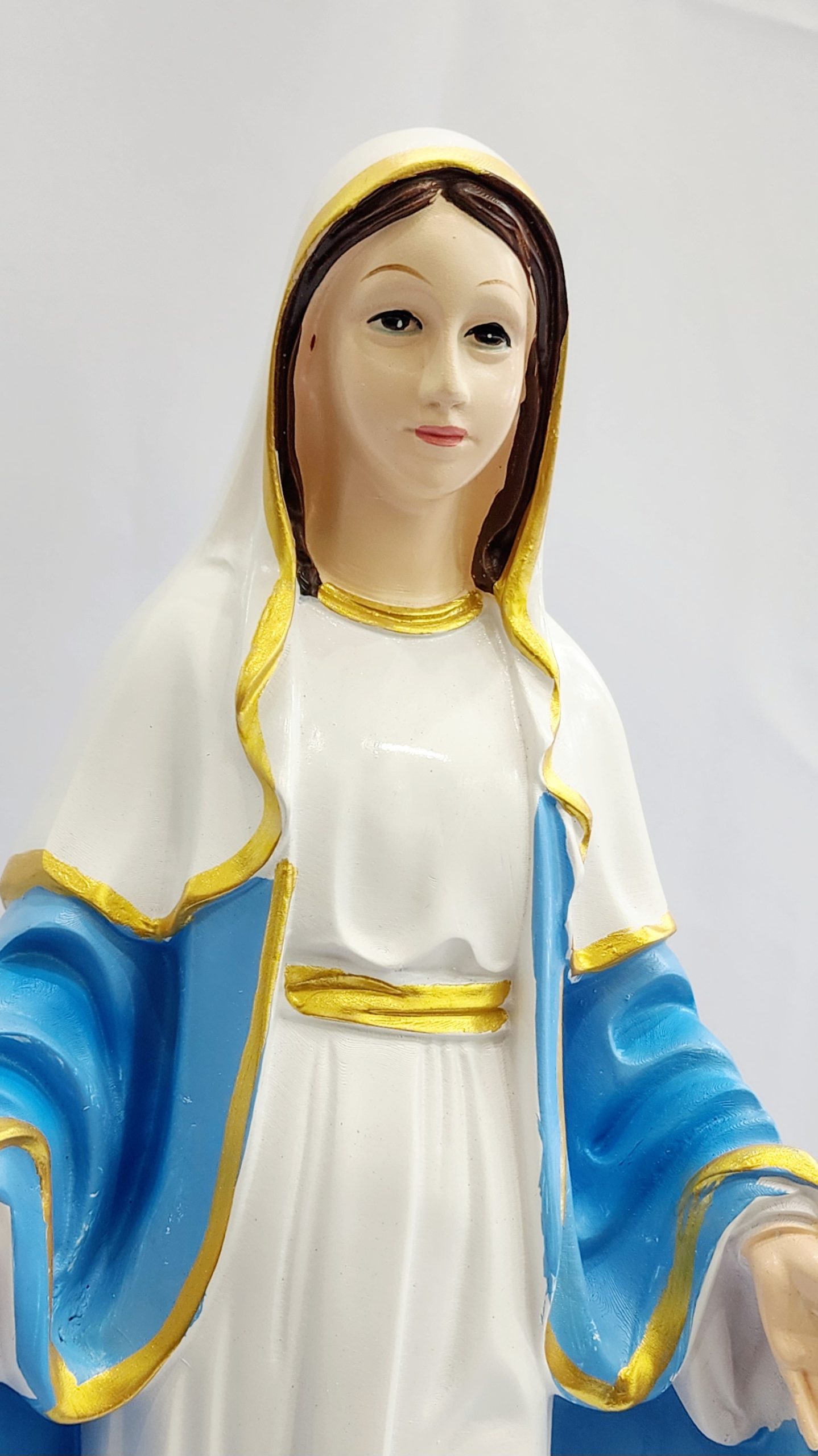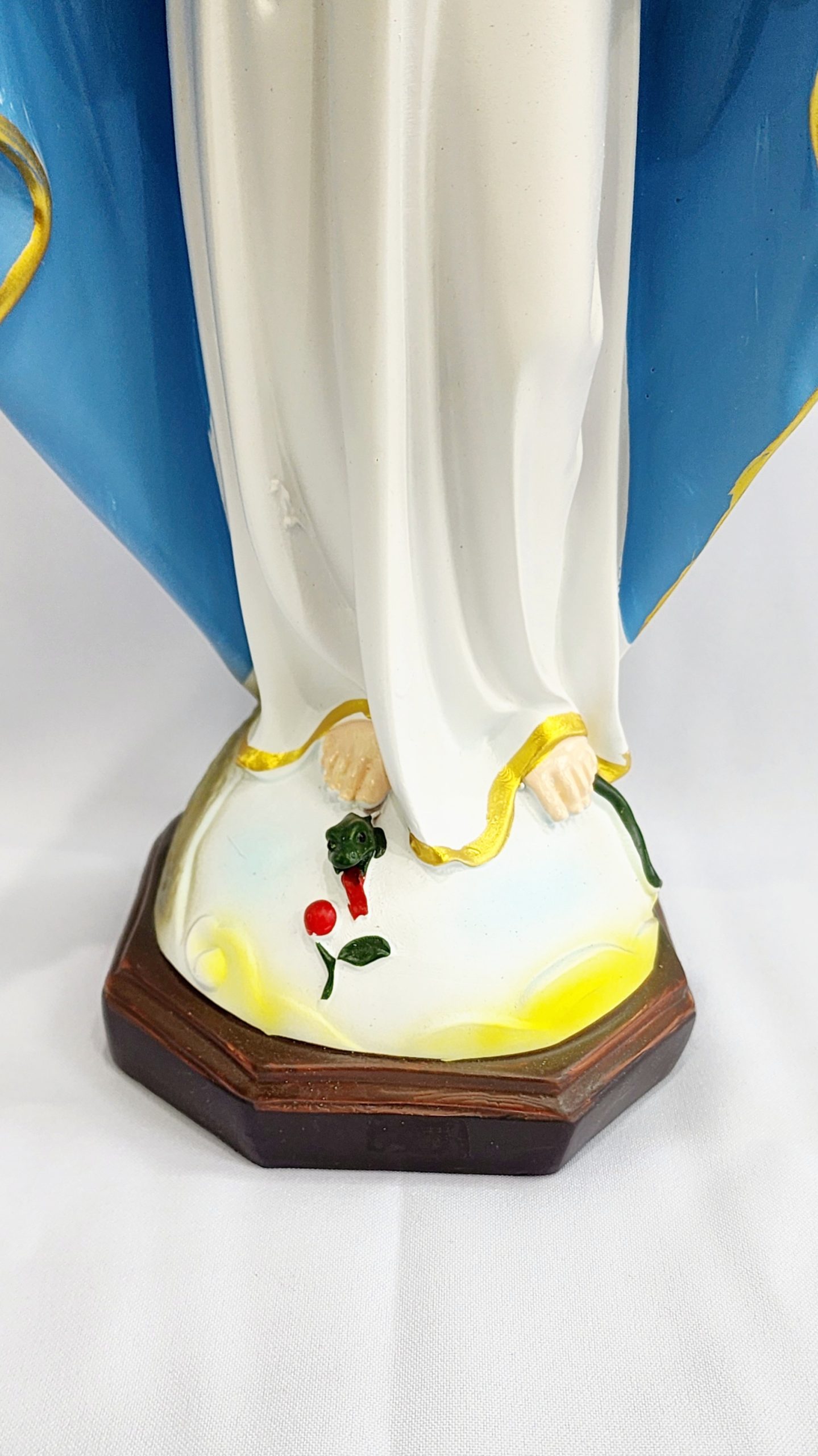 In this classic-style statue, the graceful Virgin Mary stands upon the earth, triumphantly crushing a snake under her foot. Adorned in a white veil, a flowing dress, and a light blue cloak, she exudes beauty, humility, and boundless joy. Hand-painted with meticulous care, her traditional garments emanate a sense of peace and hope. Welcome the Blessed Virgin into your hearts and homes, as her presence brings forth a delightful addition to any space.