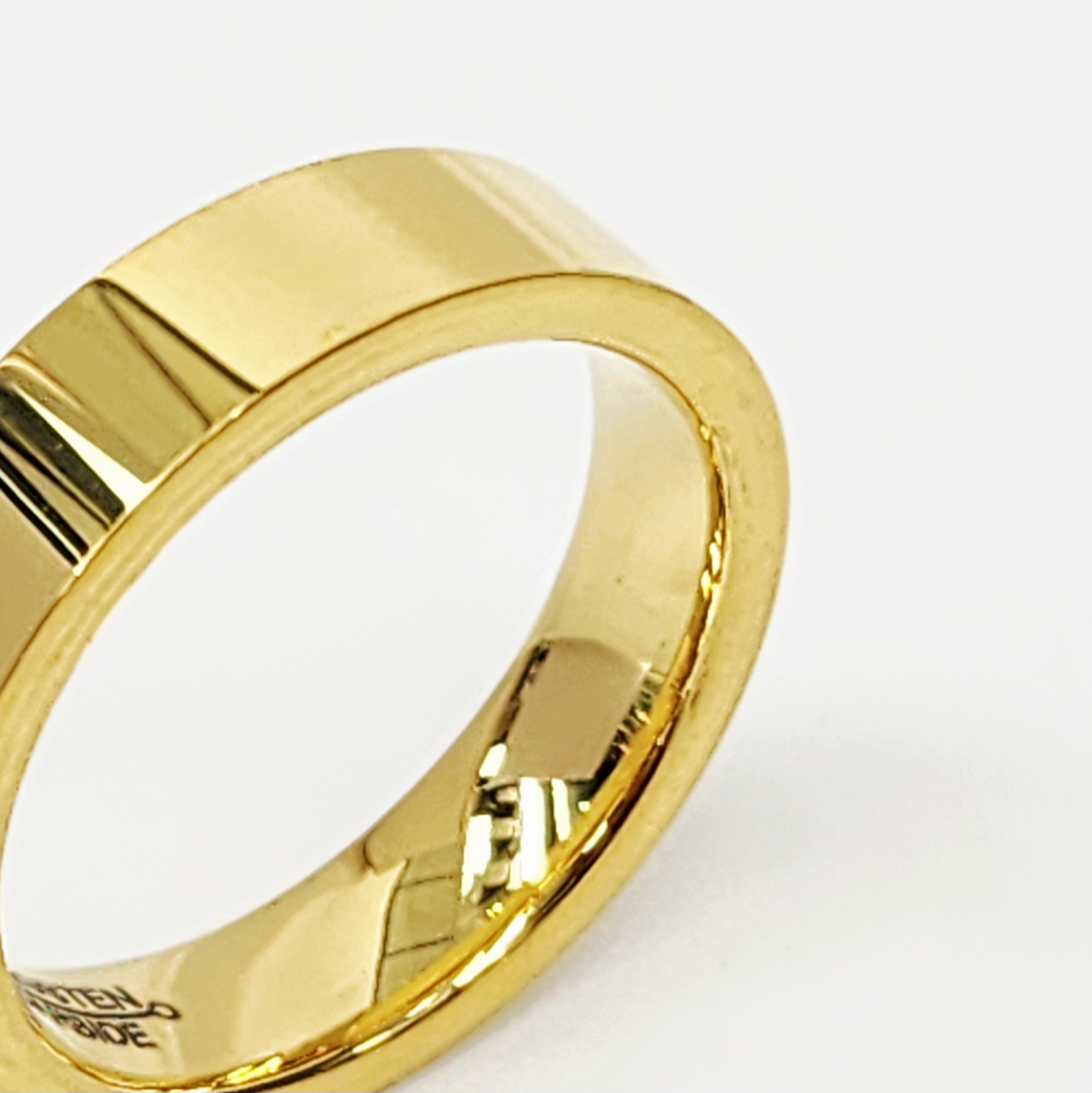 Made from tungsten carbide, one of the hardest and most durable metals available, the ring is plated with a rich gold finish, creating the classic look of a gold band with the added advantage of strength and resistance to everyday wear.