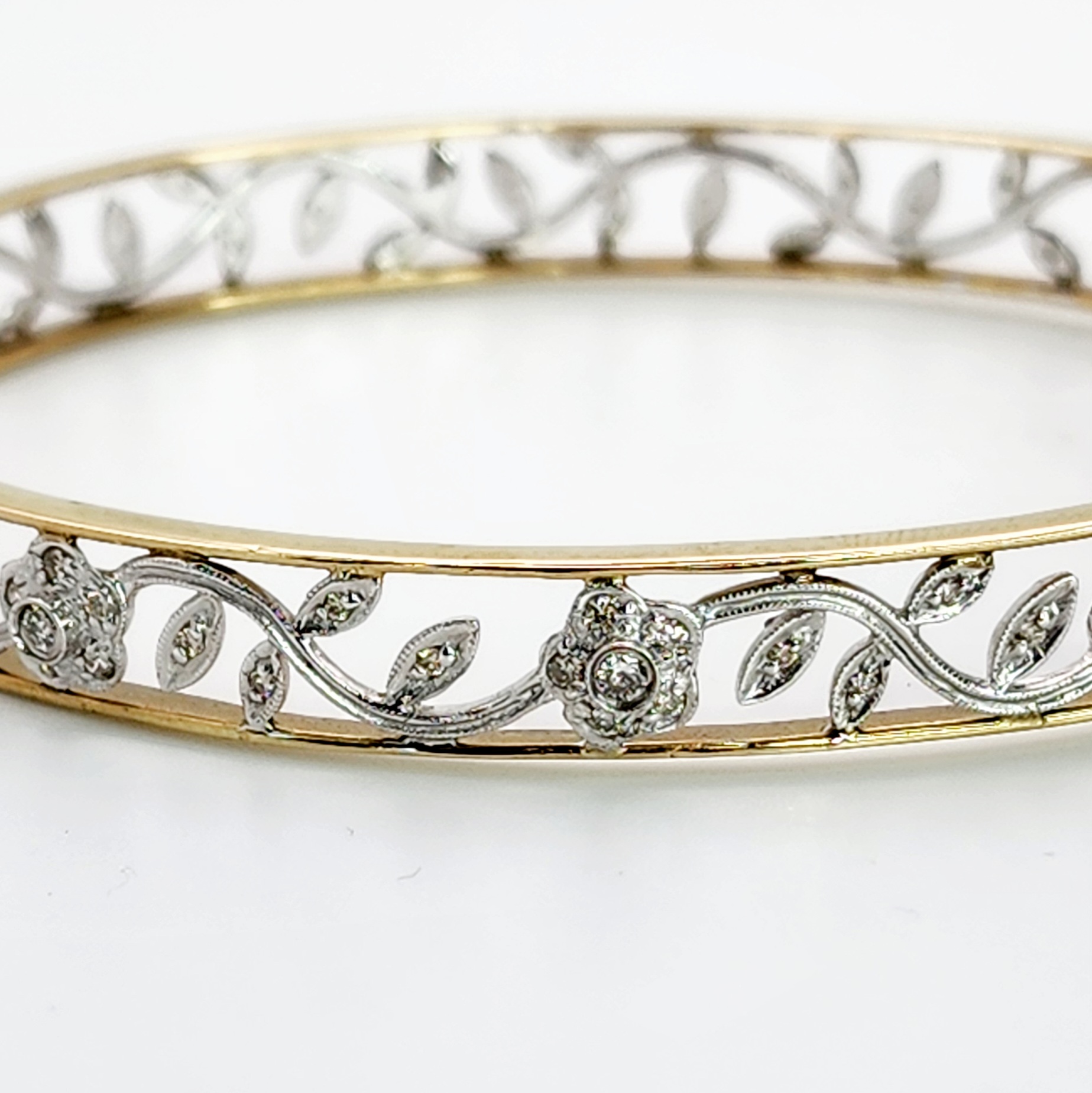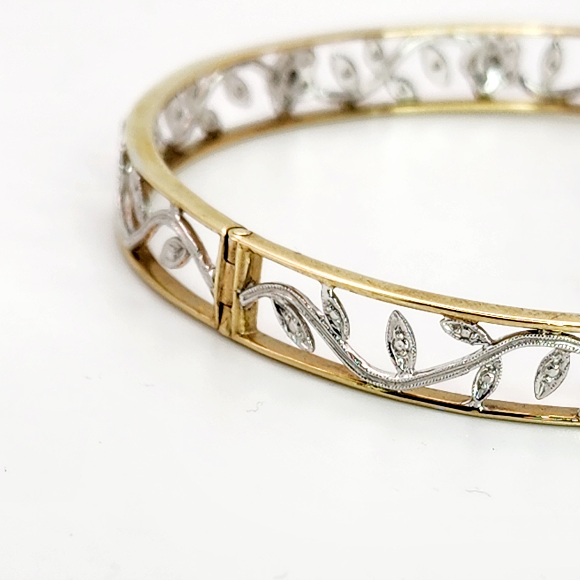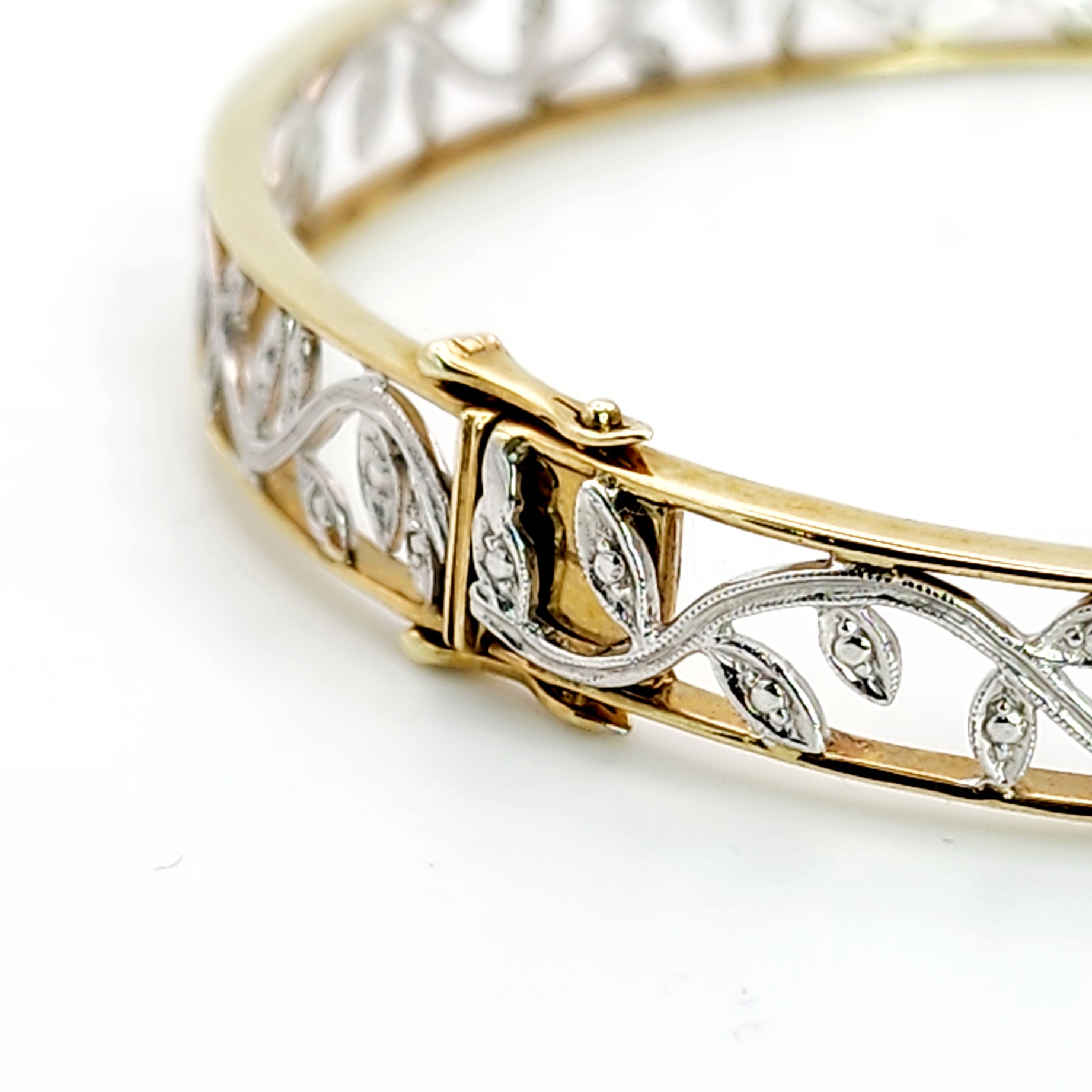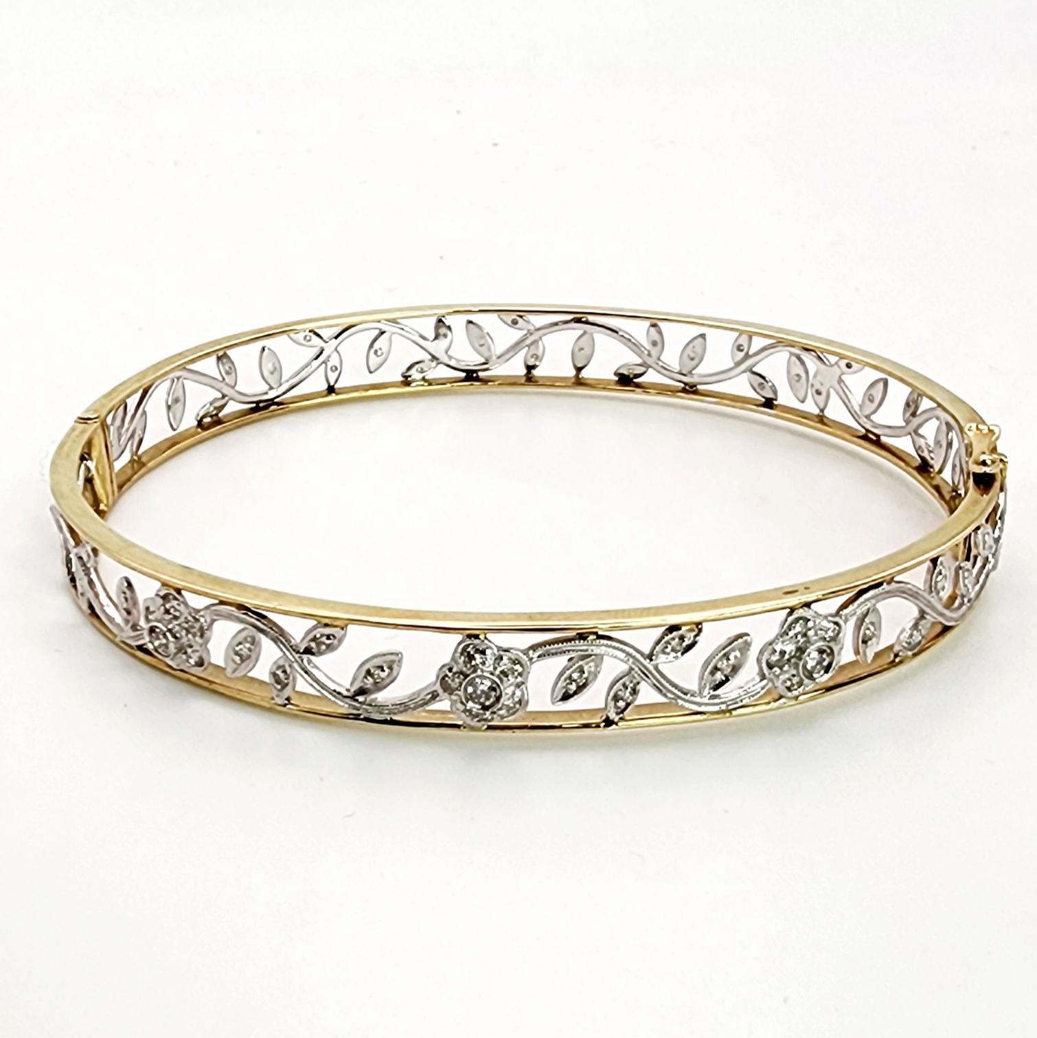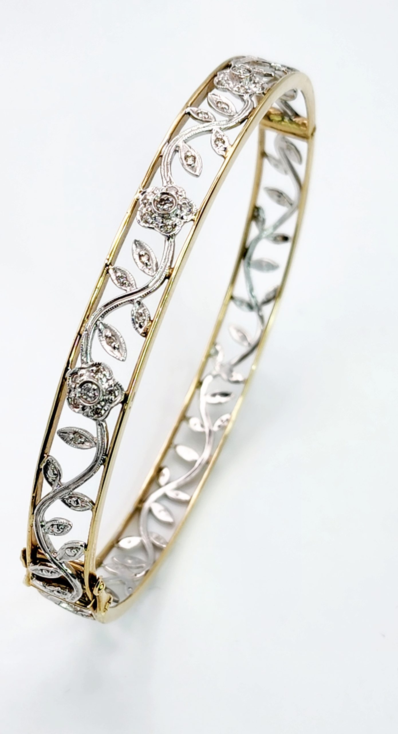 9ct Two-Tone Gold Vintage Style Hinged Flower Bangle with Diamond Setting