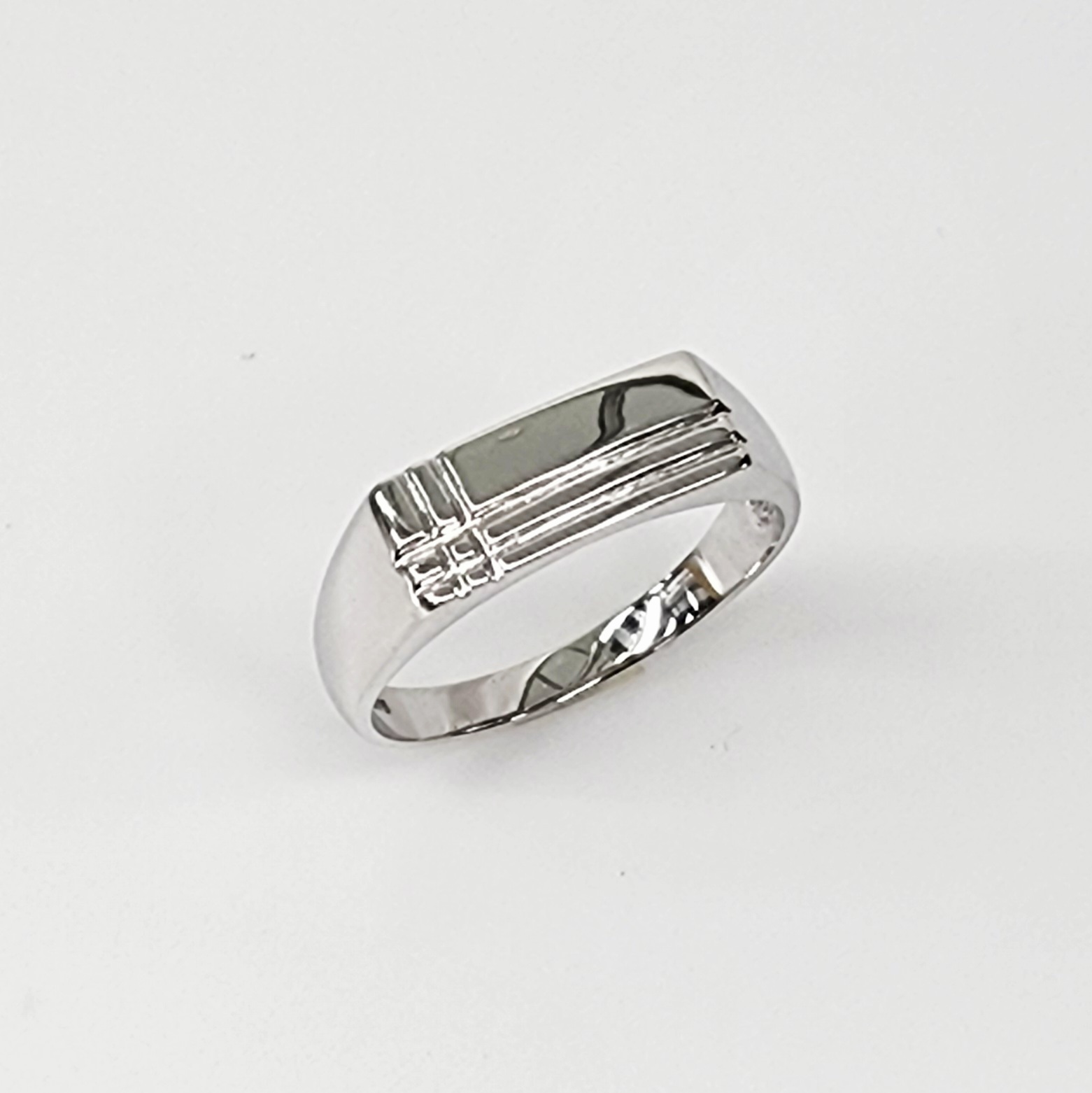 The design features two fine horizontal engraved lines running across the face of the ring, adding depth and symmetry. In the corner of the signet top, these are intersected by two vertical engraved lines, forming a subtle crosshatch pattern that enhances the visual interest without overwhelming the clean lines of the ring.