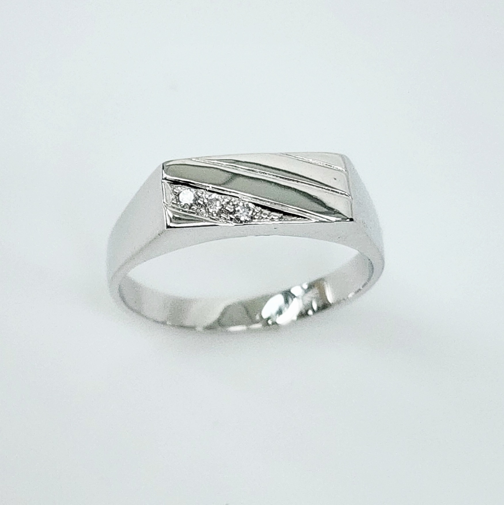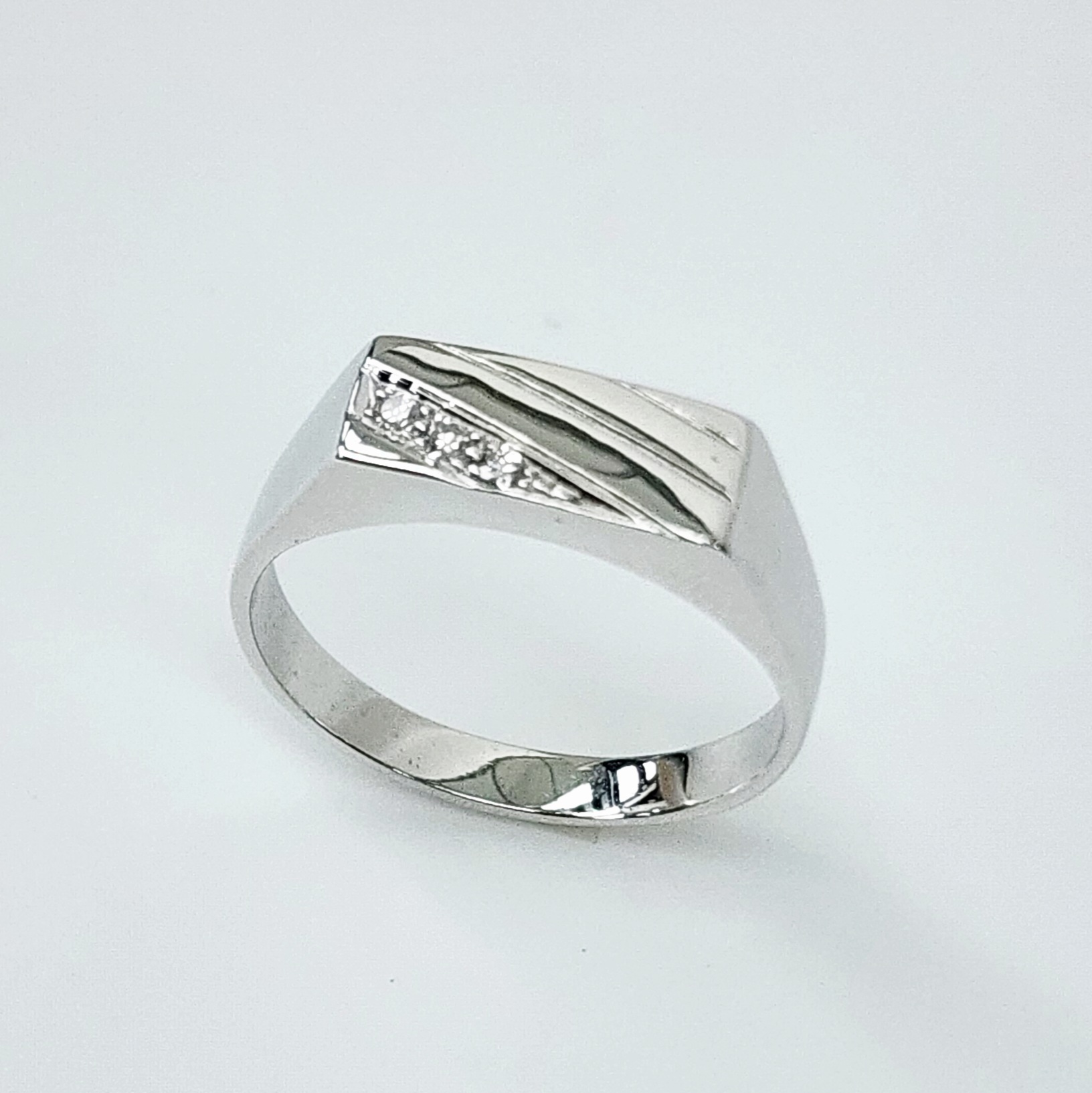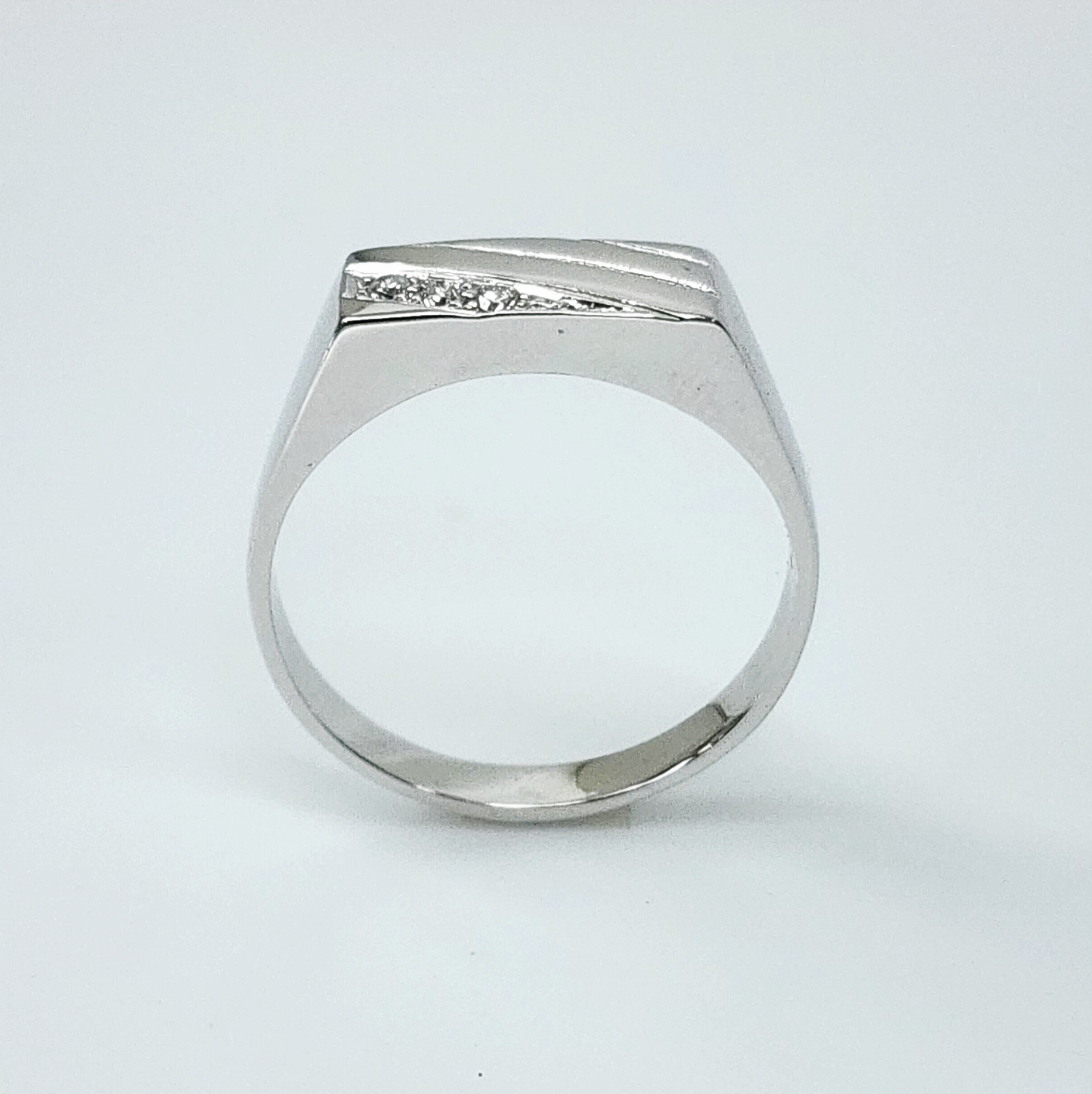 Crafted in luxurious 9ct white gold, this gents signet ring features a sleek rectangular top measuring 14mm in width by 6mm in height, offering a bold yet refined presence on the finger. The face of the ring is elegantly designed with a modern angled motif, showcasing three round brilliant cut diamonds, securely set in classic claw settings. These diamonds have a combined total weight of 0.03 carats, adding a subtle yet sophisticated sparkle.