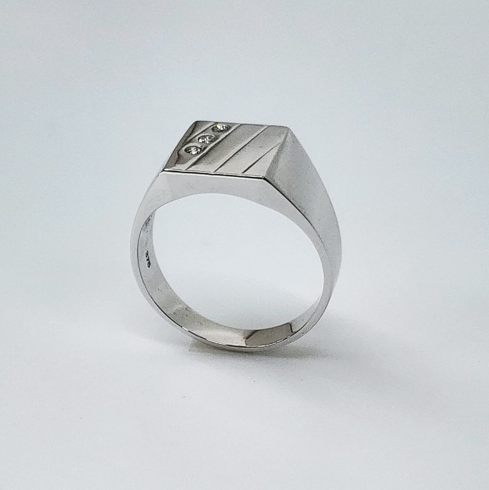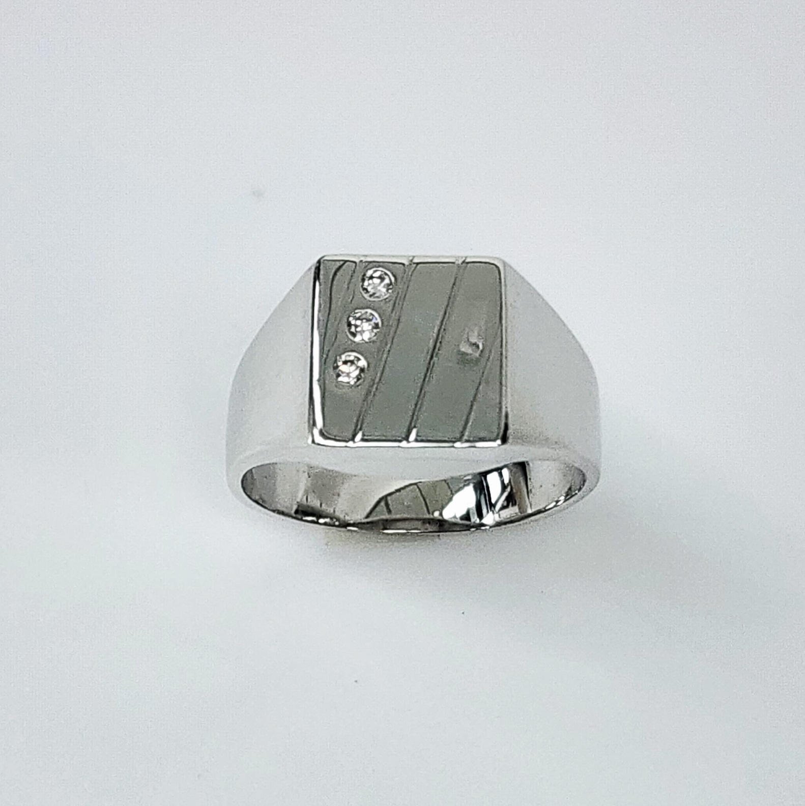 Crafted in premium 9ct white gold, this sophisticated gents signet ring features a bold square top measuring 11mm by 11mm, offering a strong, masculine silhouette. The top surface is designed with a refined diagonal pattern of four engraved lines running from the top corner to the bottom corner, creating a sleek and dynamic aesthetic.