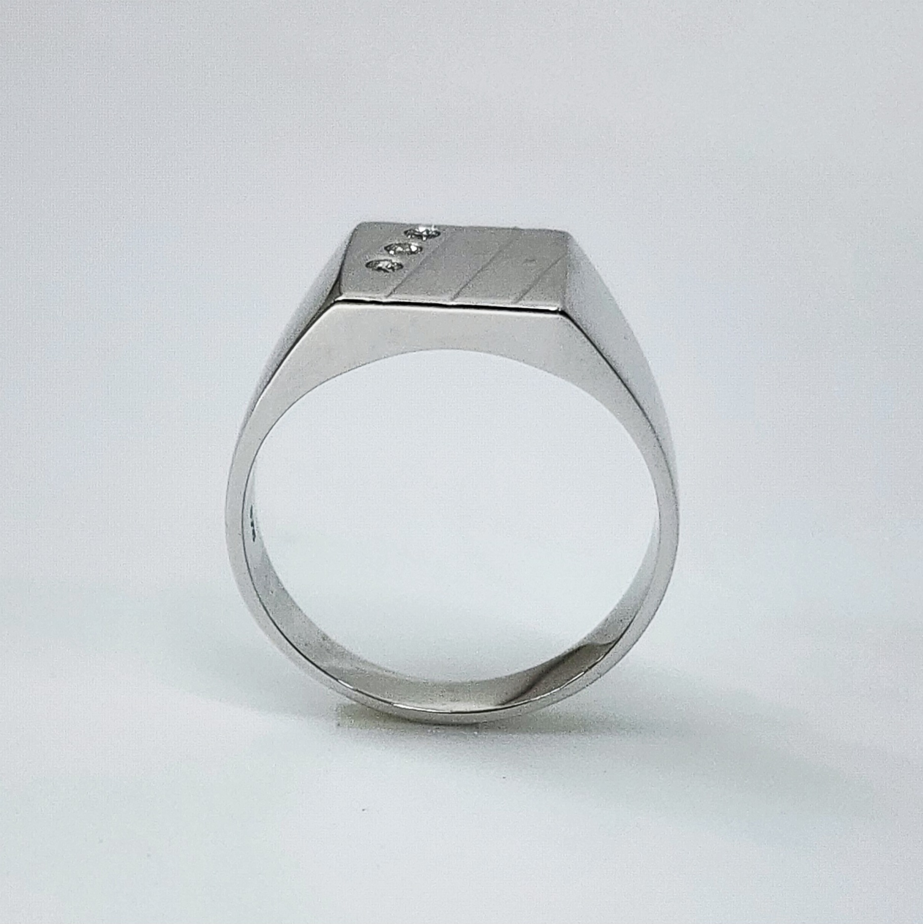 Nestled between two of these engraved lines is a trio of round brilliant-cut diamonds, bevel-set at a descending angle across the face of the ring. These diamonds are precisely positioned to enhance the geometric style of the ring while adding a subtle yet eye-catching sparkle. The total diamond weight is 0.03 carats.