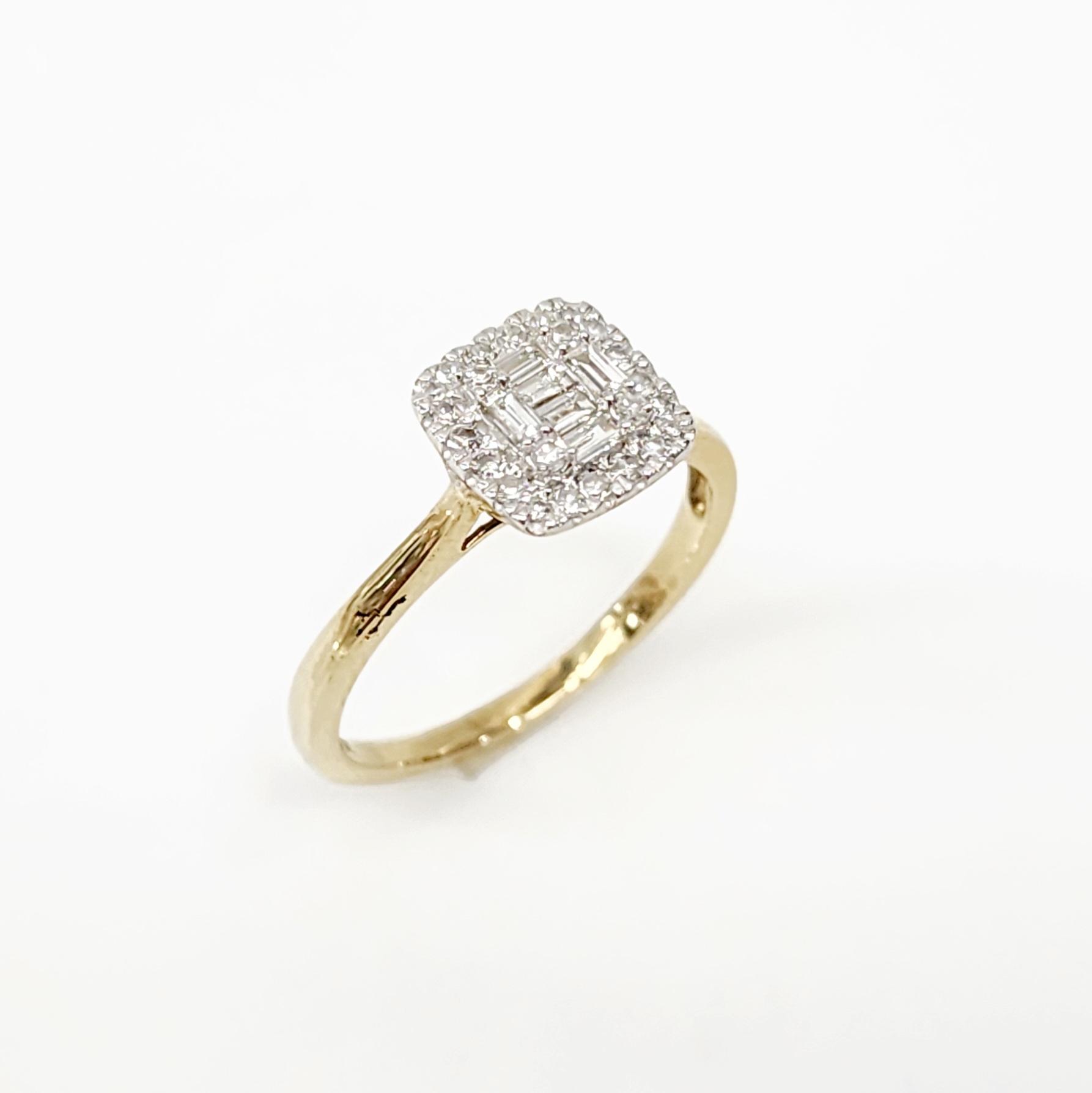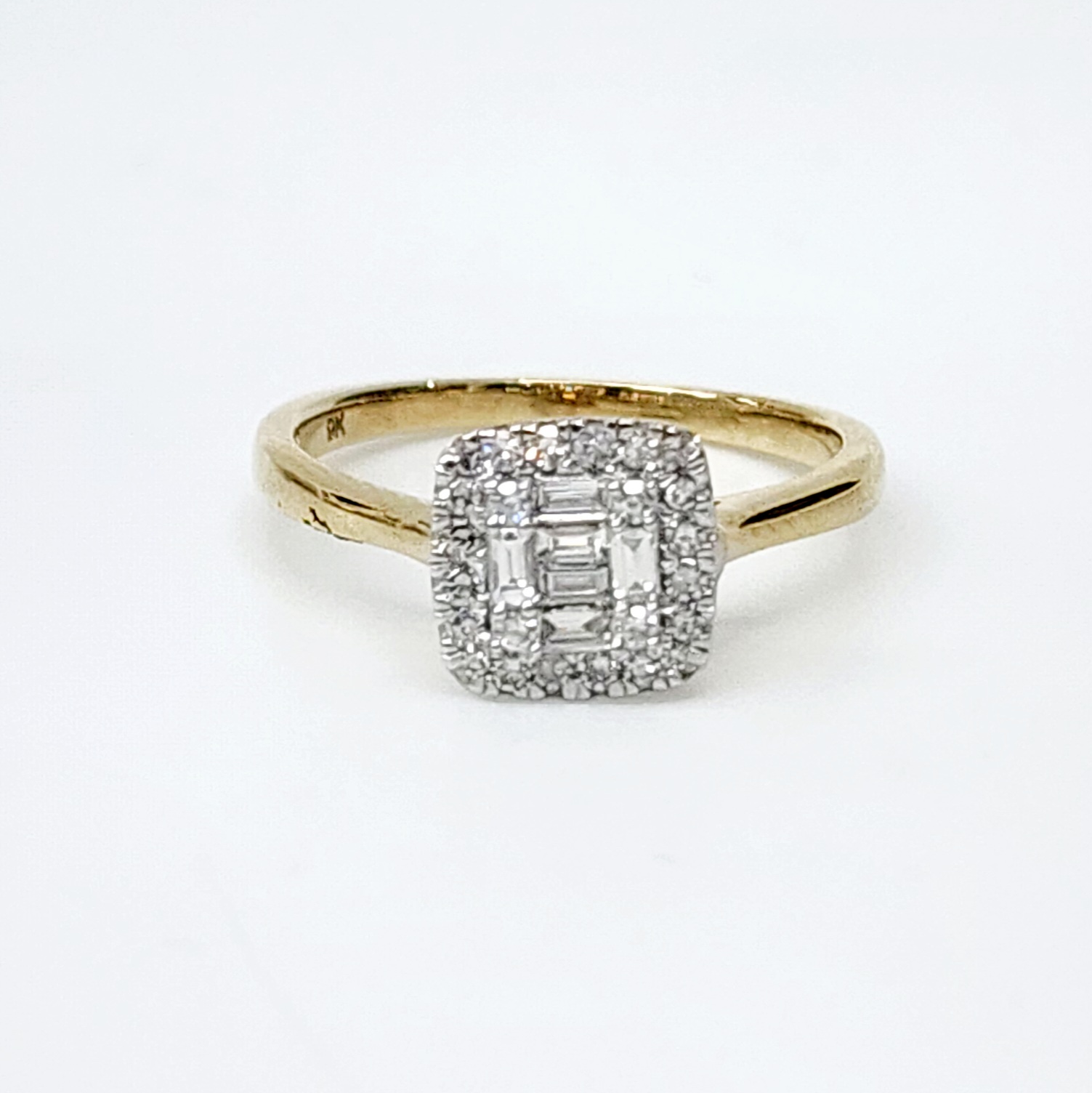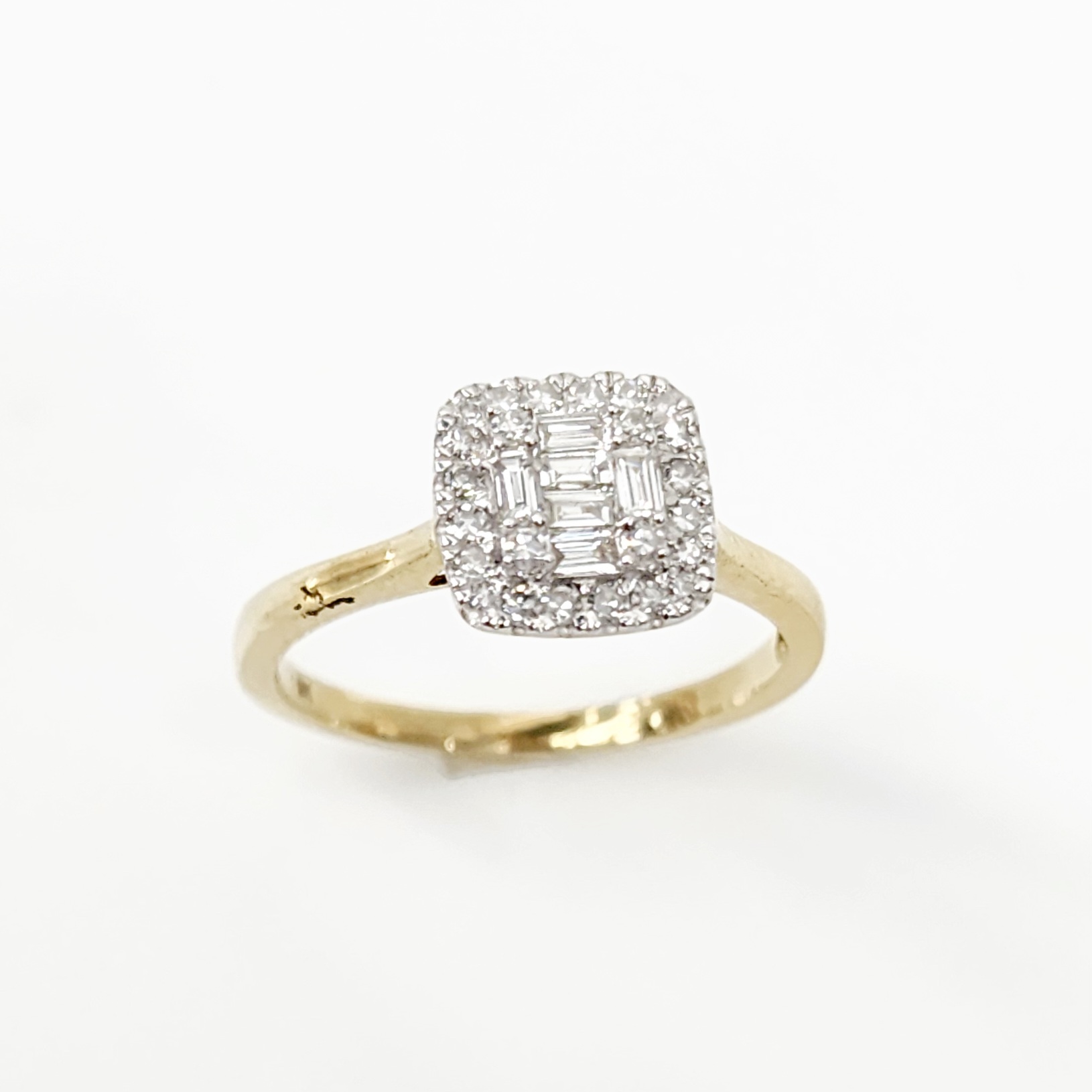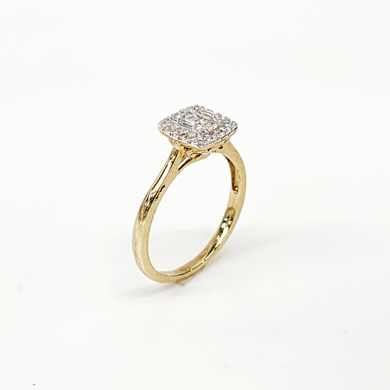 This 9ct Yellow Gold Diamond ring, designed in a cluster style that embraces the timeless allure of a cushion shape. The central diamond takes centre stage, encircled by a halo of diamonds. Further enhancing its sophistication, the baguette cut diamonds in the centre of the cluster. This ring stands as a testament to enduring love and timeless elegance.
