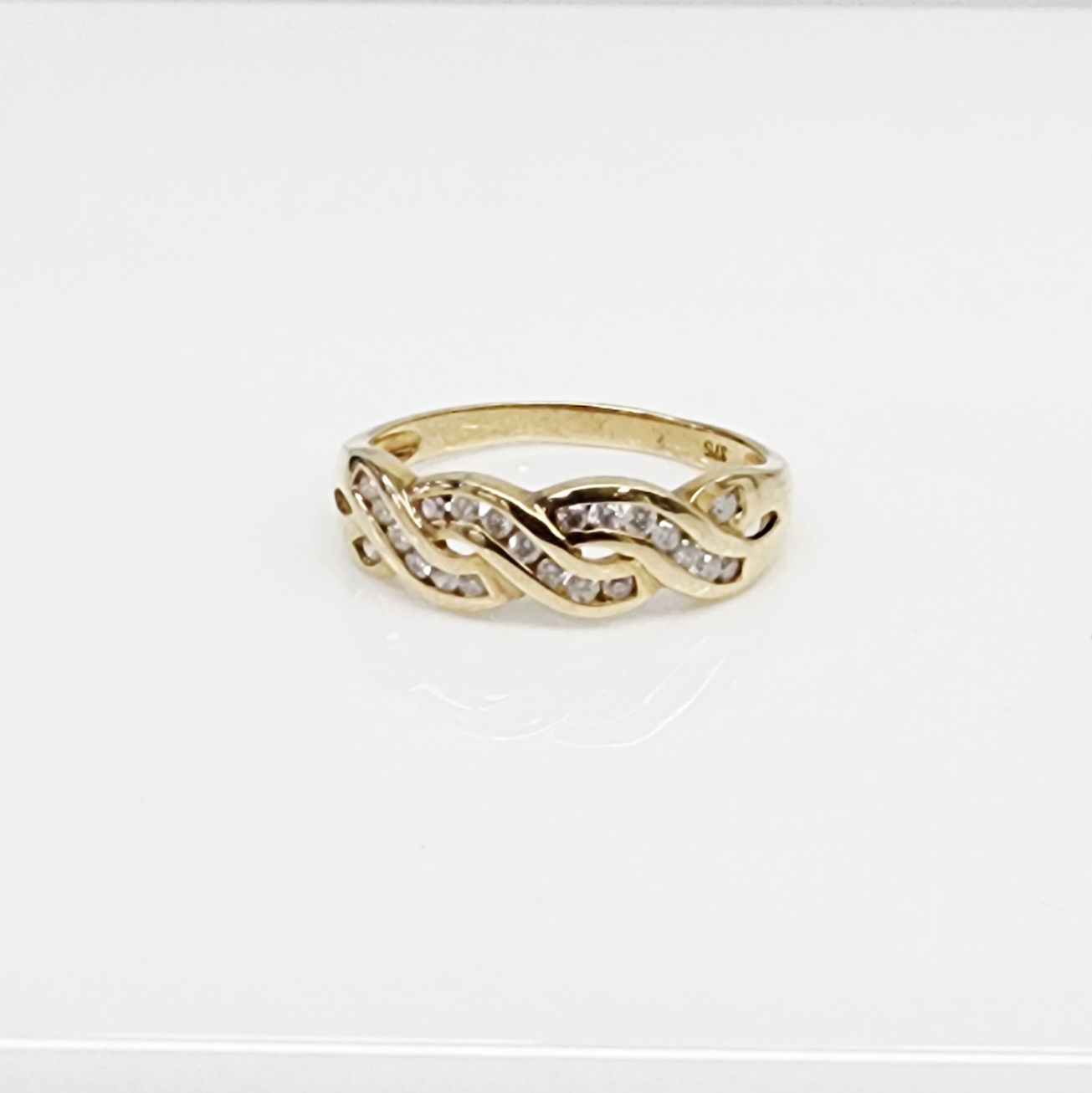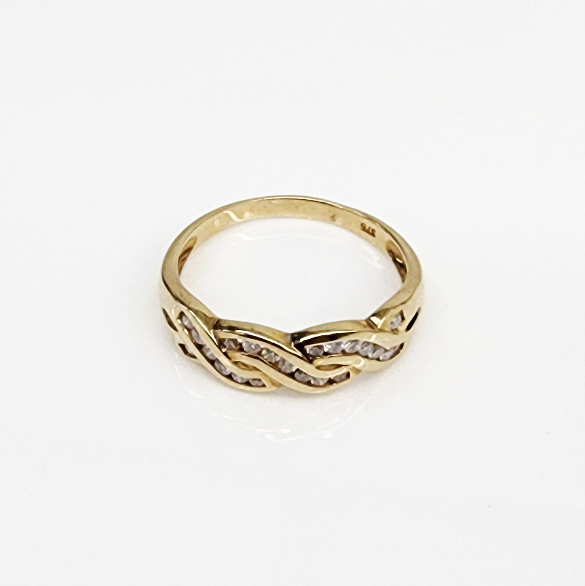 This elegant 9ct yellow gold diamond ring features a beautifully flowing twist design, symbolizing unity and timeless style. The band is delicately set with 0.25ct total diamond weight, each diamond secured in a smooth rubover setting that enhances durability and everyday comfort.