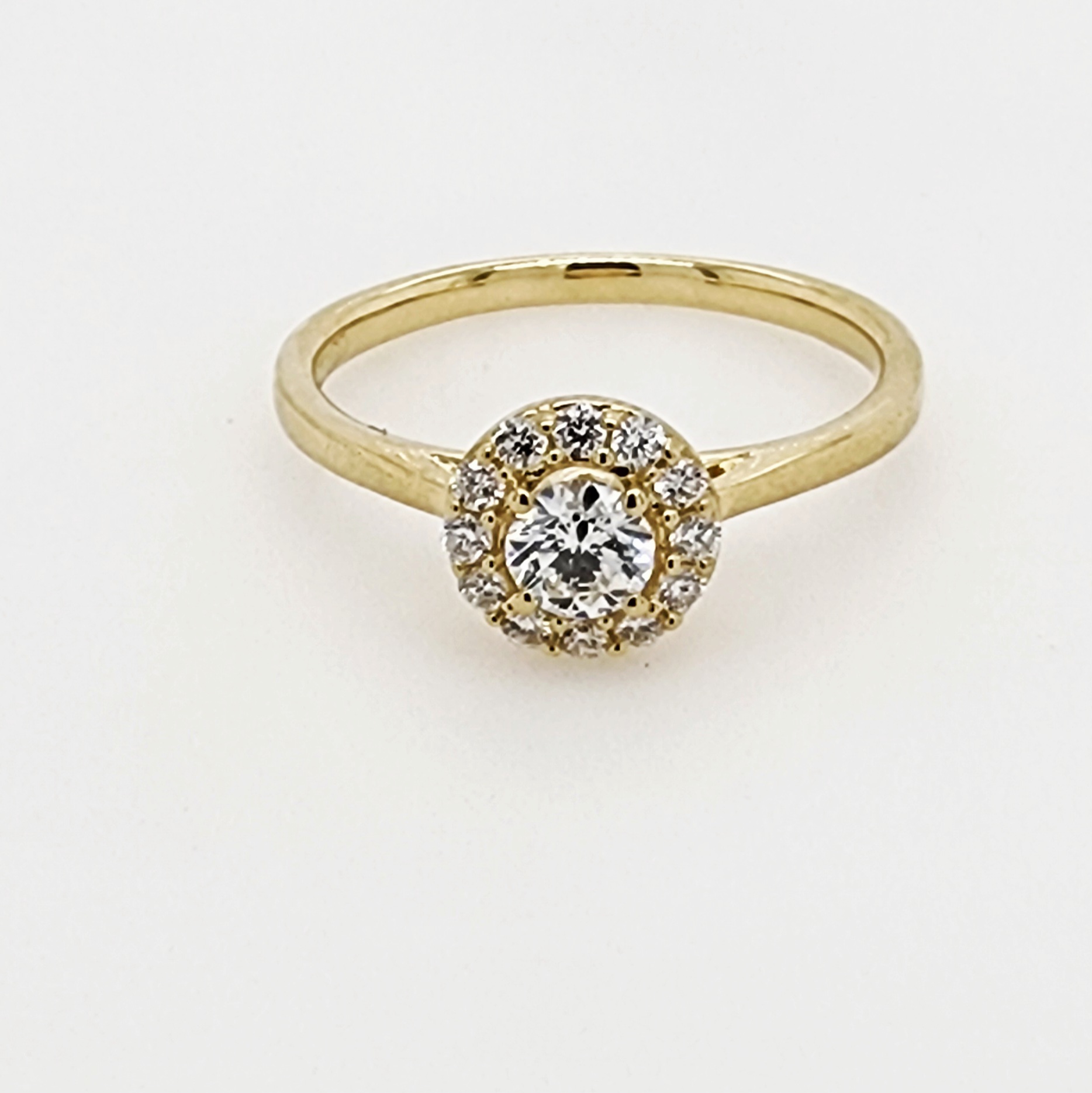 Celebrate your love with this timeless engagement ring, beautifully crafted in solid 9ct yellow gold. At its heart sits a 4mm round lab-grown diamond, securely held in a classic 4-claw setting. Surrounding the centre stone is a sparkling halo of 12 individually set round lab-grown diamonds, each secured in its own 4-claw setting. Together, the diamonds have a total weight of 0.40ct, boasting exceptional E/F colour and VS clarity for maximum brilliance.