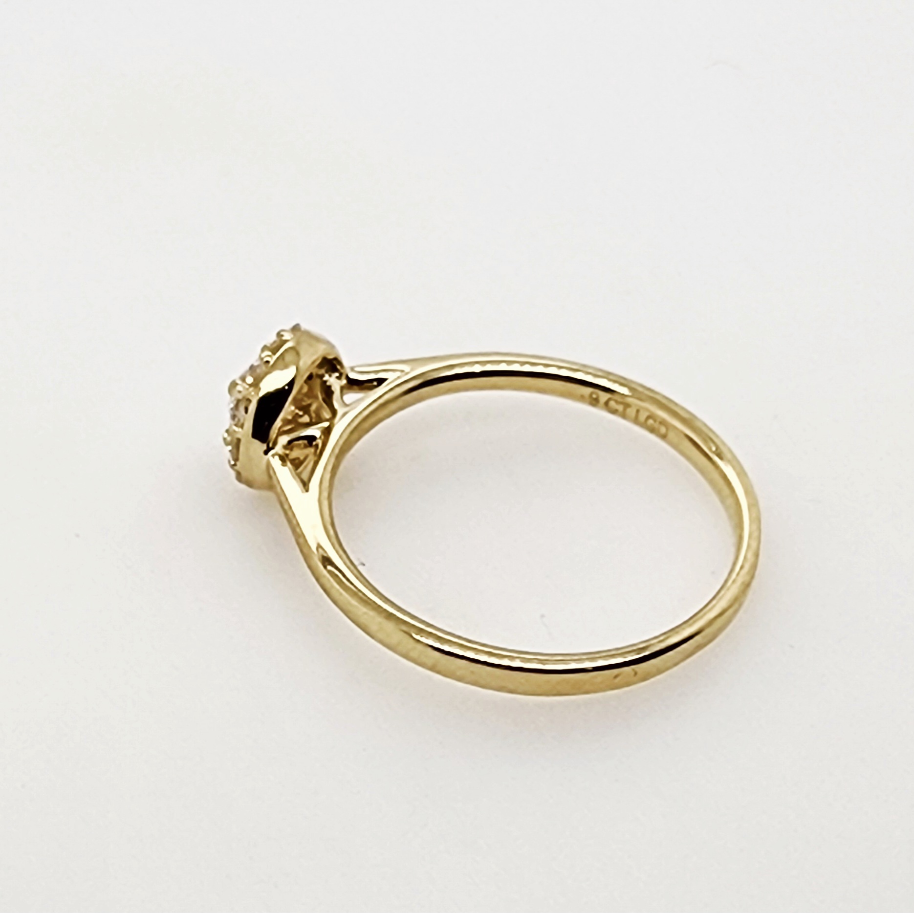 The overall diamond setting measures 7.50mm in diameter, creating a stunning focal point that sits gracefully above the polished 9ct gold band. The band features elegantly designed shoulders that rise up to support the halo from beneath, offering a delicate yet sturdy finish. This ring is a perfect choice for an engagement, symbolising love and commitment with a classic and radiant design.