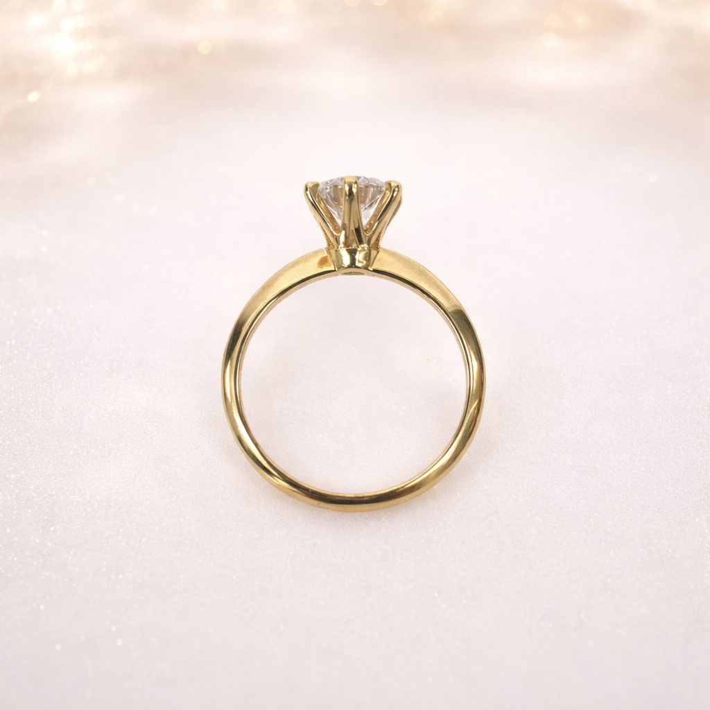 The diamond is securely held in a classic 6 claw (six-prong) setting, providing enhanced protection while allowing maximum light exposure to the stone. This traditional yet refined setting not only ensures durability for everyday wear but also elevates the diamond slightly above the band, creating a graceful and elegant profile.