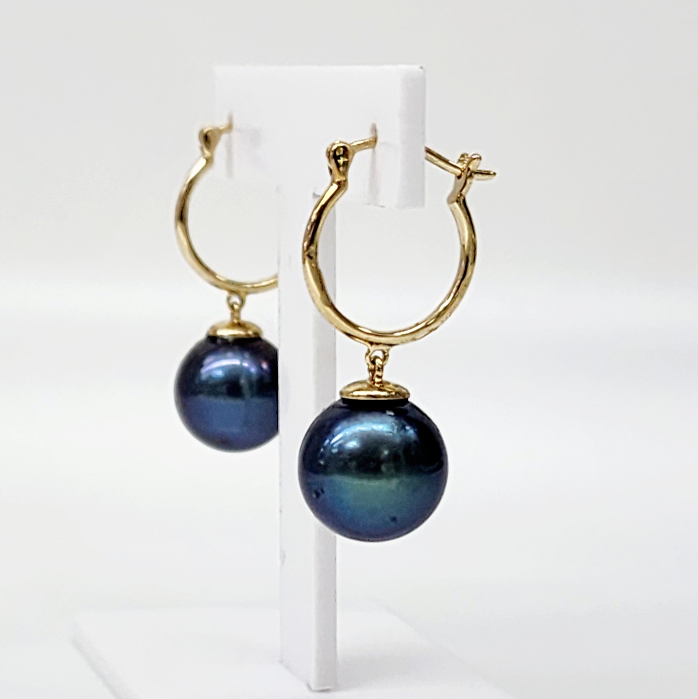 9ct Yellow Gold 11-11.5mm Round Tahitian Peacock Colour Black Pearl Hoop Earring