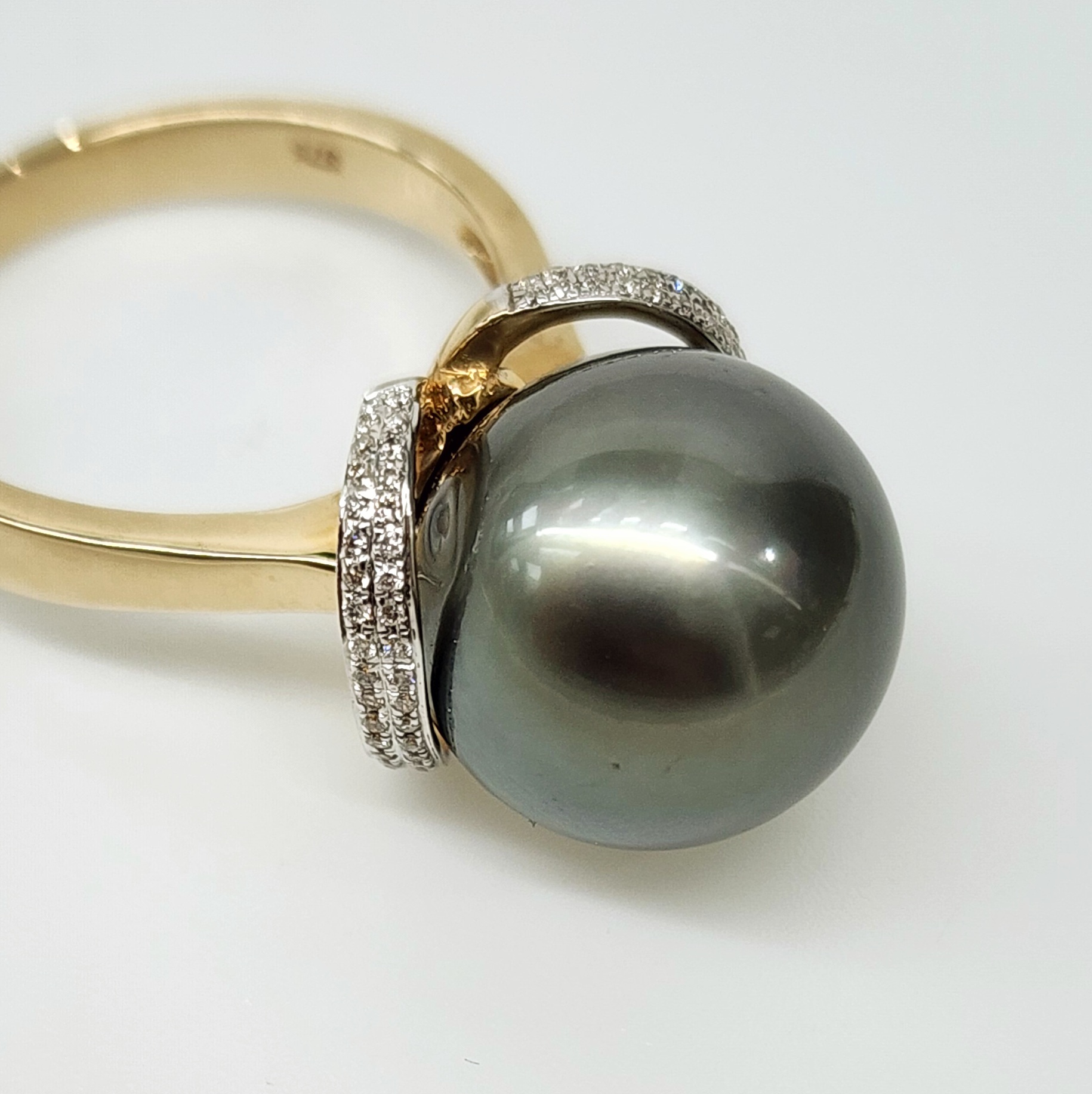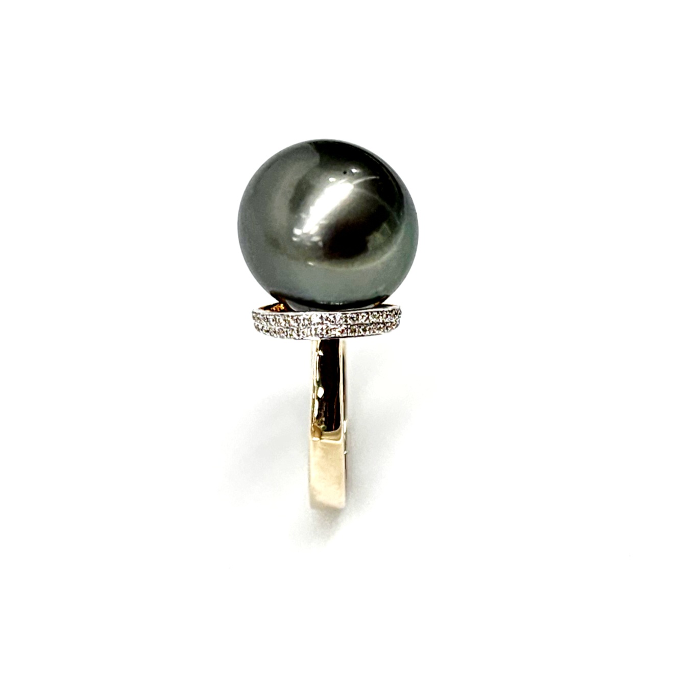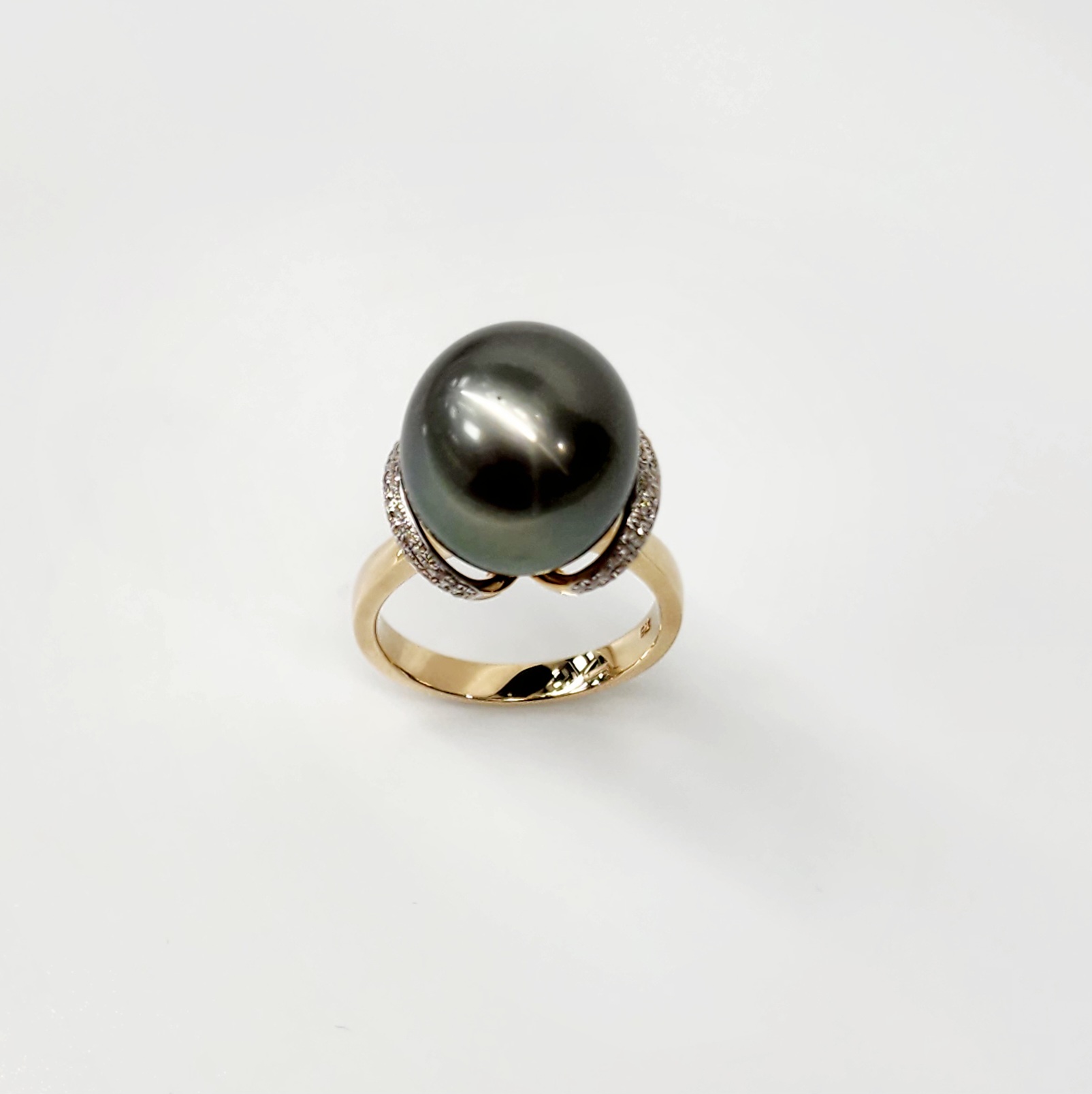 - The combination of the dramatic Tahitian black pearl, the ribbon-like diamond accents, and the rich yellow gold band creates a stunning piece of jewelry. The design blends classic and contemporary elements, making it a timeless addition to any jewelry collection. It’s perfect for adding a touch of elegance and sophistication to any outfit, from casual to formal.