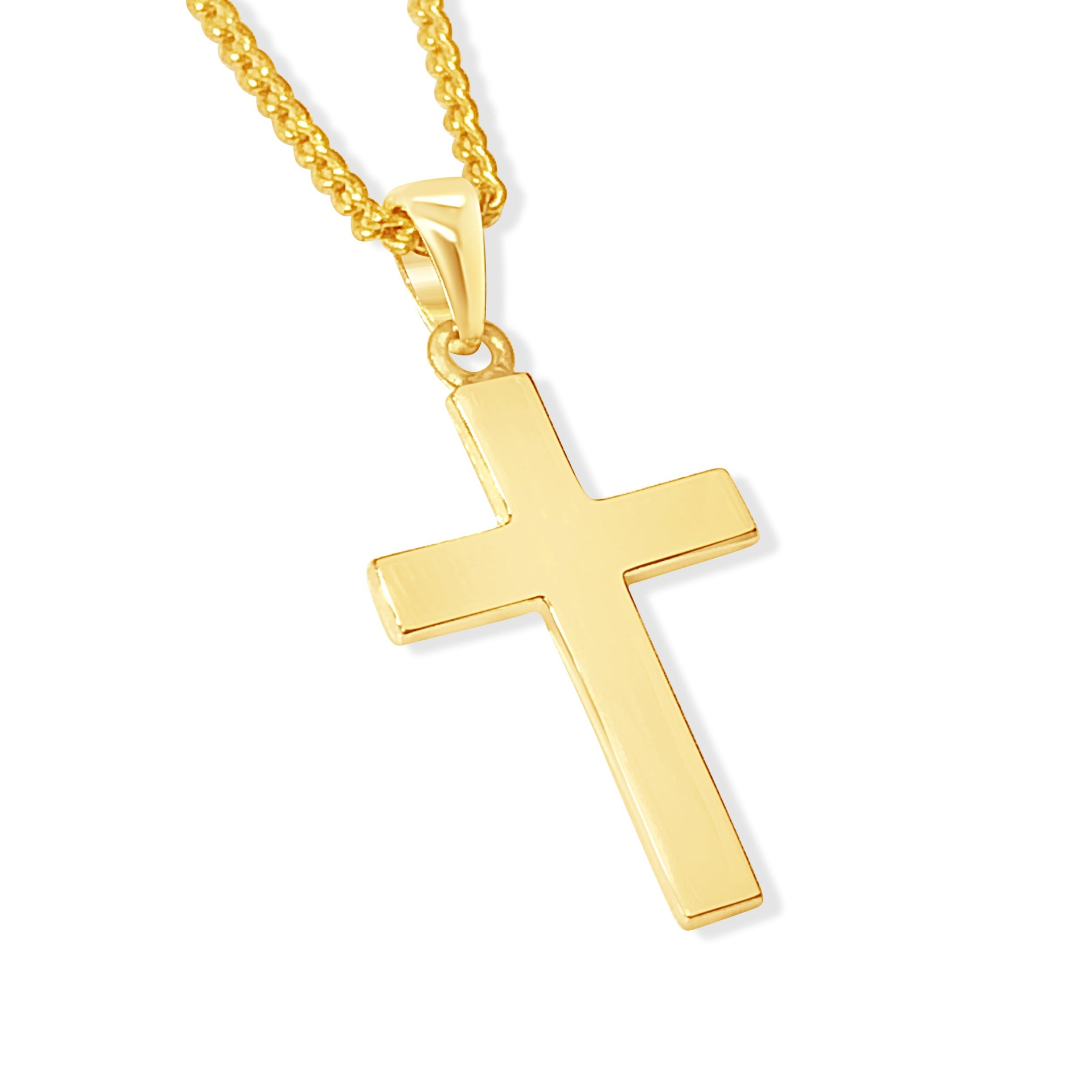 A stunning 9ct yellow gold cross pendant, featuring a timeless design with a 19mm size, perfect for adding a touch of elegance to any outfit.