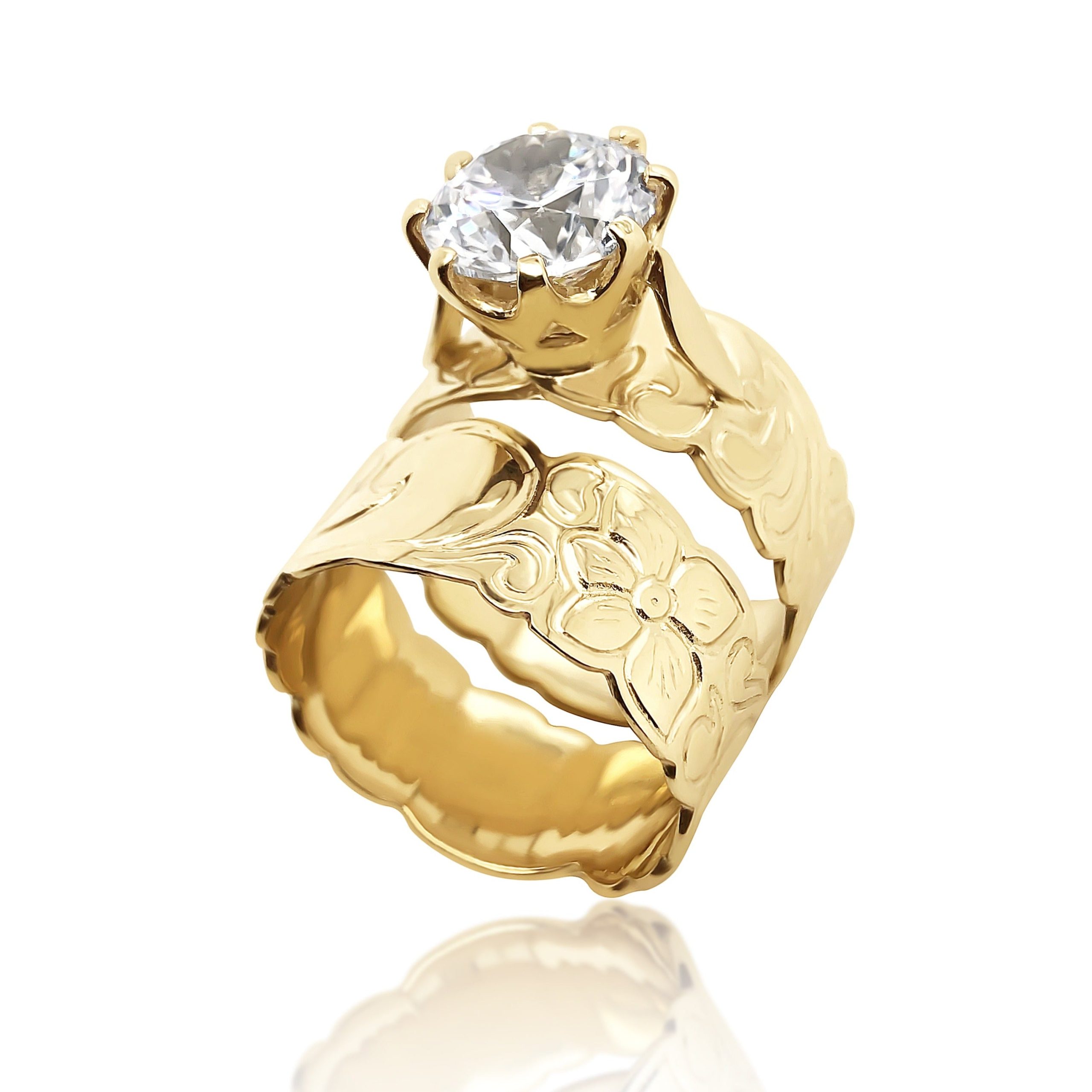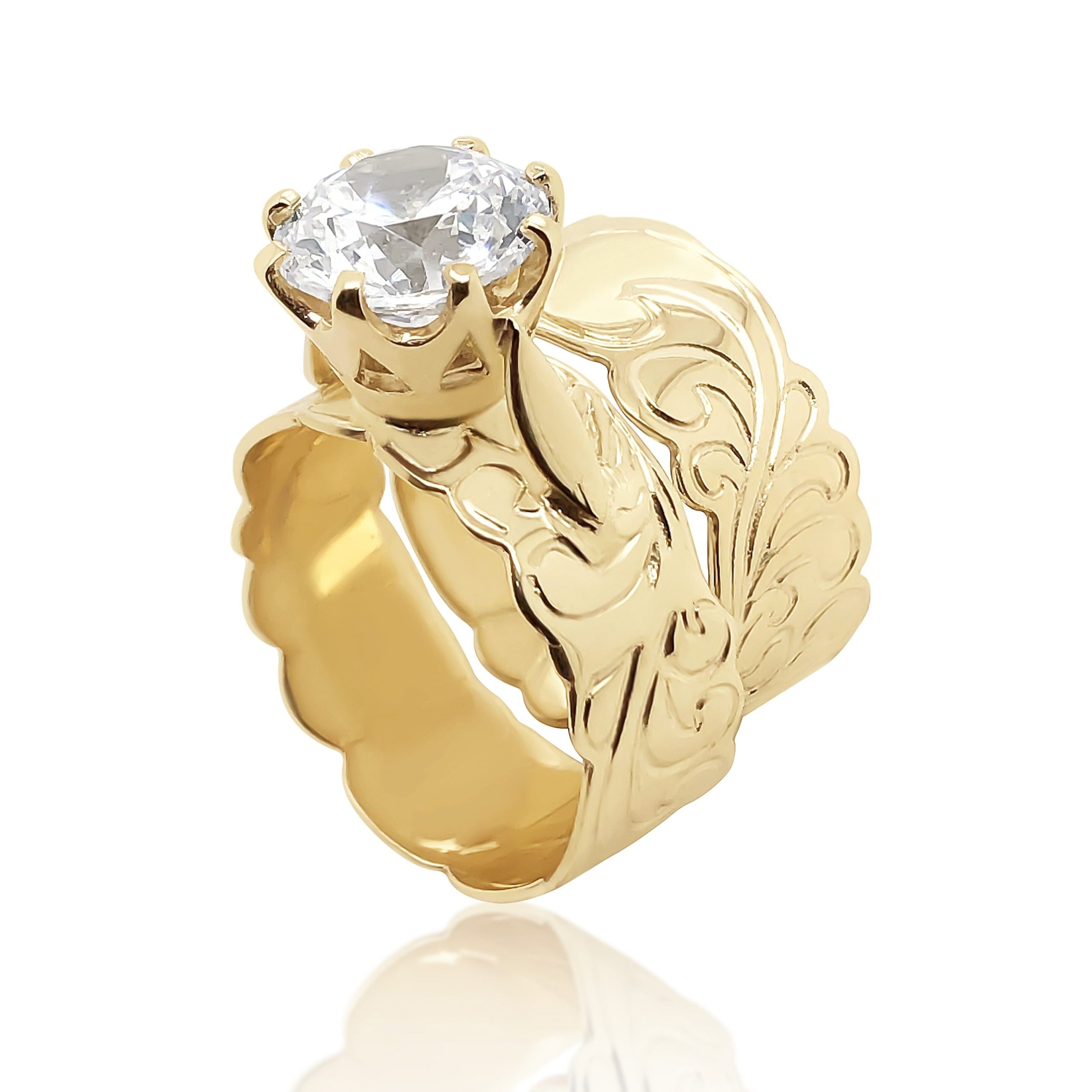 9ct Yellow Gold 2 Piece Hawaiian Cutout Design Ring 10mm Wide With 11mm Cubic Zirconia