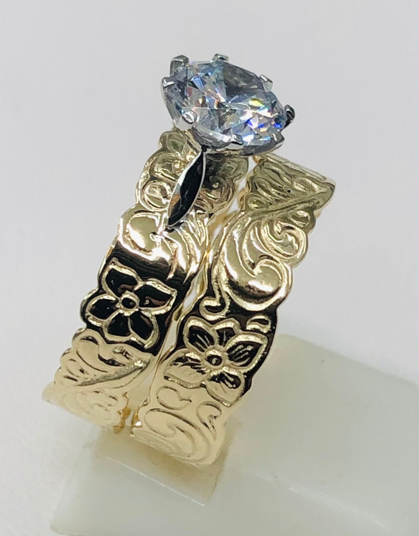Both bands are 5mm wide with one having a round 7.50mm CZ setting