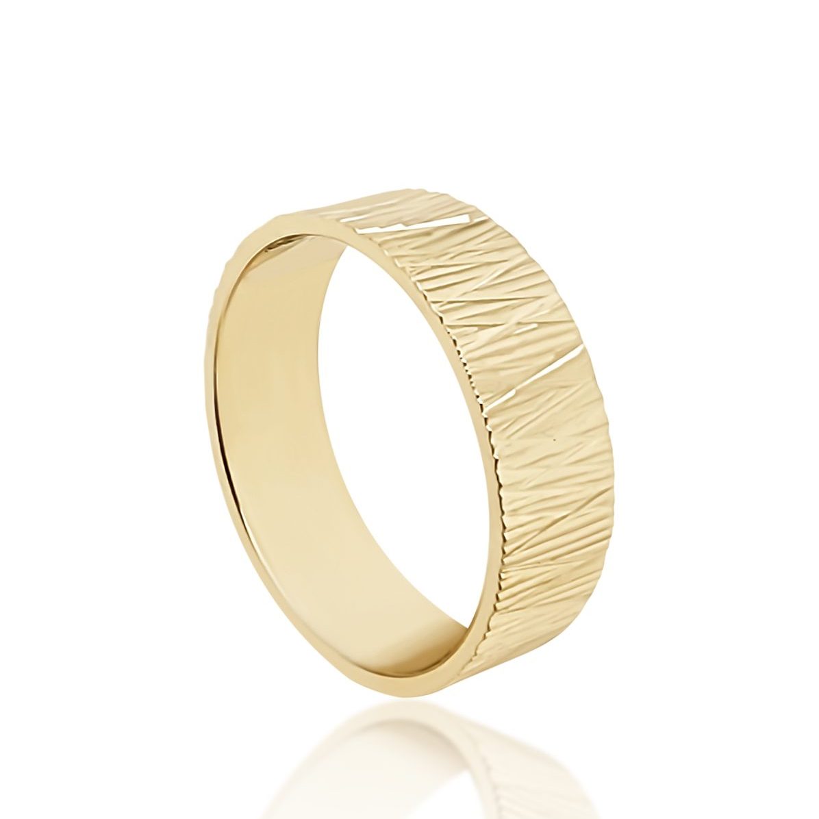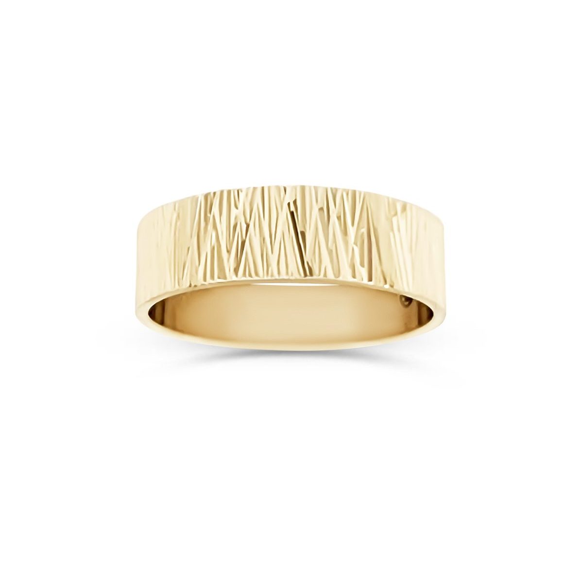 9ct Yellow Gold 6mm Wide Faceted Wedding Ring with Diamond Cut Bark Cross Finish
