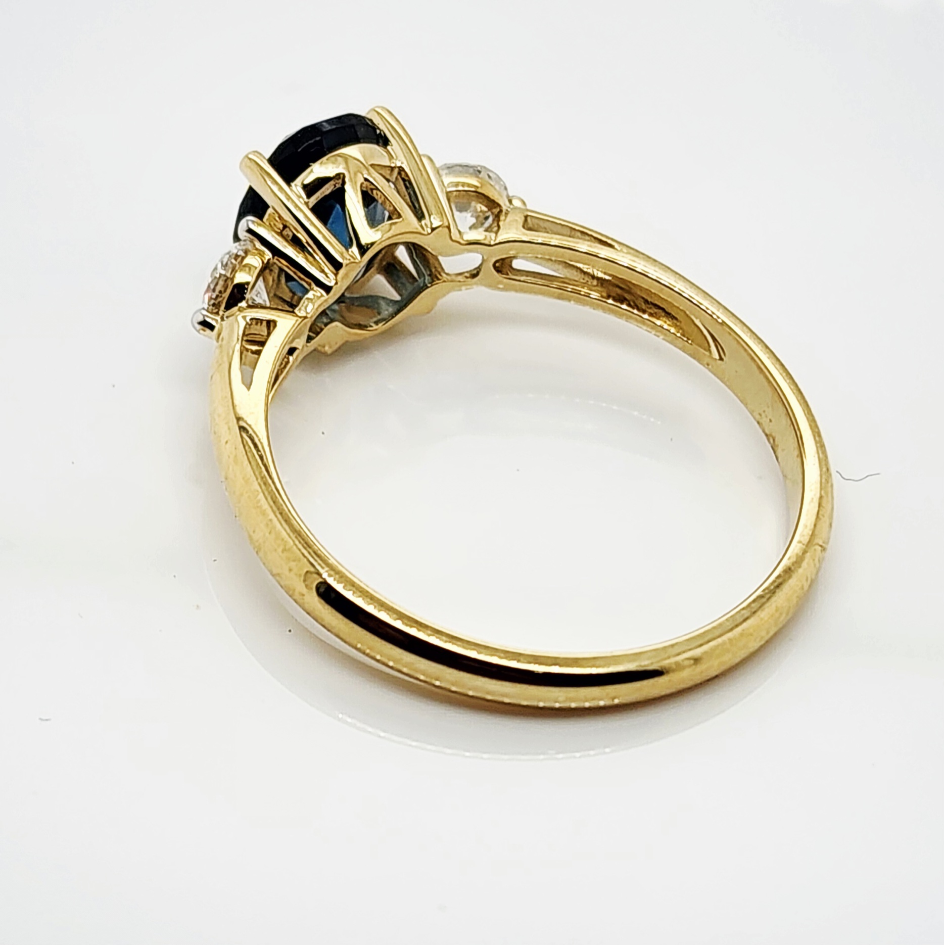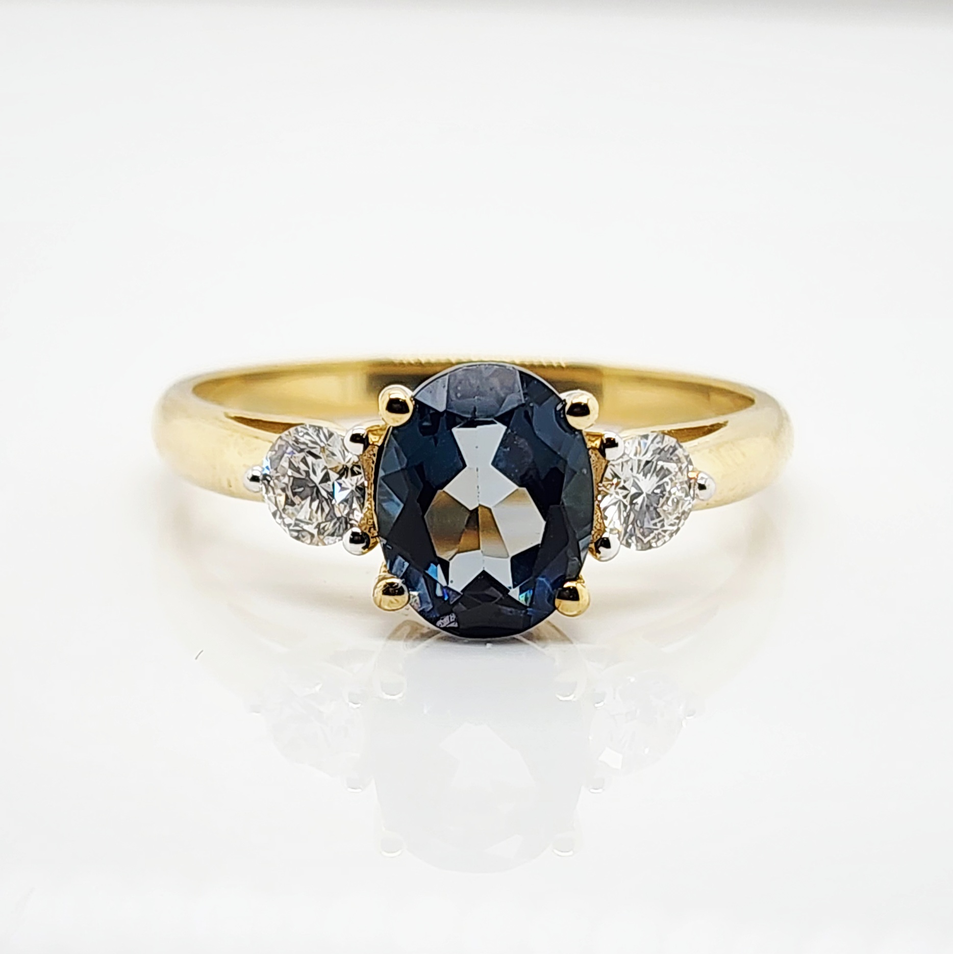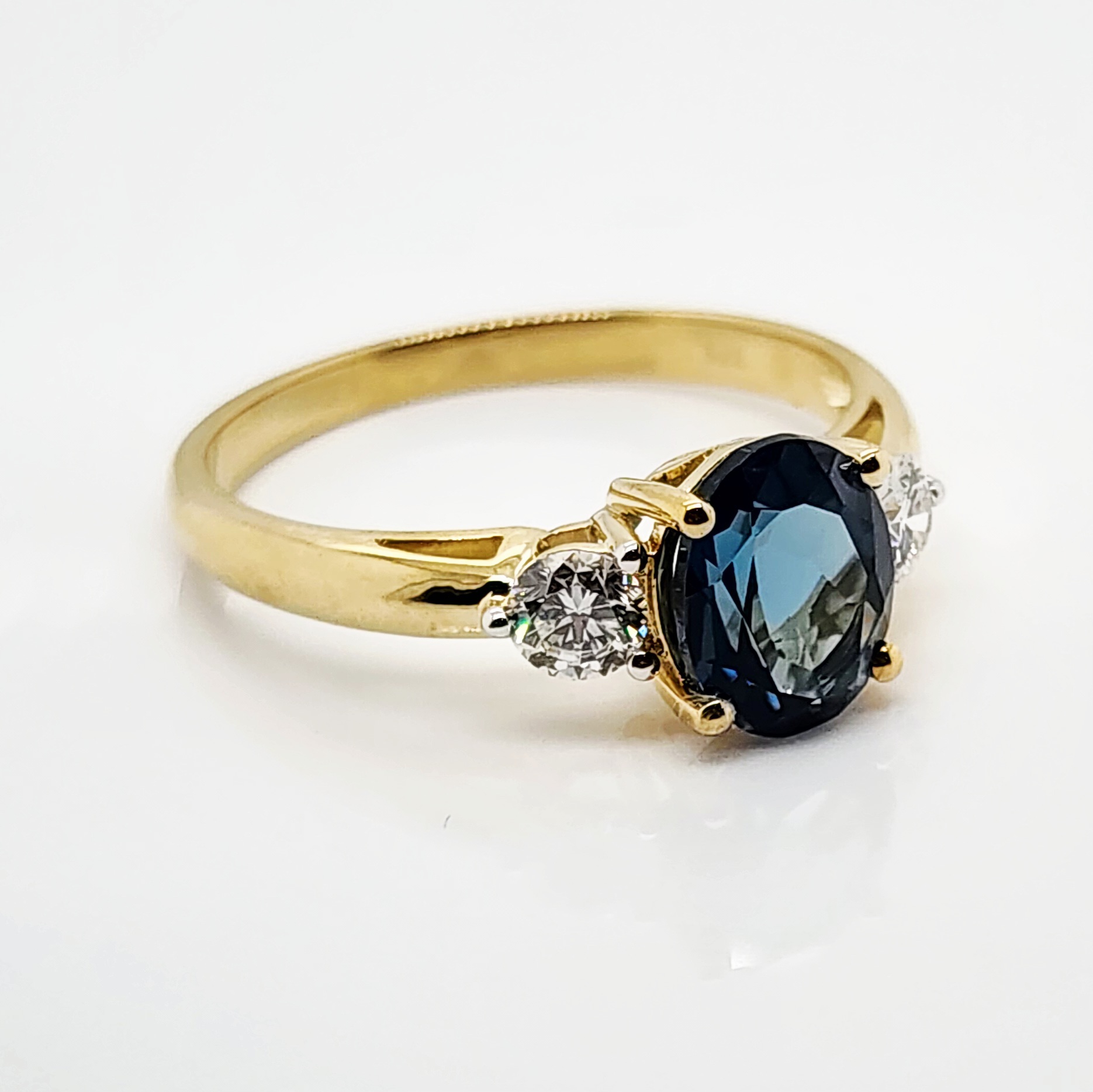 Flanking the centre stone are two lab-grown round diamonds with a combined weight of 0.50 carats. These diamonds are of exceptional quality, graded D–E colour and VS1 clarity, ensuring superior sparkle and fire. Each diamond is set in a refined three-claw mount, complementing the topaz beautifully while adding balance and sophistication.