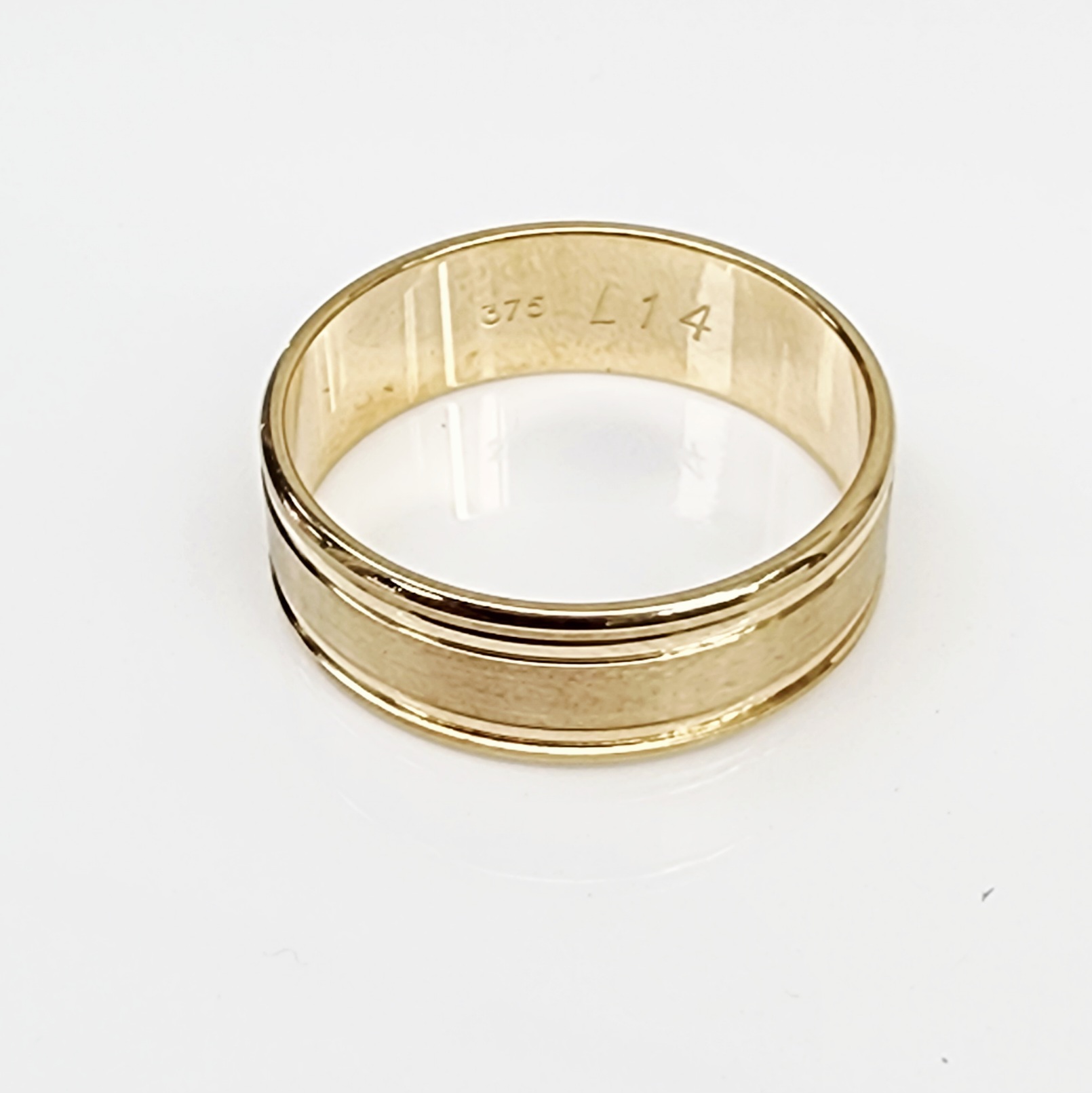 This timeless 9ct yellow gold wedding band features a bold 7mm wide profile with sleek double groove detailing that adds a refined and modern edge. The combination of a satin-finished centre and high-polished edges enhances its elegant contrast and visual depth.