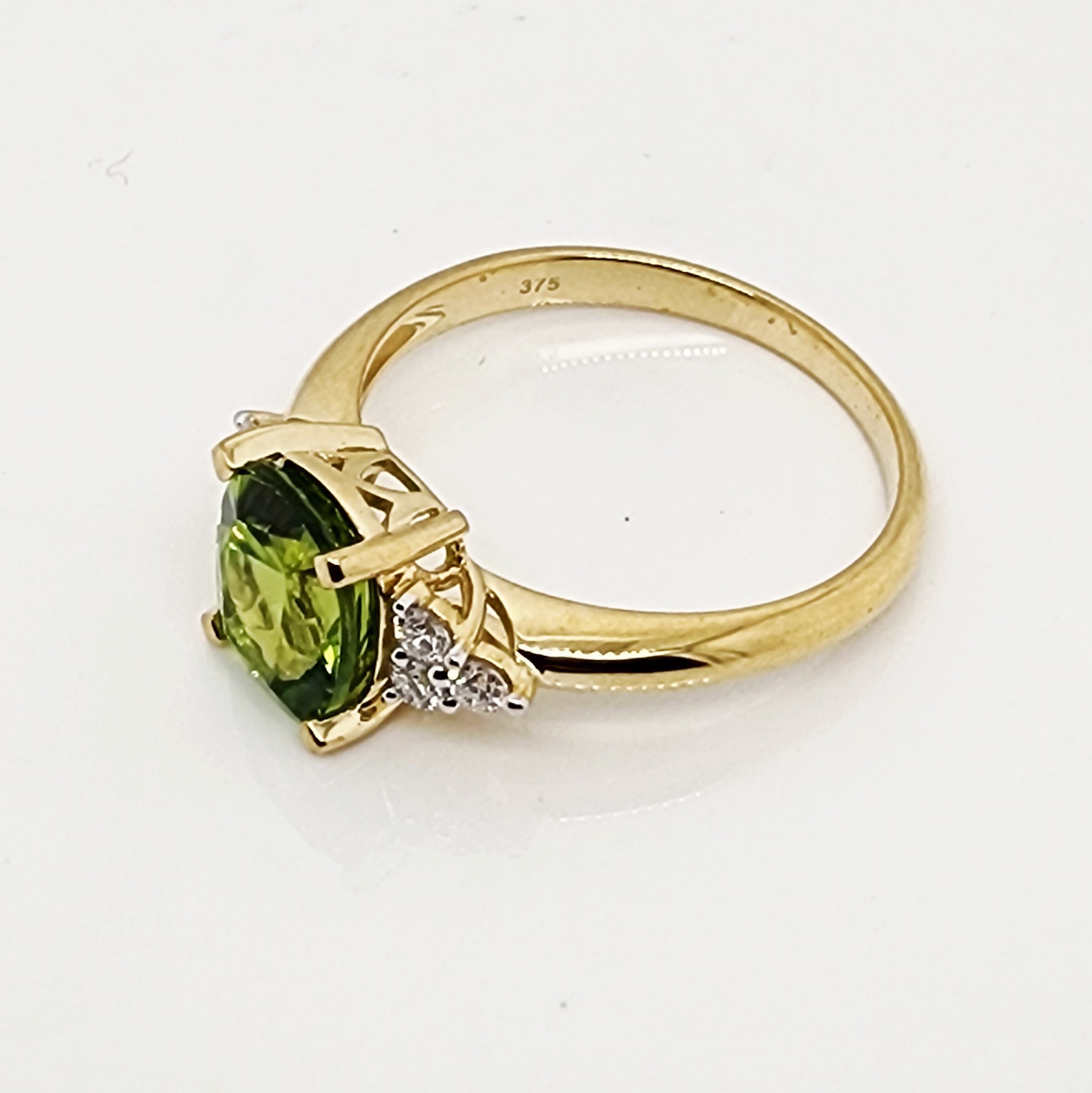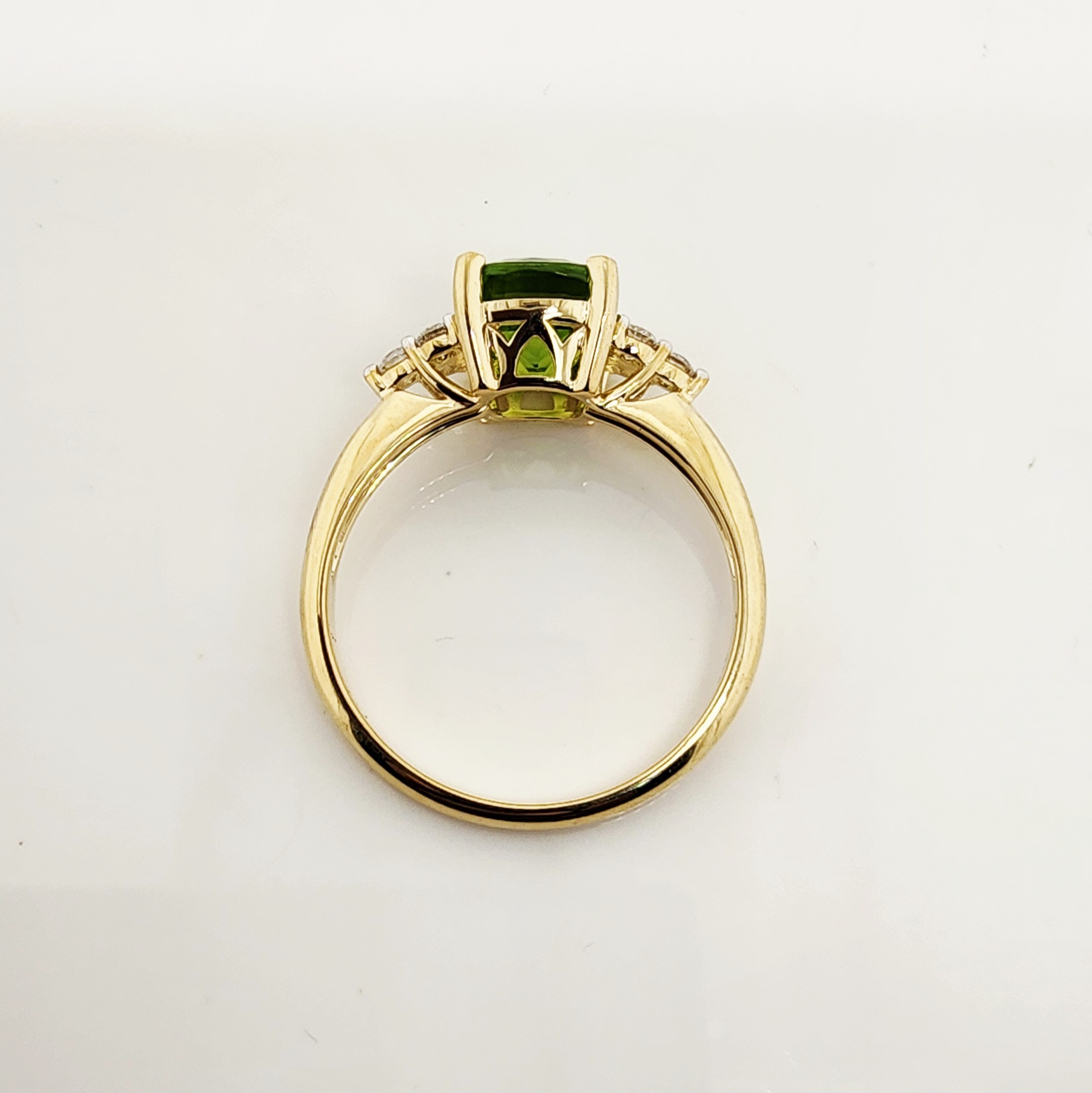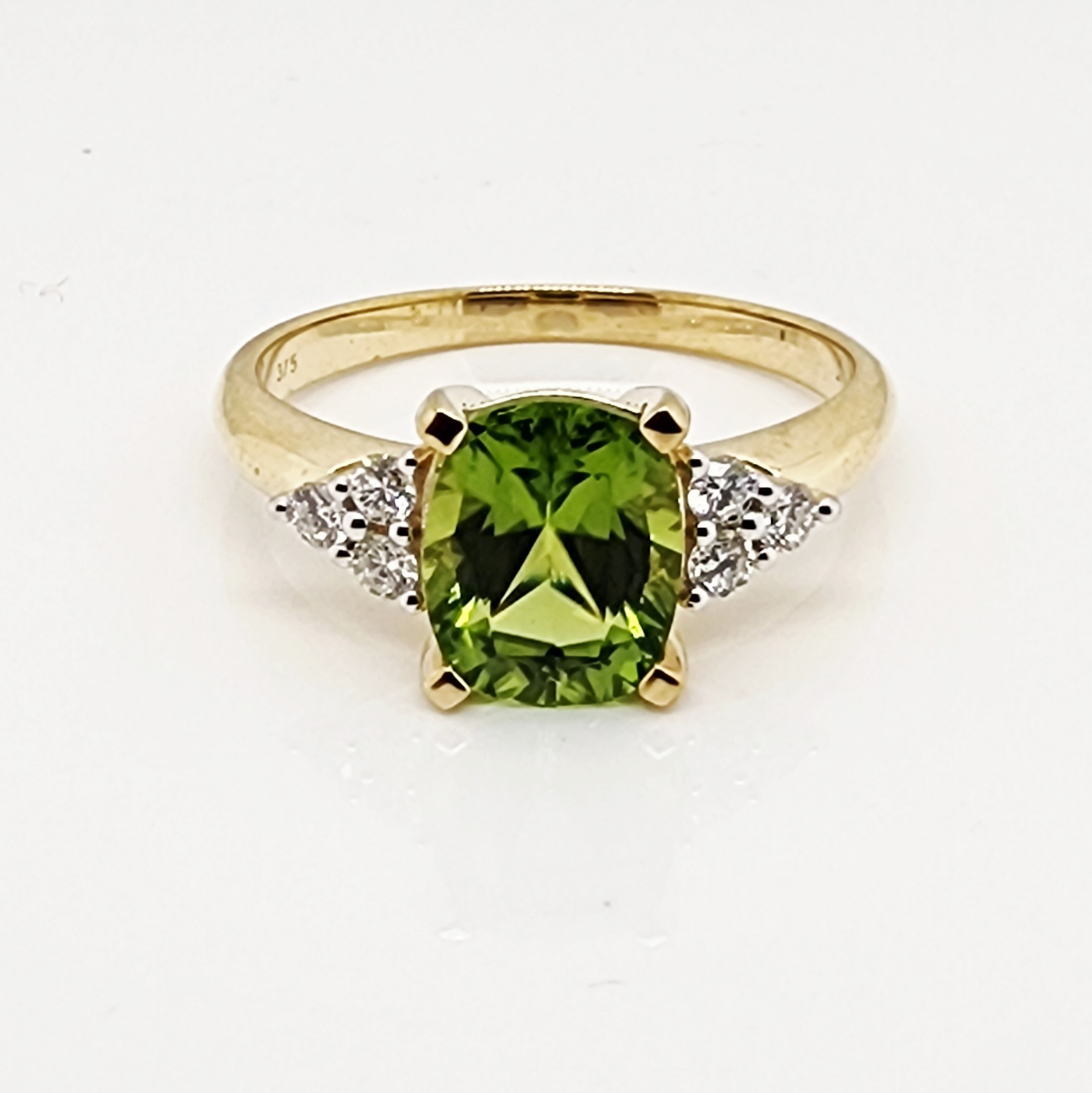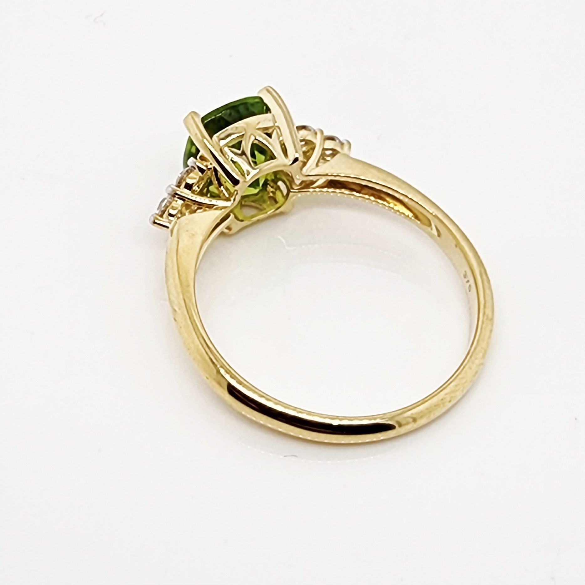 Flanking the centre stone are sparkling accents of lab-grown round brilliant-cut diamonds, arranged in elegant trios on each side of the Peridot. Together, these diamonds provide a total weight of 0.25 carat. With a superior grading of D–E colour and VS1 clarity, they deliver outstanding brilliance and fire, perfectly complementing the lush green tones of the Peridot. Each diamond is individually set in a refined three-claw setting, balancing security with delicate craftsmanship.
