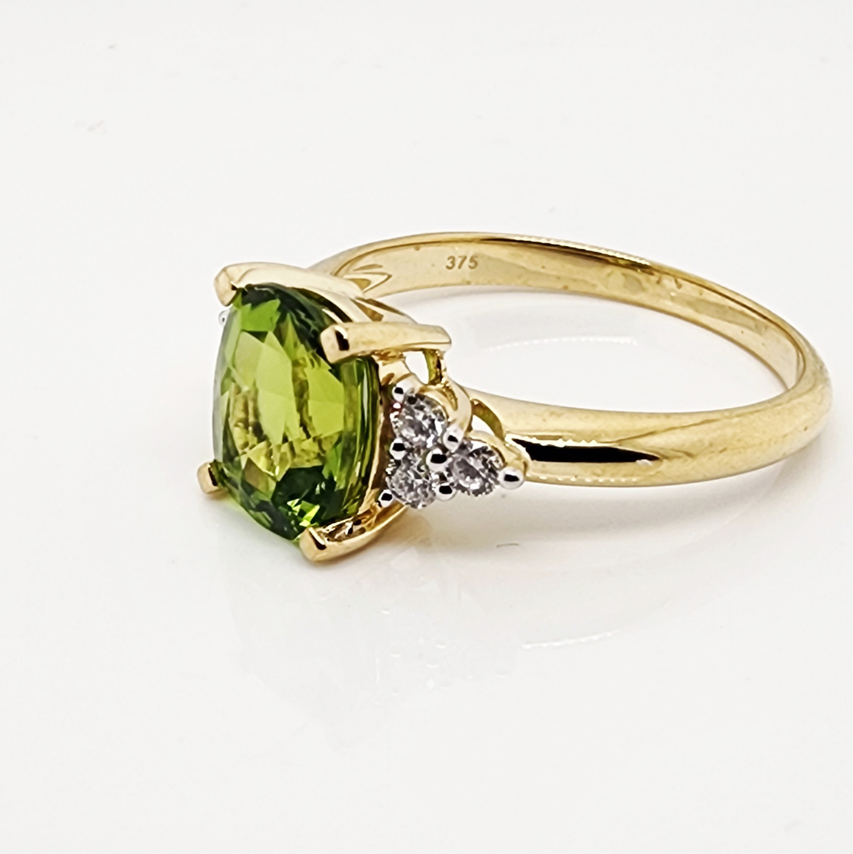This stunning 9ct yellow gold ring showcases a vibrant 8mm x 10mm cushion-cut Peridot, admired for its fresh green colour and elegant shape. The Peridot is set securely in a four-claw setting, allowing its facets to shine with brilliance while remaining the eye-catching centrepiece.