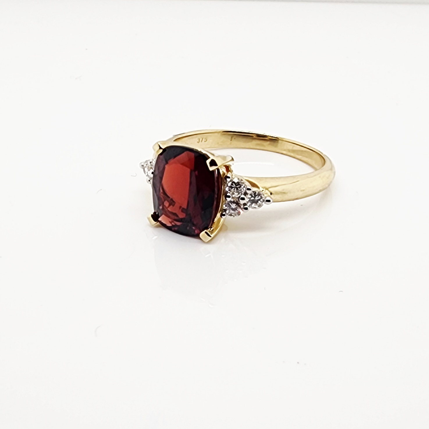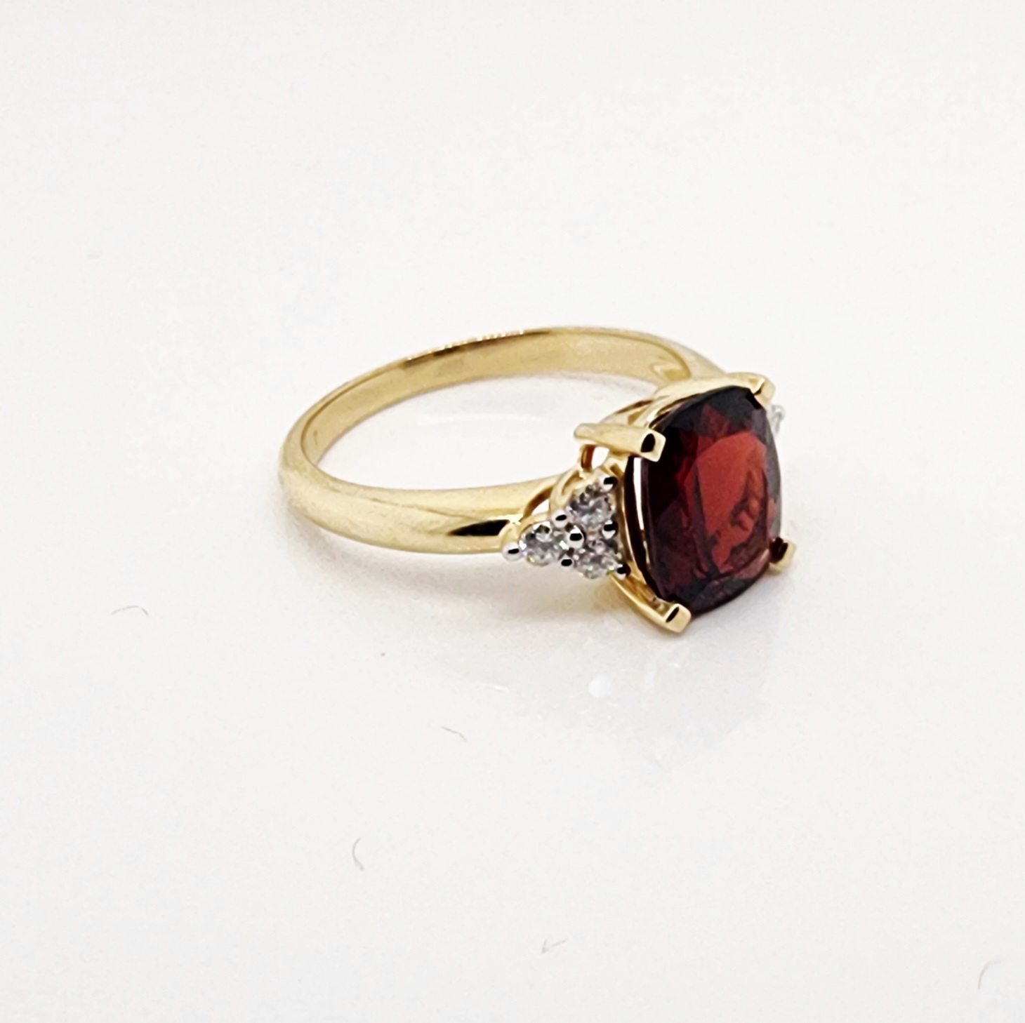This sophisticated 9ct yellow gold ring showcases a bold 8mm x 10mm cushion-cut garnet, admired for its deep red tones and timeless elegance. The garnet is securely set in a four-claw setting, allowing its rich colour and brilliance to shine through while remaining well protected.