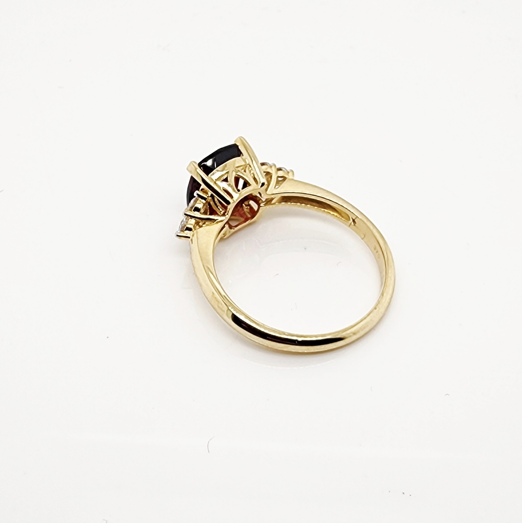 A statement of refined style, this ring combines the warmth of yellow gold, the passion of garnet, and the sparkle of diamonds. It is an ideal choice as a meaningful gift, a unique engagement ring, or a striking addition to any fine jewellery collection.