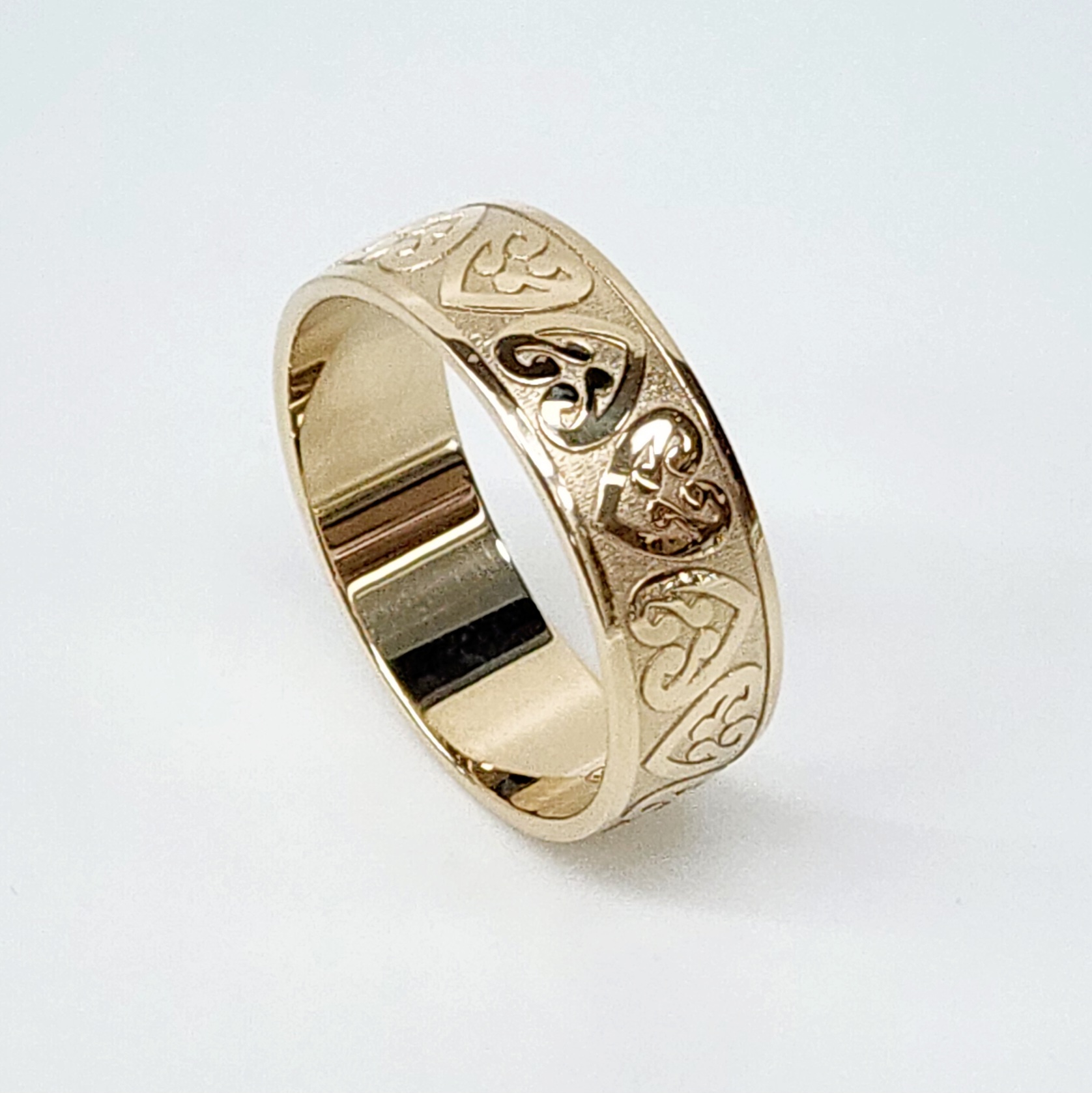 This ring would blend the elegance of gold with a meaningful design, making it suitable as a wedding band or a special dress ring.